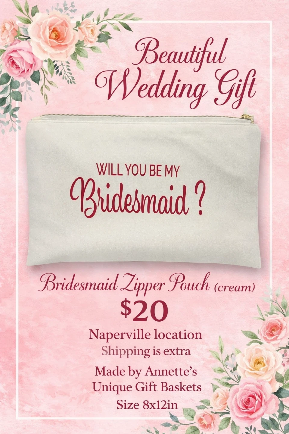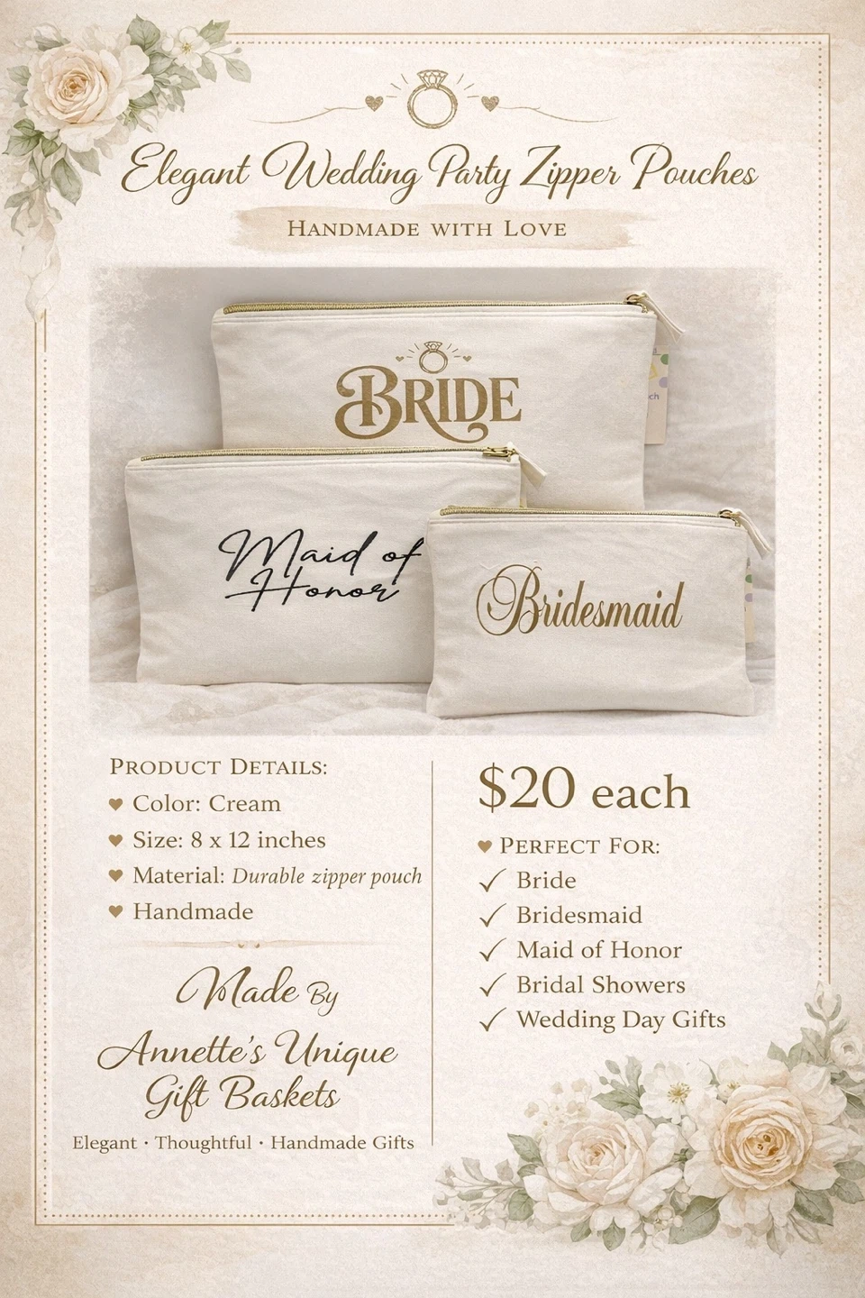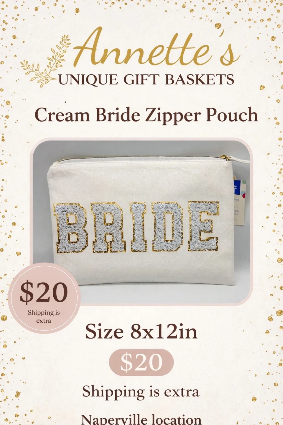 Buy & SellAnnette's Unique Gift Baskets Bride Zipper Pouch Cream 8x12inAnnette's Unique Gift Baskets Bride Zipper Pouch Cream 8x12in$20Cream colored durable zipper pouch. Size is 8x12 inches. This pouch is handmade and perfect for brides, bridesmaids, or wedding day gifts!ConditionNewWHERE TO MEETLeasing officeView MapSELLERverifiedAnnetteBristol Station650 reviews0 chats·0 favorites·1 viewsSEND CHAT TO SELLERHi Annette! I’m interested in your listing.Hi Annette! I’m interested in your listing.Get the Karrot app to chatSign In to chat