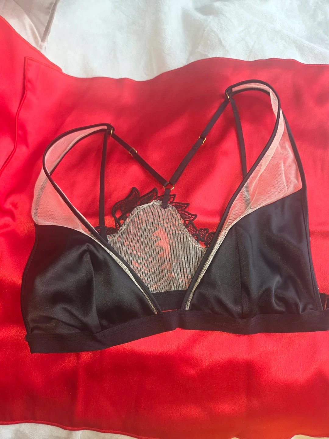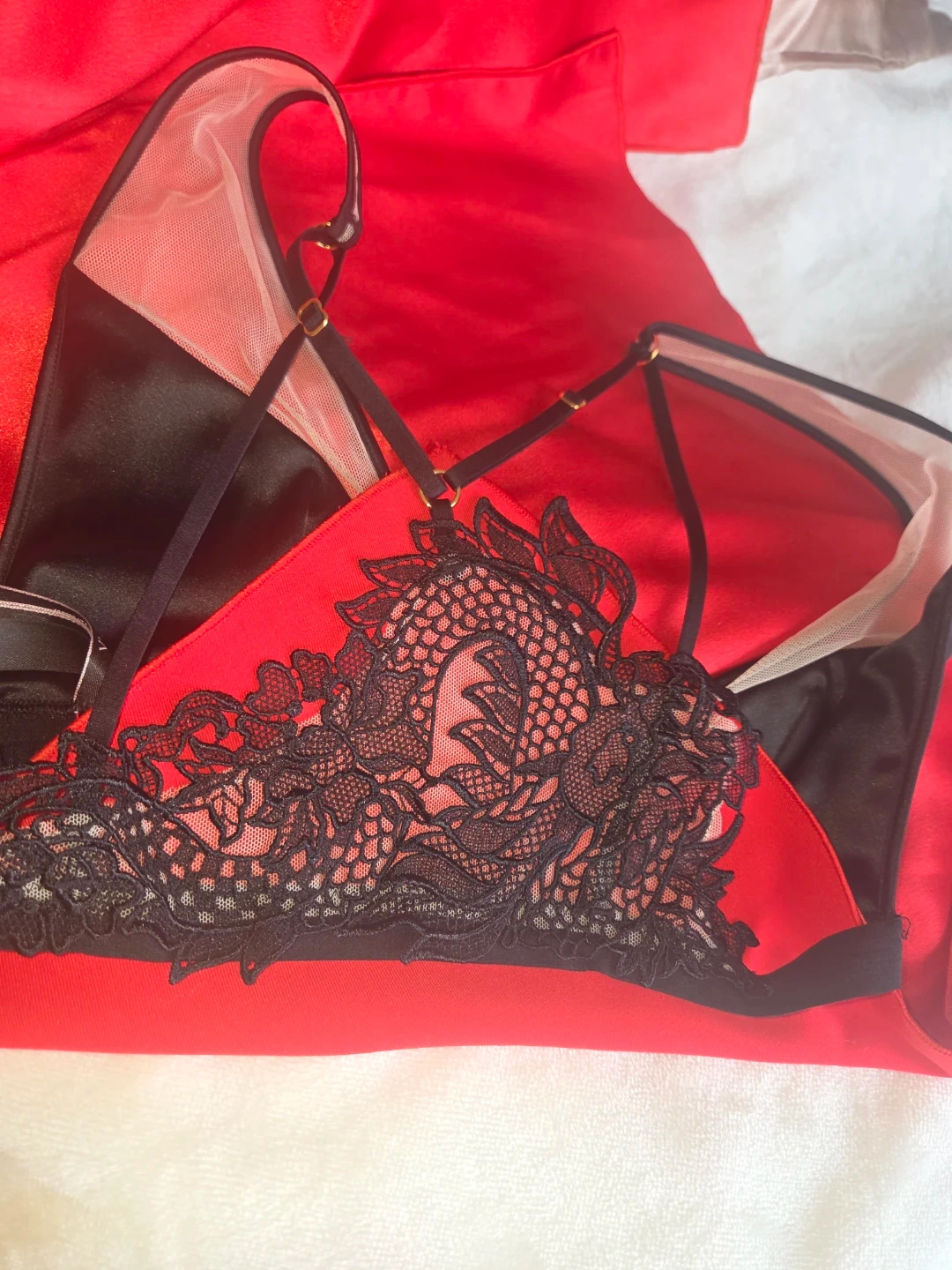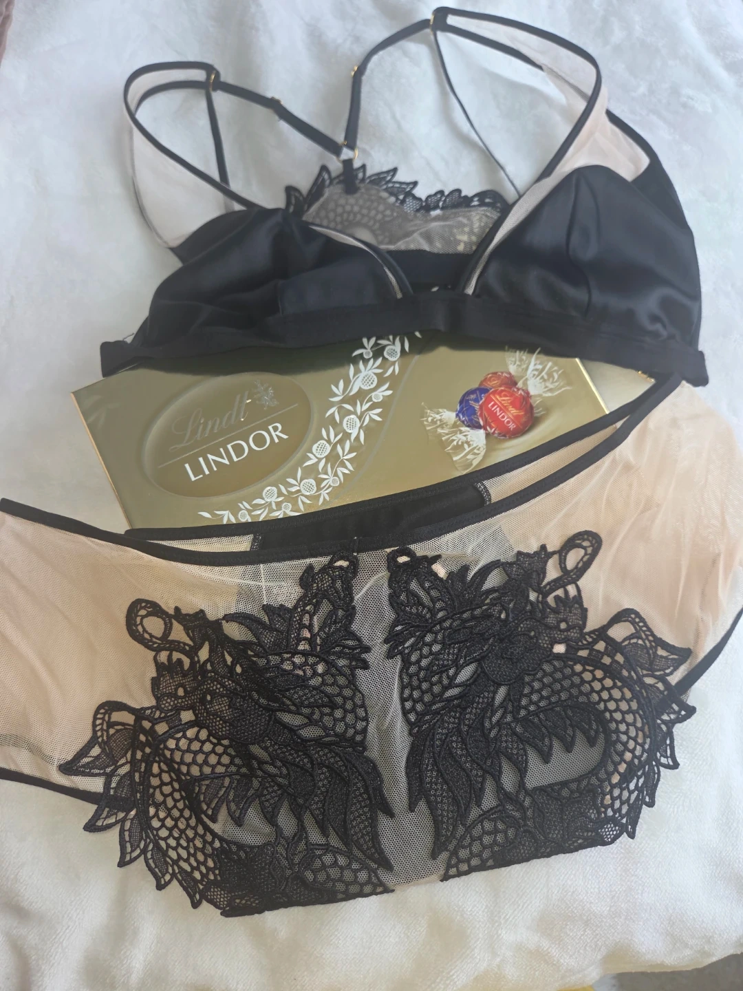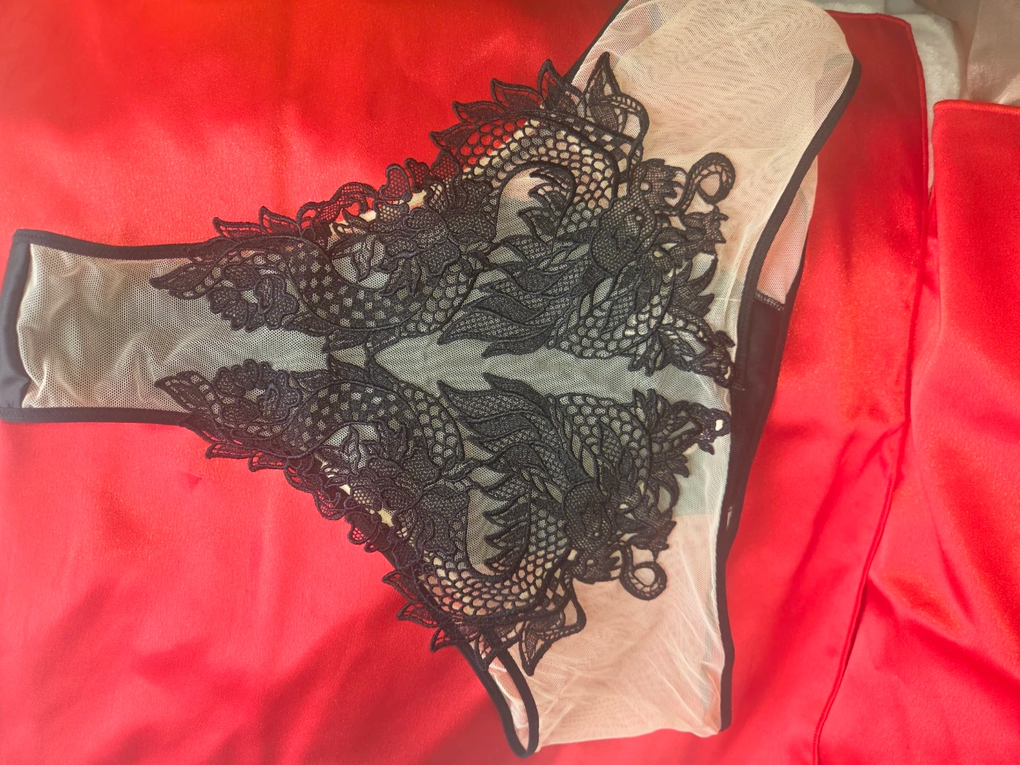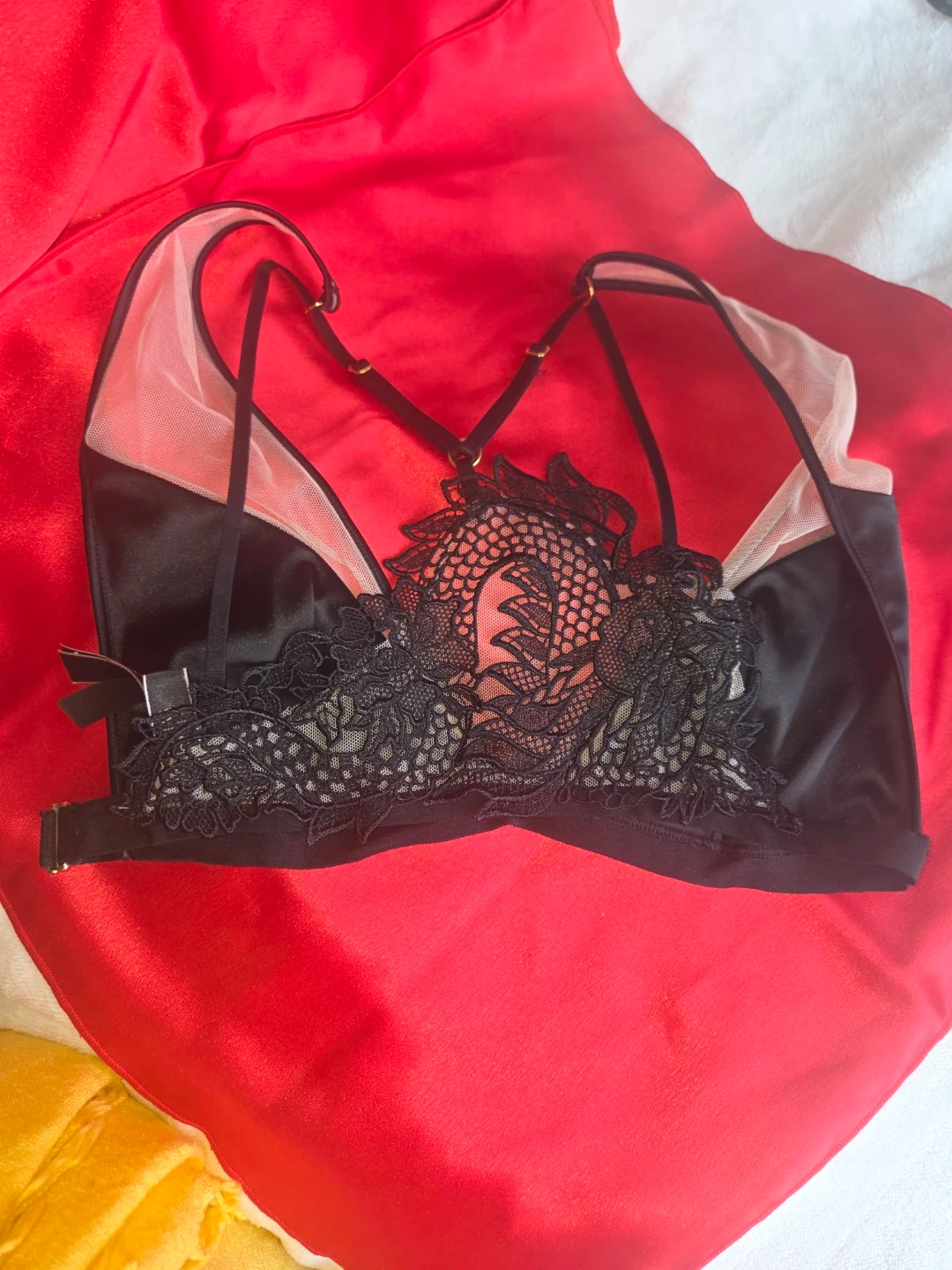 Beautifully detailed lace bralette and matching high-waisted panties. Features intricate dragon-inspired embroidery over sheer mesh panels and black fabric. Strappy details add an elegant touch. It's a stunning addition to any intimate wear collection!