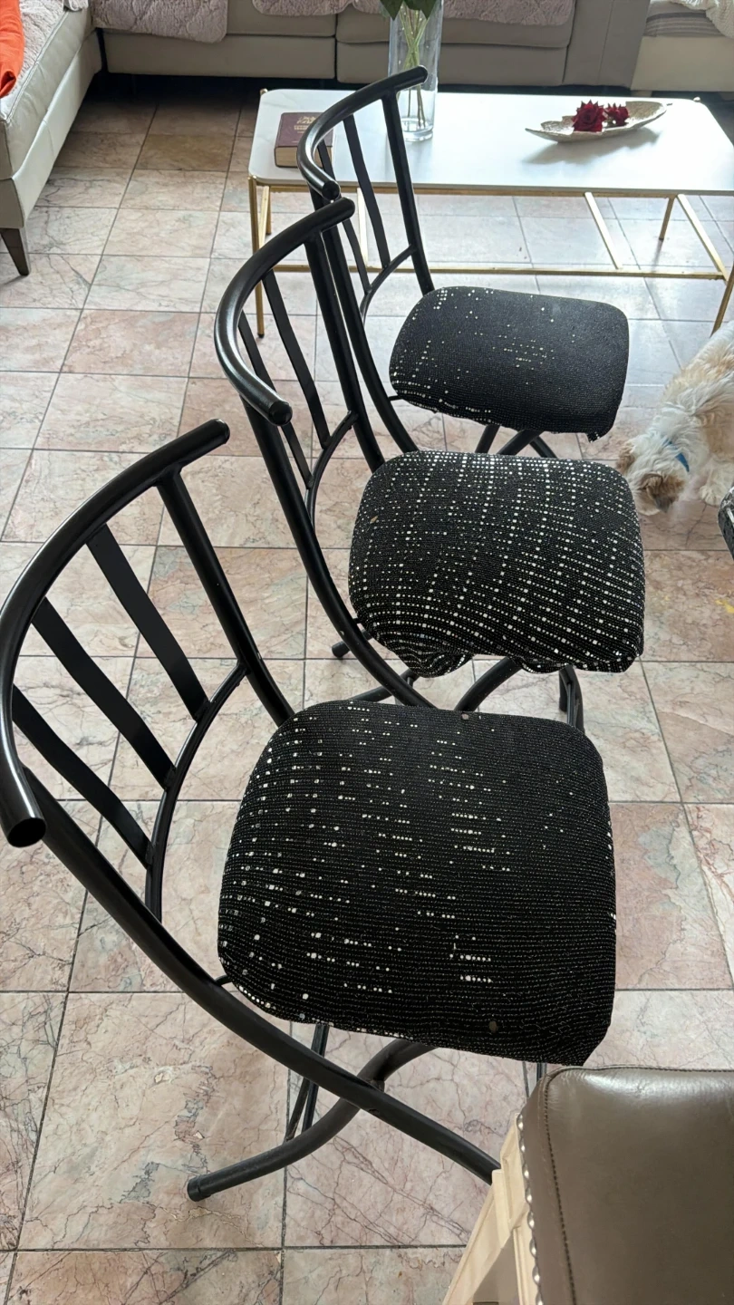 This listing includes three black metal chairs. Each chair features a black seat cushion with a white speckled pattern. The metal frames have a curved back design.