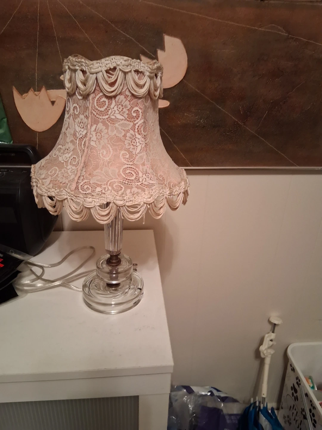 Charming vintage table lamp featuring a clear fluted glass base and a delicate pink lace lampshade. It's a lovely accent piece for any room. The lamp has a standard electrical cord and plug.