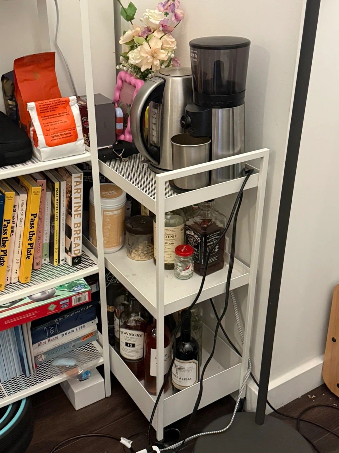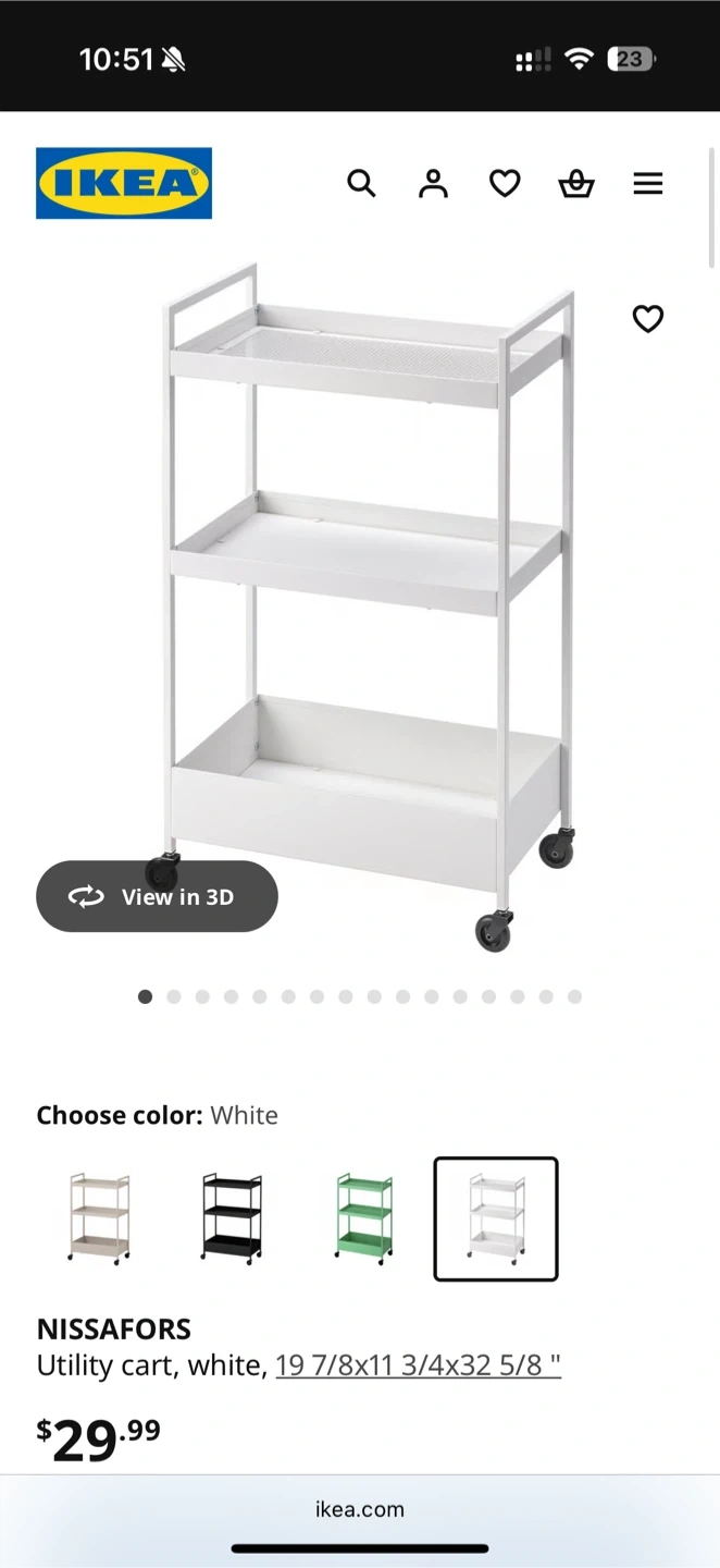 This is an IKEA Nissafor utility cart. It's white and has three shelves with wheels. Dimensions are 19 7/8 x 11 3/4 x 32 5/8 inches. It's a great cart for storage and organization!