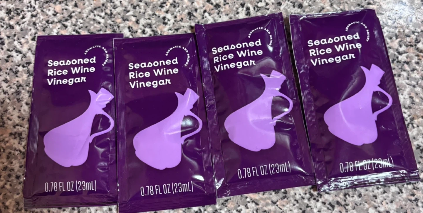 Four packets of seasoned rice wine vinegar. Each packet is 0.78 fl oz (23mL). Aromatic and bright seasoning. Got this from a Hello Fresh Meal Kit and forgot to use it. Maybe someone else can use it. Its Free.