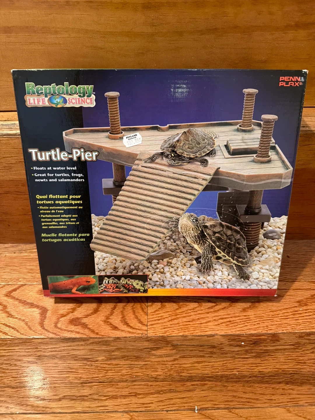 This Turtle-Pier floats at water level. It's great for turtles, frogs, newts, and salamanders. The item is new in box.