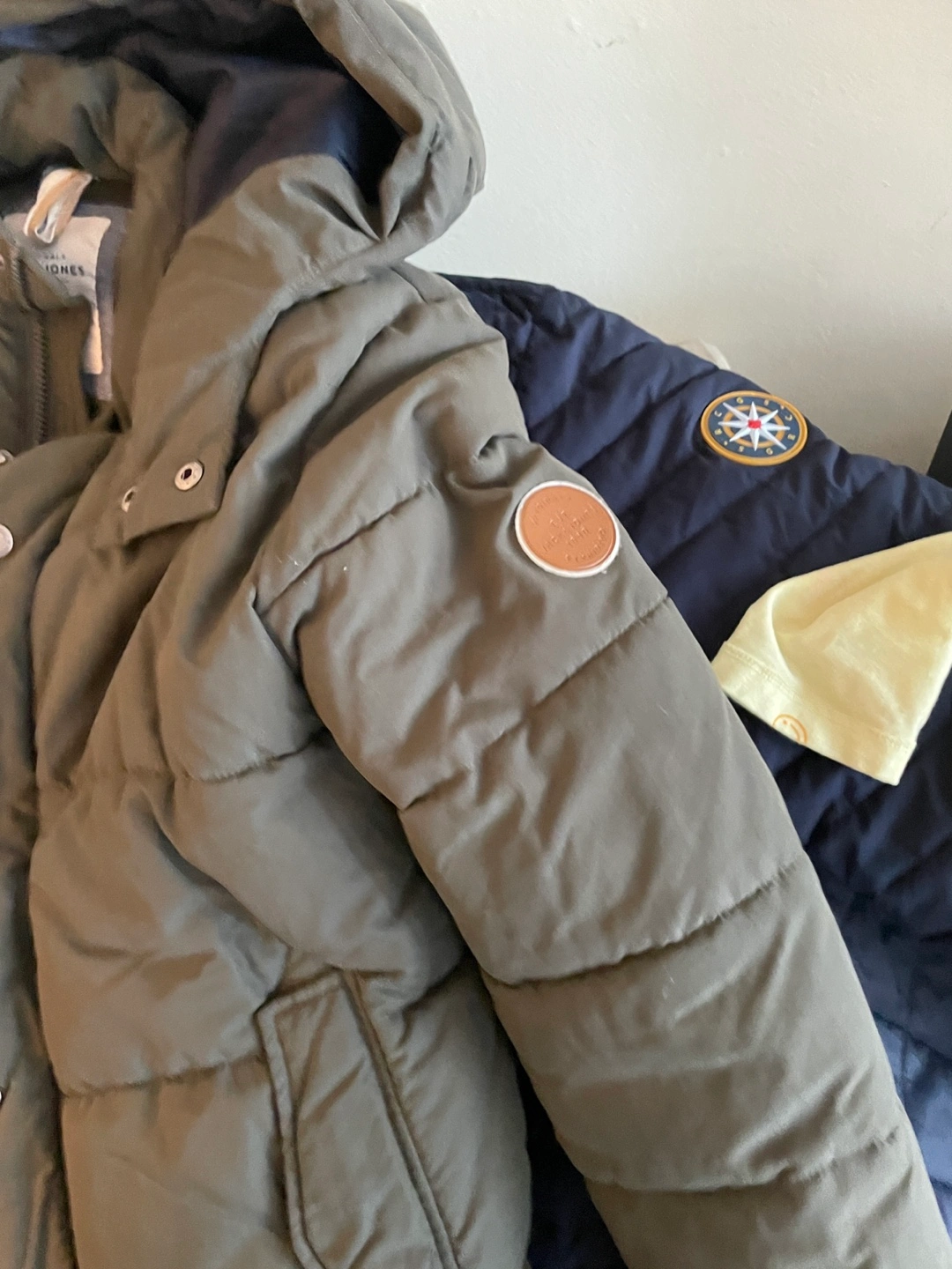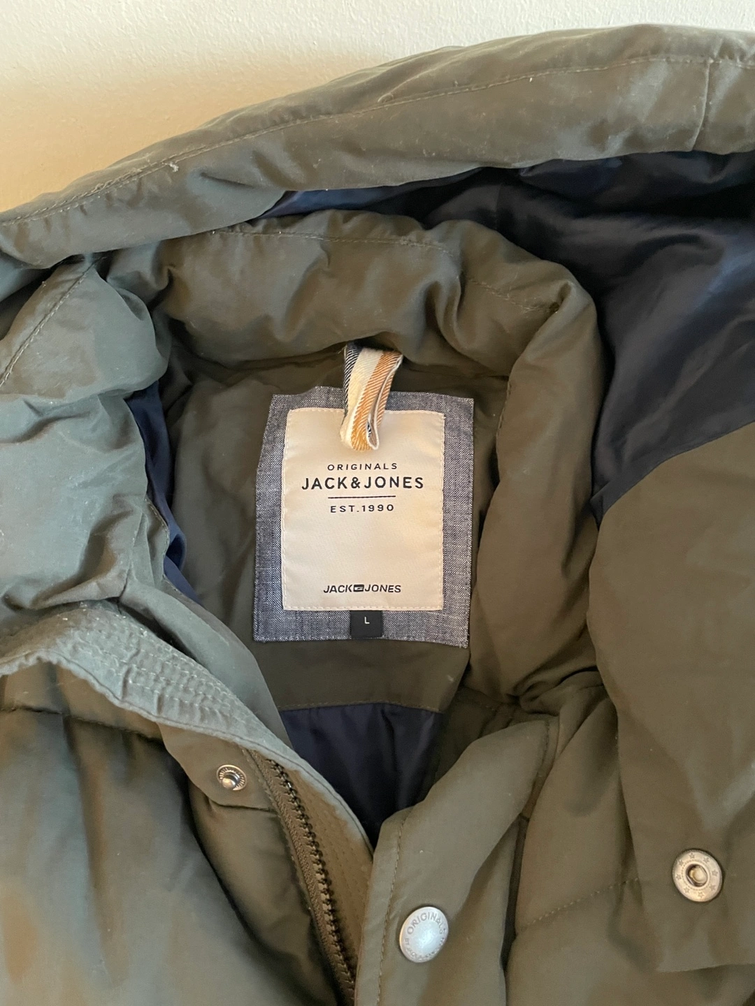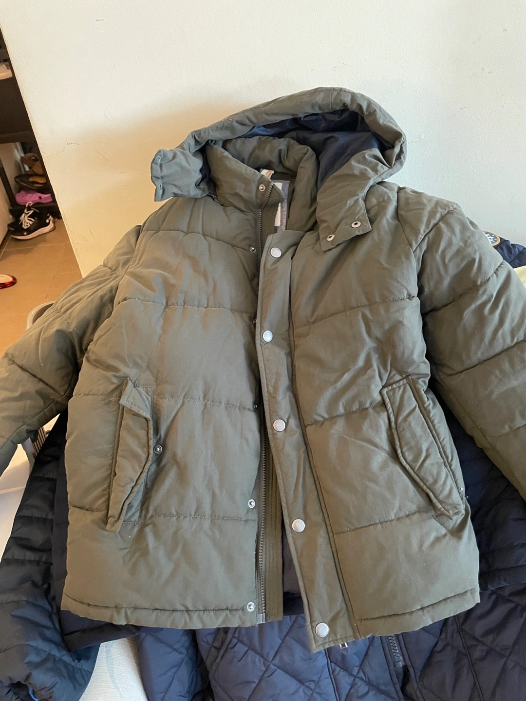 Great olive-green puffer jacket, perfect for those chilly days. It has a hood and pockets, as well as a zipper and snap closure. This jacket will provide warmth and comfort on your next outdoor adventure.