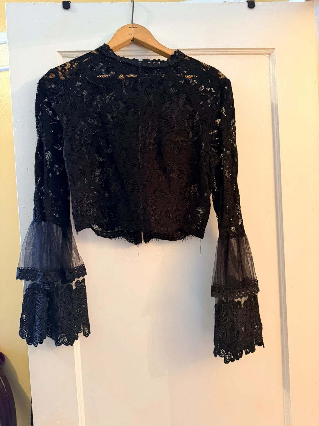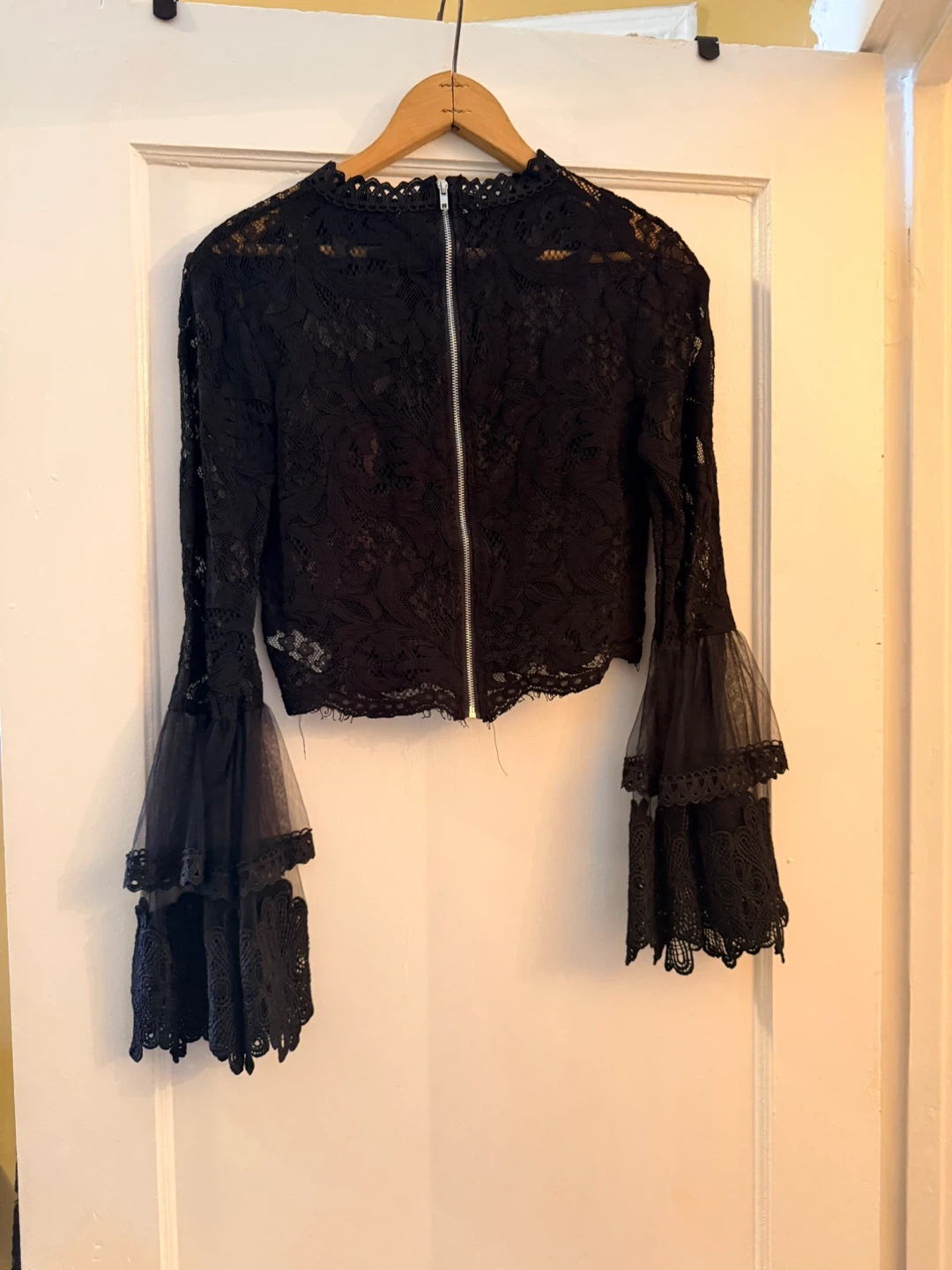 This black lace crop top features dramatic tiered bell sleeves. It's made of a delicate lace fabric with a zipper closure in the back. Size is S.