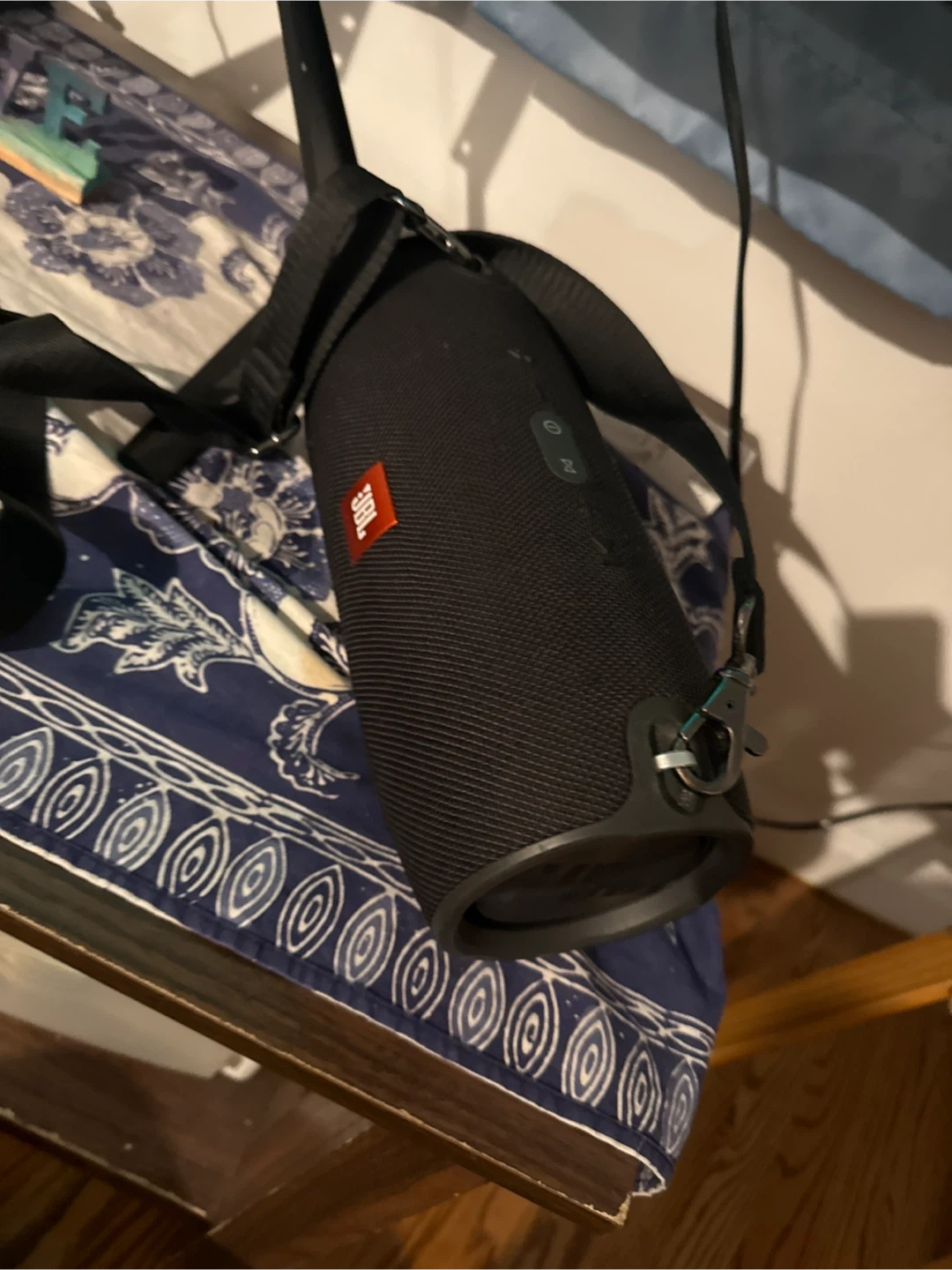 Black portable JBL speaker with a strap. It's a cylindrical speaker with a fabric exterior and a prominent orange JBL logo. This speaker is designed for easy transport.
