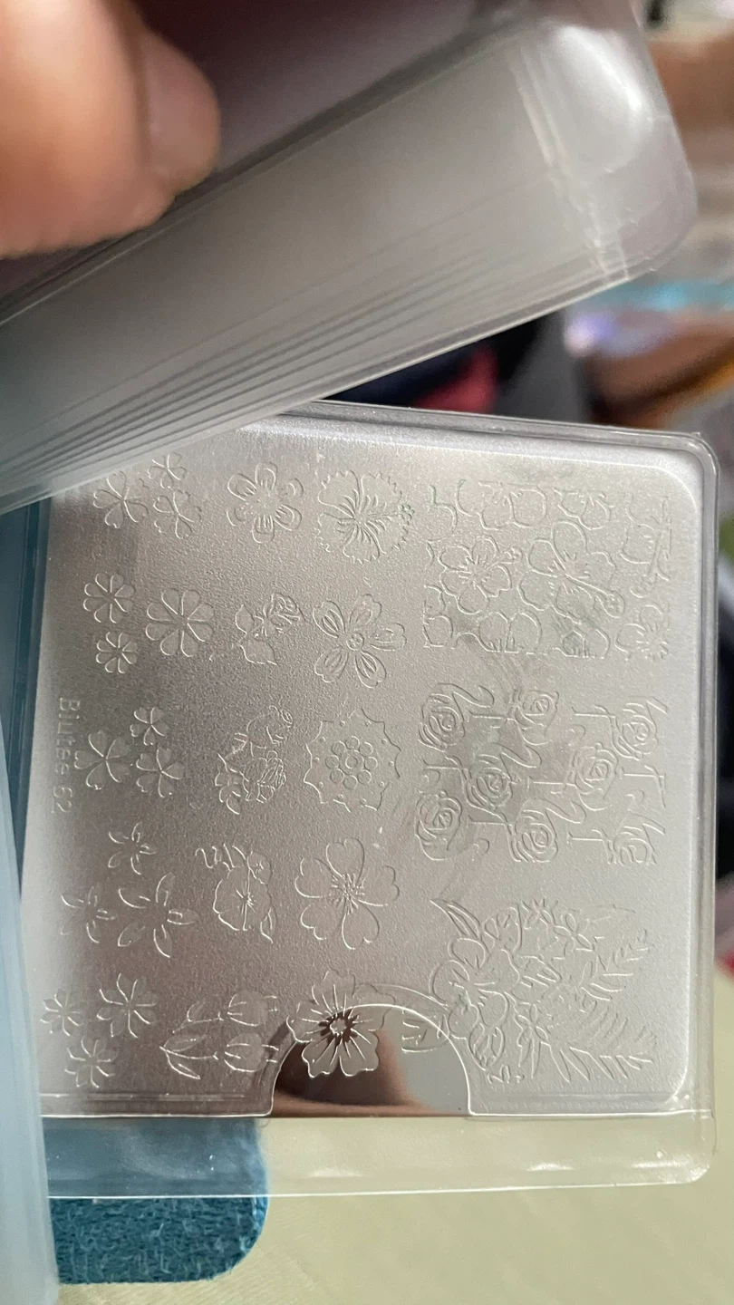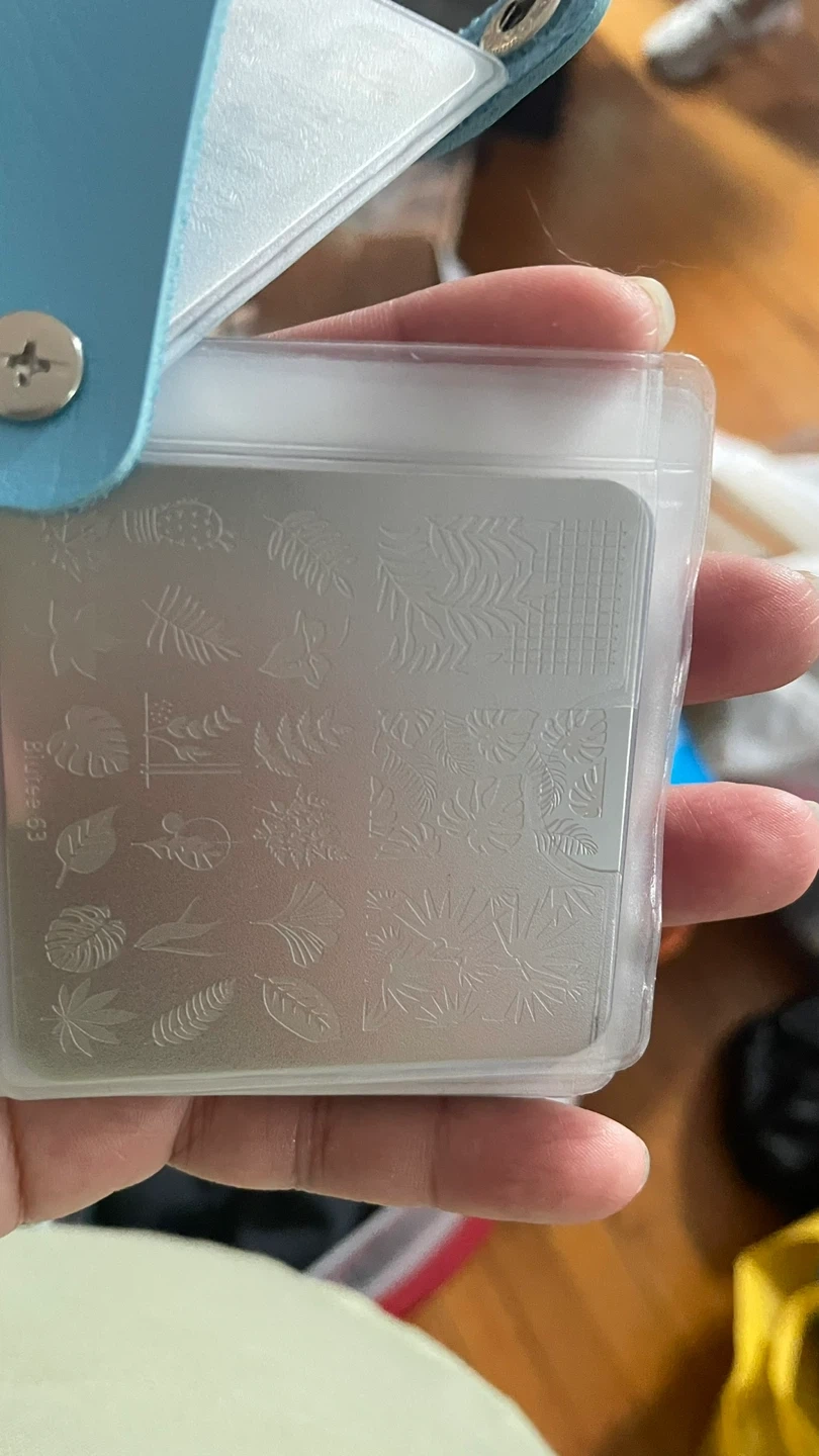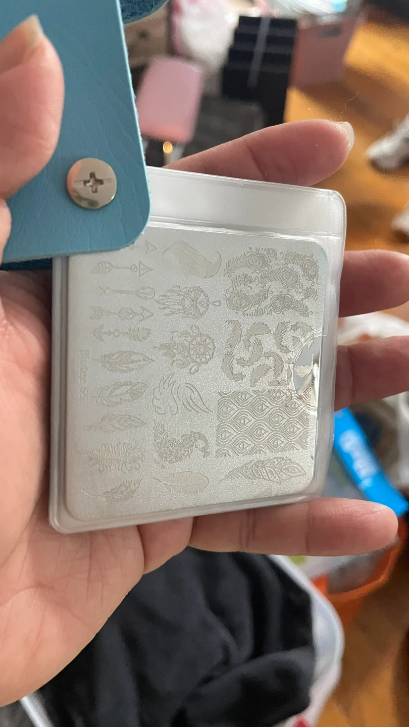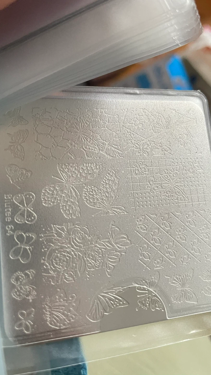 Here's a set of Born Pretty nail art stamping plates! There are several different designs, including feathers, leaves, butterflies, and geometric patterns