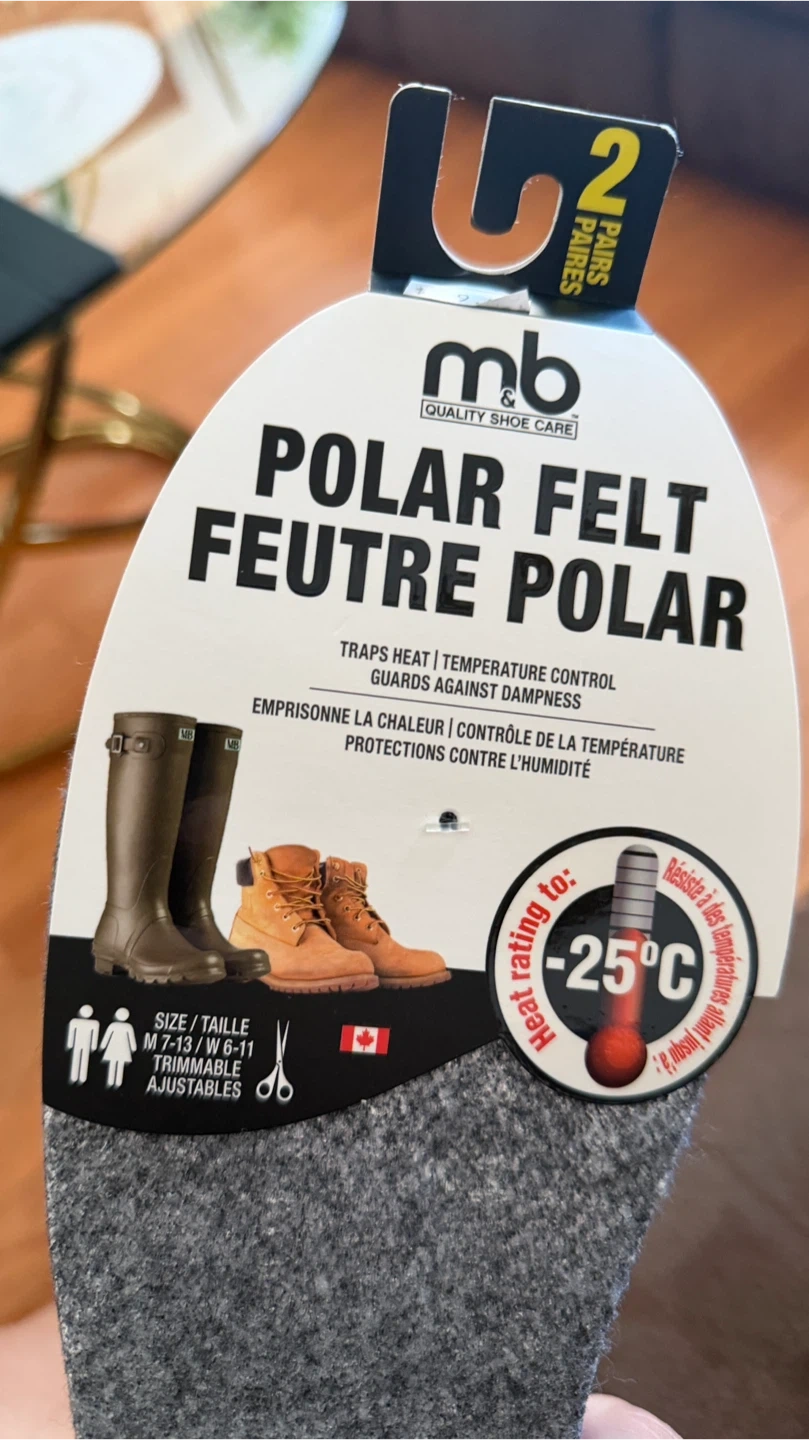 These MB Polar Felt insoles are designed for warmth and comfort in winter. They trap heat and guard against dampness, rated to -25°C. They're trim-to-fit for a customizable size. Use them for added warmth in boots during cold weather!