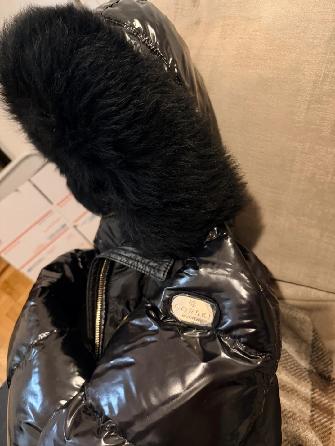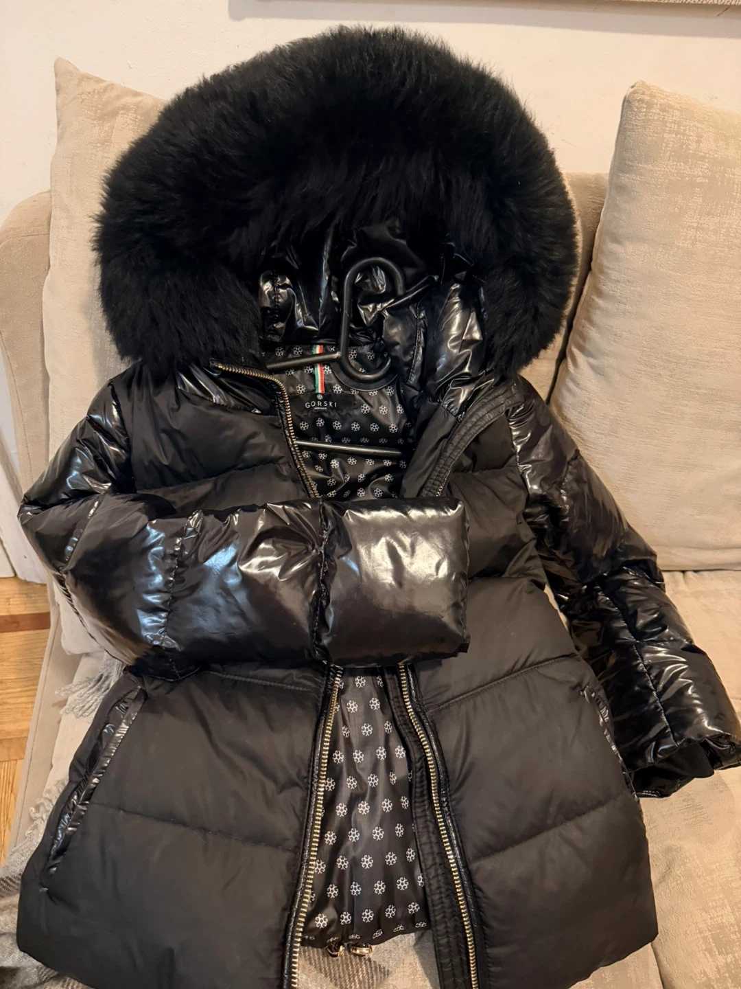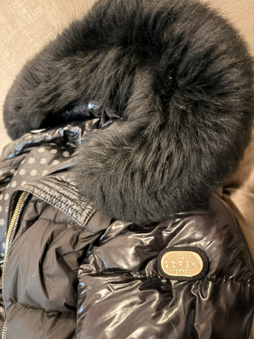 Glossy black down puffer jacket by Gorski. Features a large, plush black real fur-trimmed hood. Toscana Lamb fur from Italy. Perfect for staying warm and stylish. Size XS but it fits me though my size is S/M