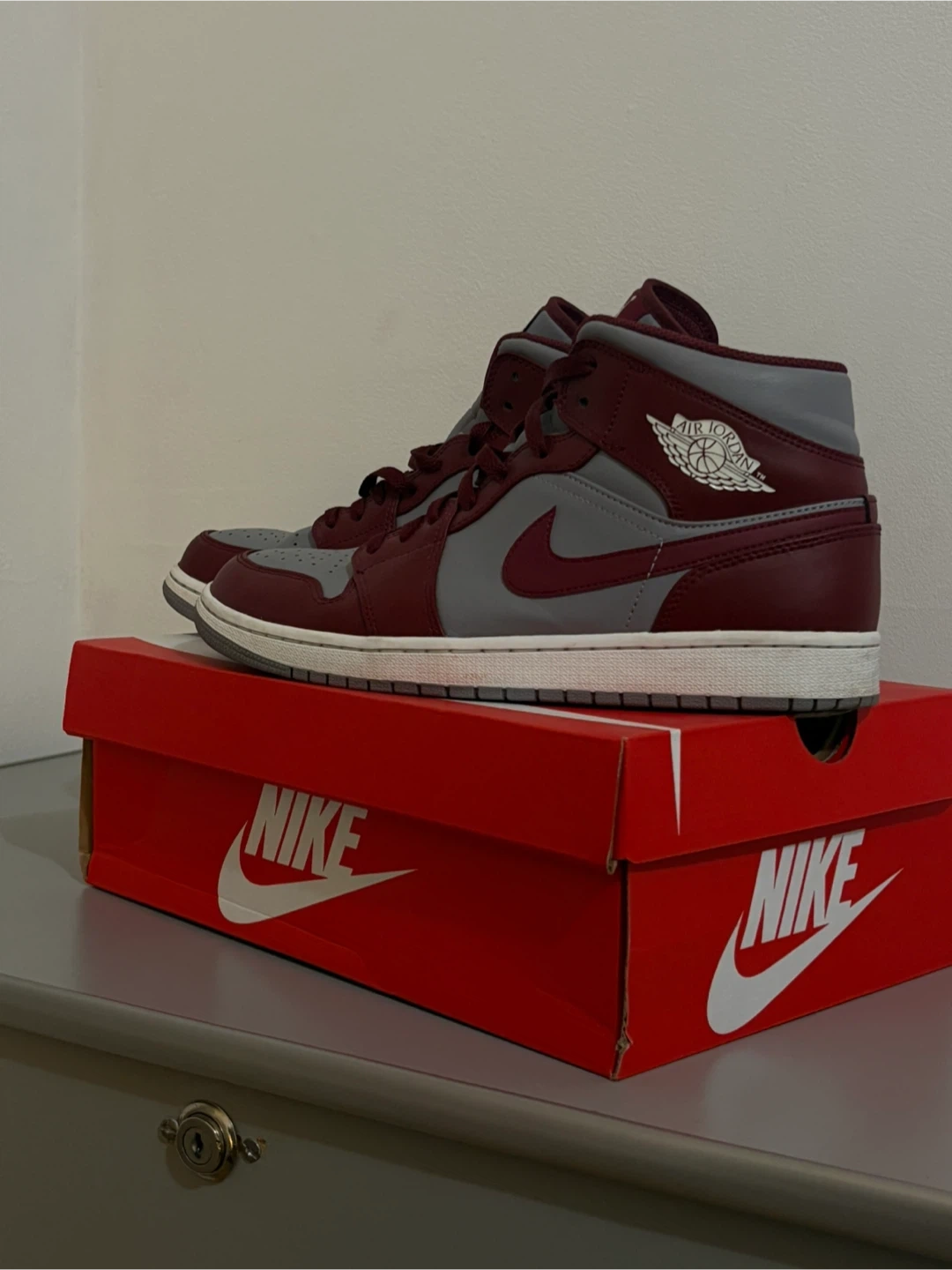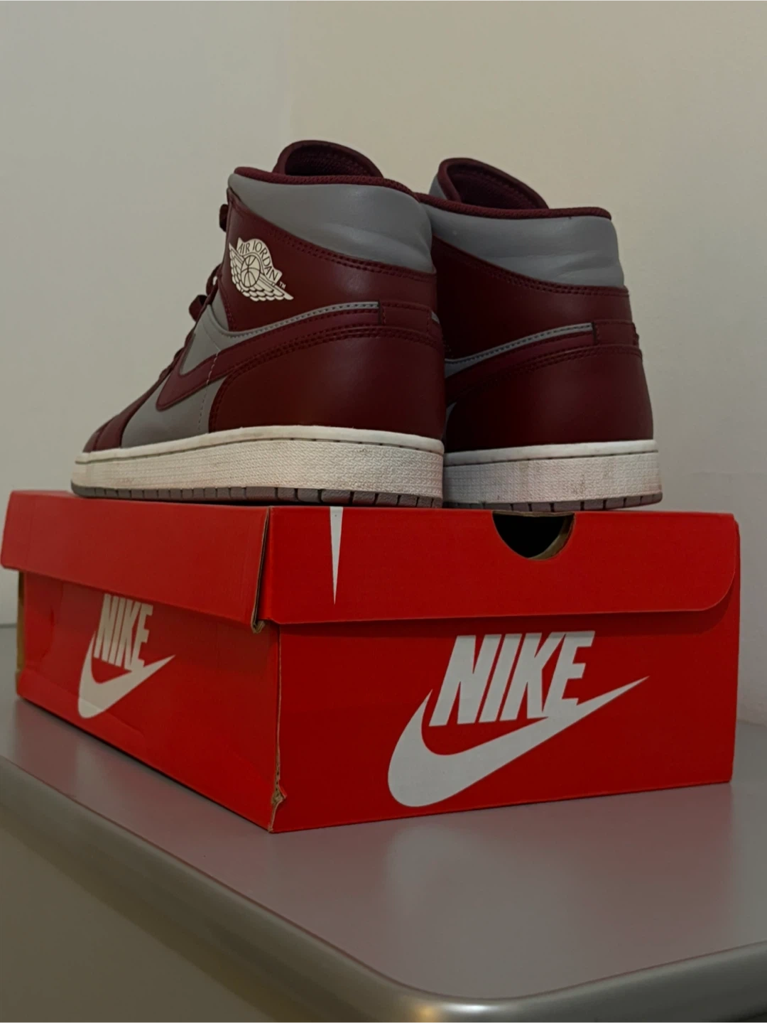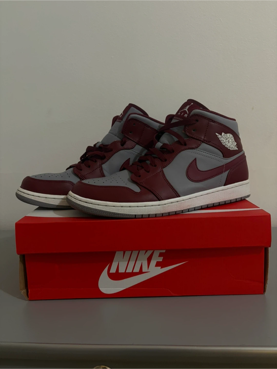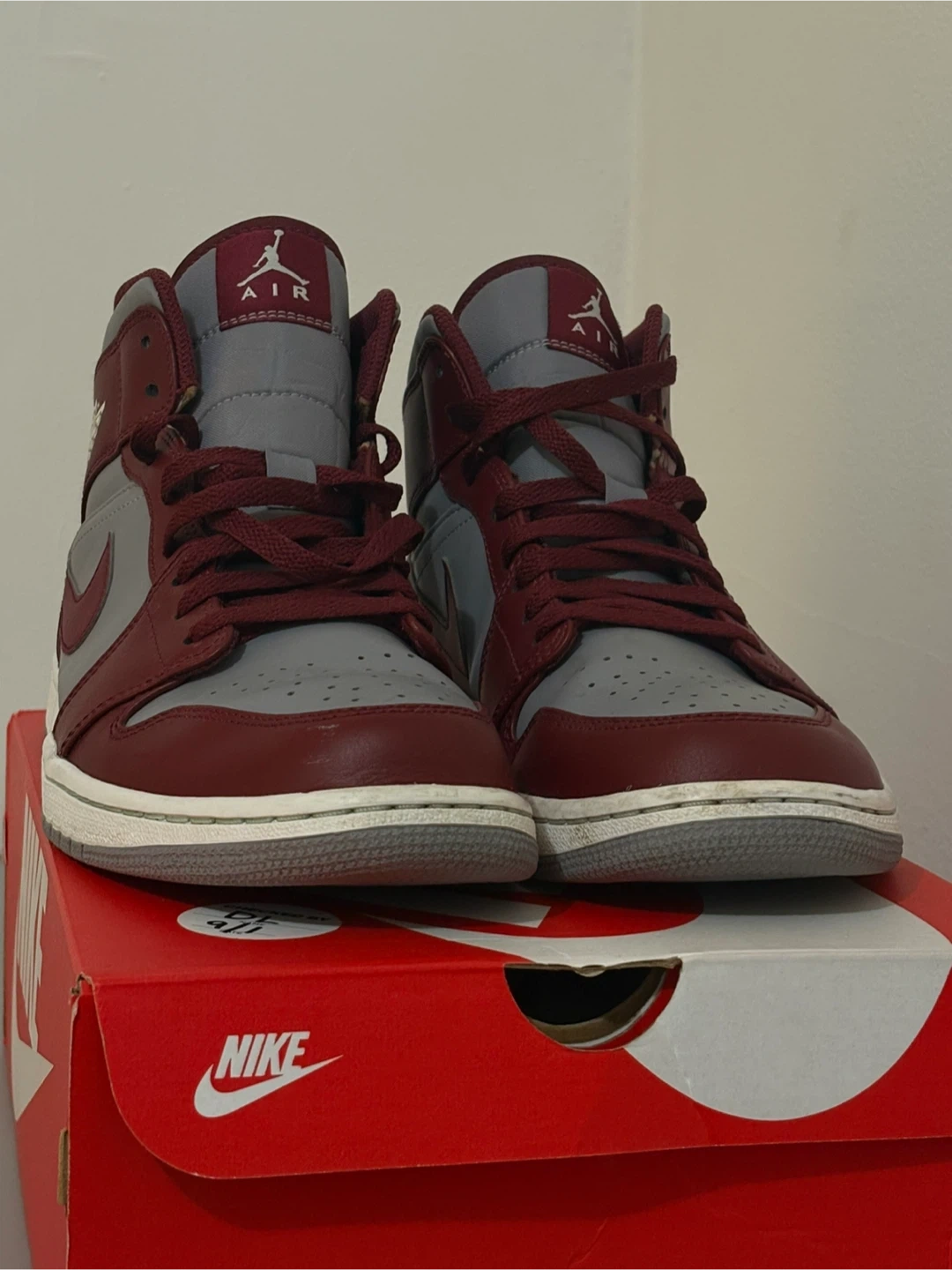 Selling a pair of Nike Air Jordan 1 Mid sneakers in a stylish Bordeaux and Grey color-way! These shoes are in great condition and come with the original box. Perfect for adding a pop of color to your sneaker collection!