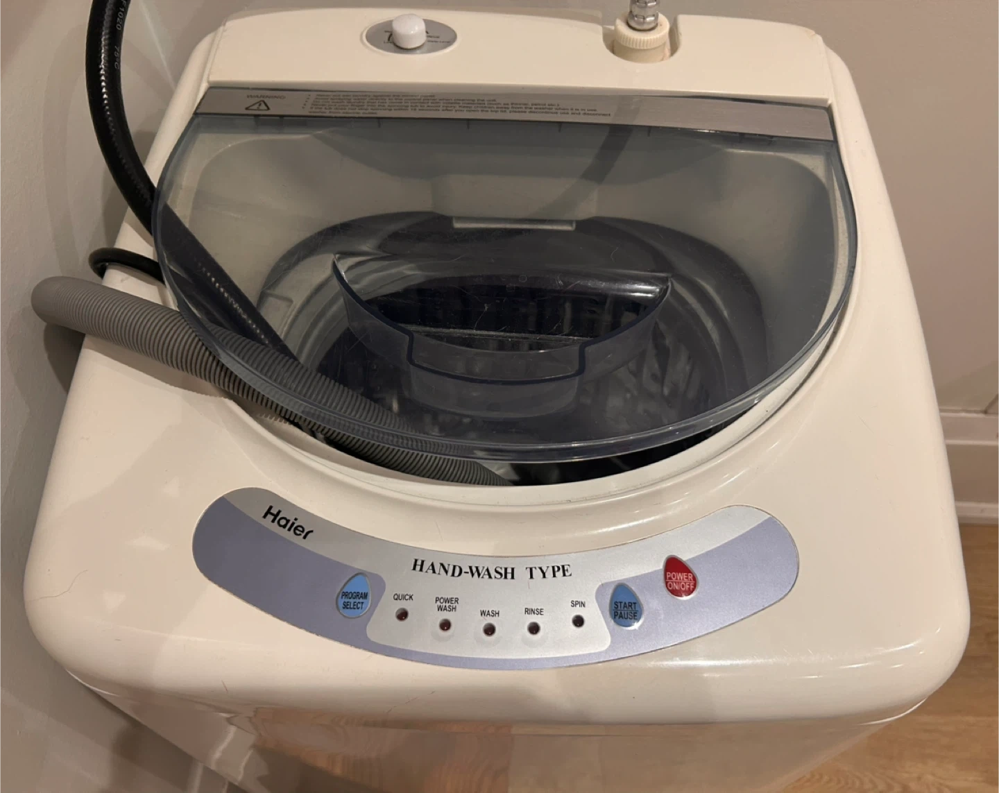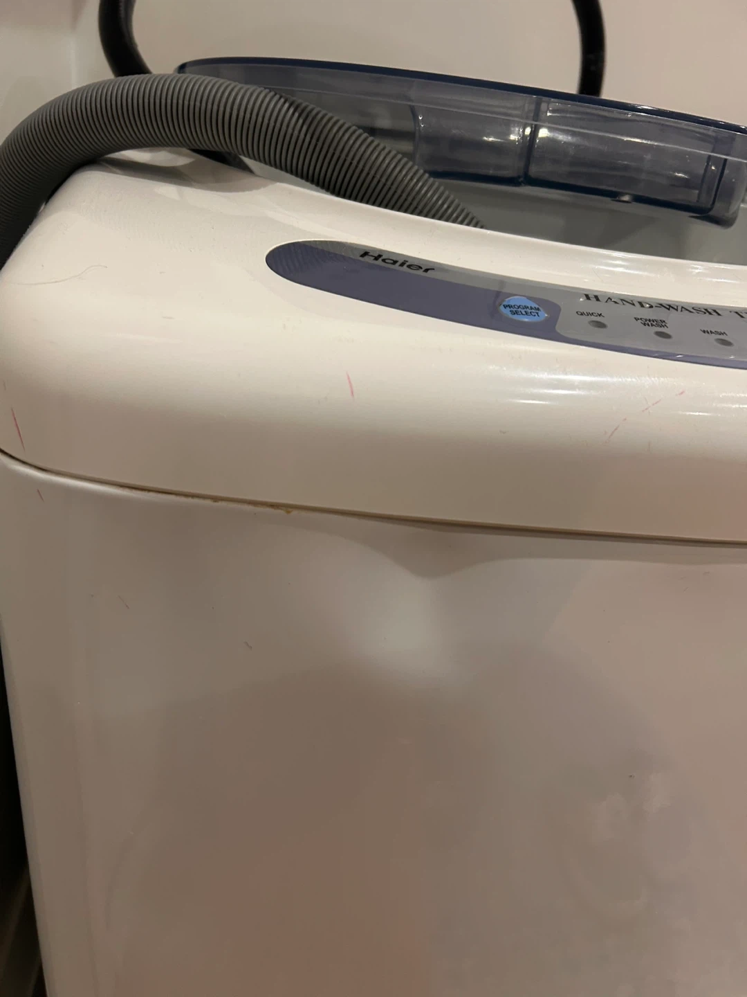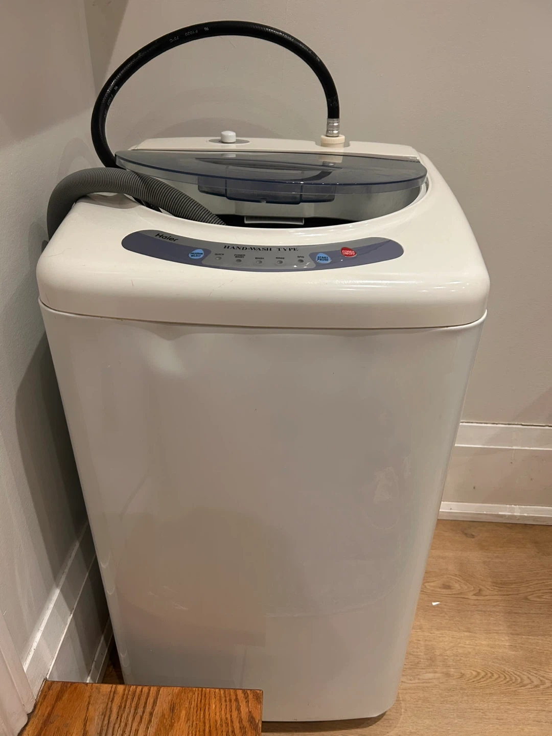 Haier portable washing machine, in perfect working condition. Includes outflow hose. Has a dent on right side (does not affect machine at all) been using about 3 times a month for that two last year.