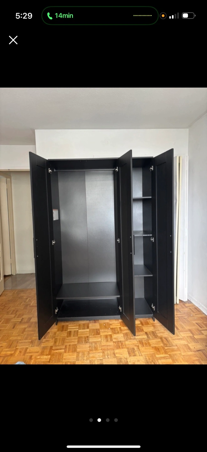 Selling a like new IKEA PAX wardrobe in black with 3 doors. It features a mirror on one of the doors. Dimensions are approximately 117 cm (46") wide, 190 cm (74 3/4") tall, and 50 cm (19 3/4") deep. Great for adding storage to any room!
