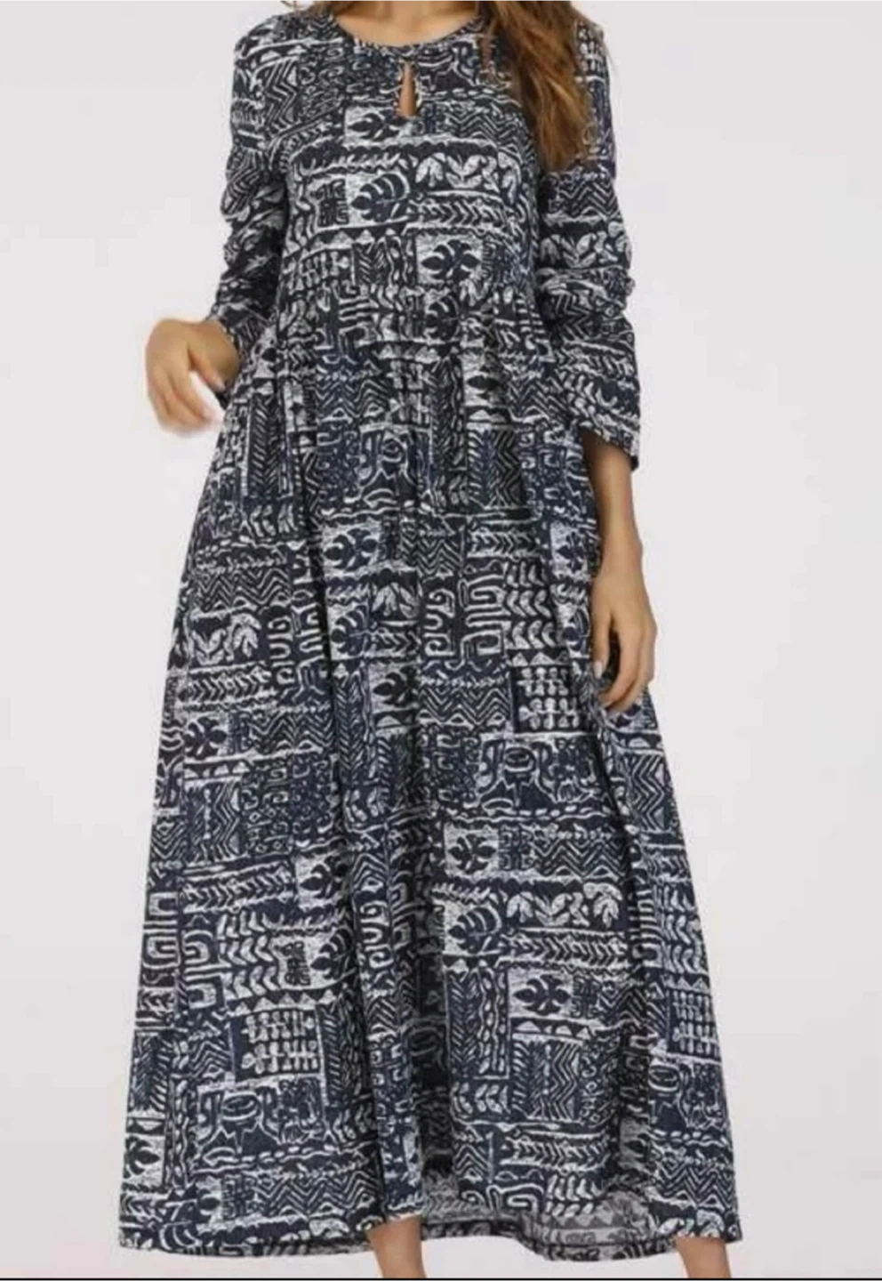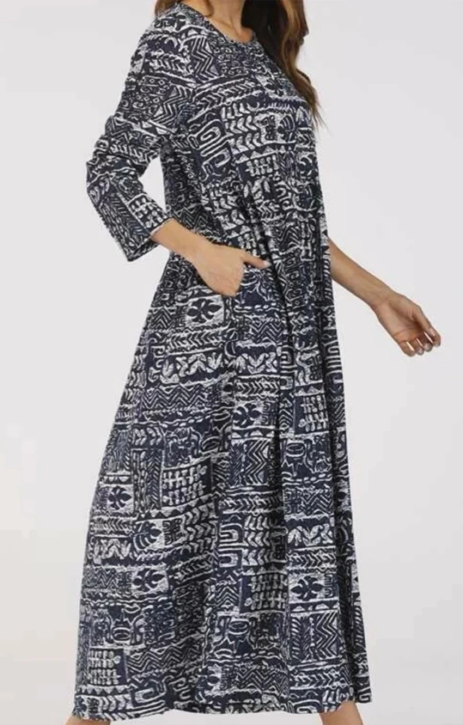 A comfy maxi dress with a classic navy and white abstract pattern. It's got long sleeves and handy pockets! This dress is a size medium.
