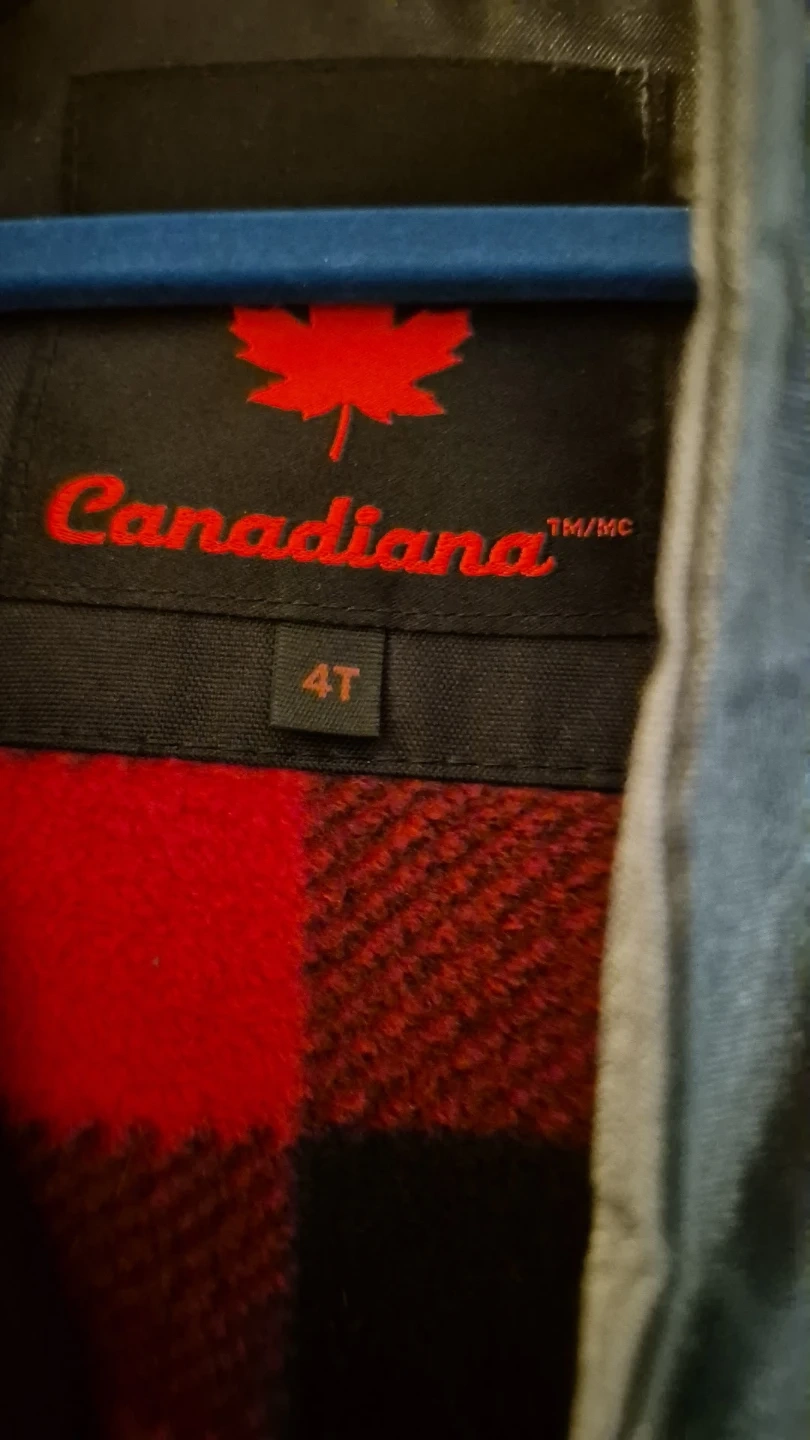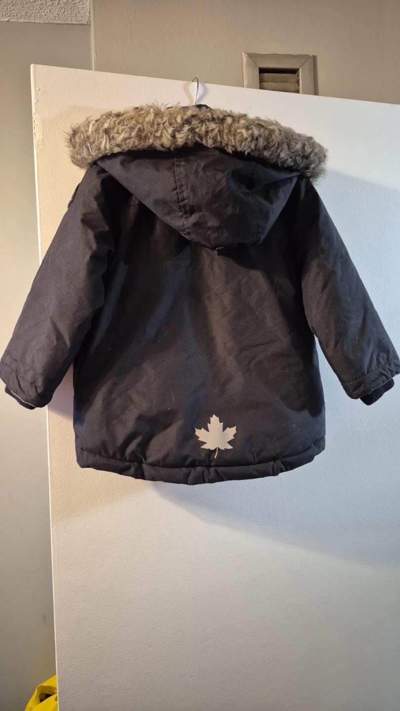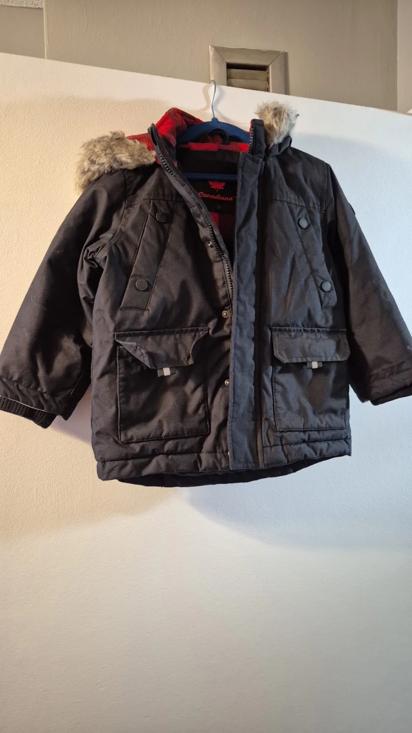 Cozy Canadiana winter jacket in size 4T! It's black with a faux fur trim on the hood and a red and black plaid lining. There's also a cute little maple leaf on the back. Perfect for keeping your little one warm this winter! Used but in good condition. Pick up Westmall and Rathburn condo
