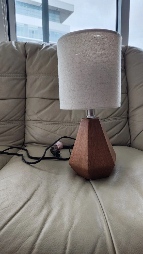 Small table lamp with a wooden base and white fabric shade. Perfect for a bedside table or desk.
