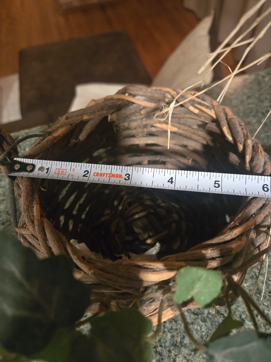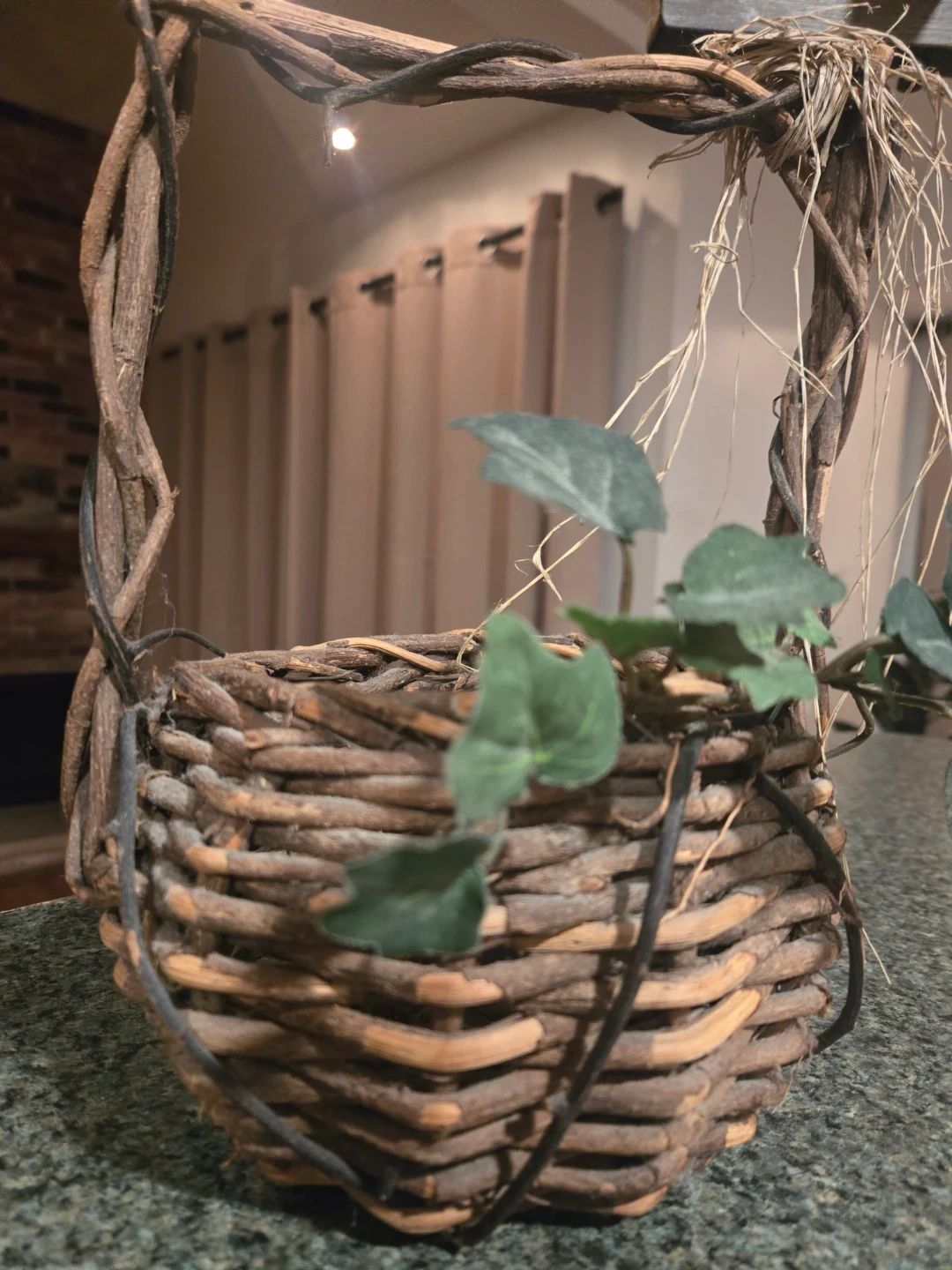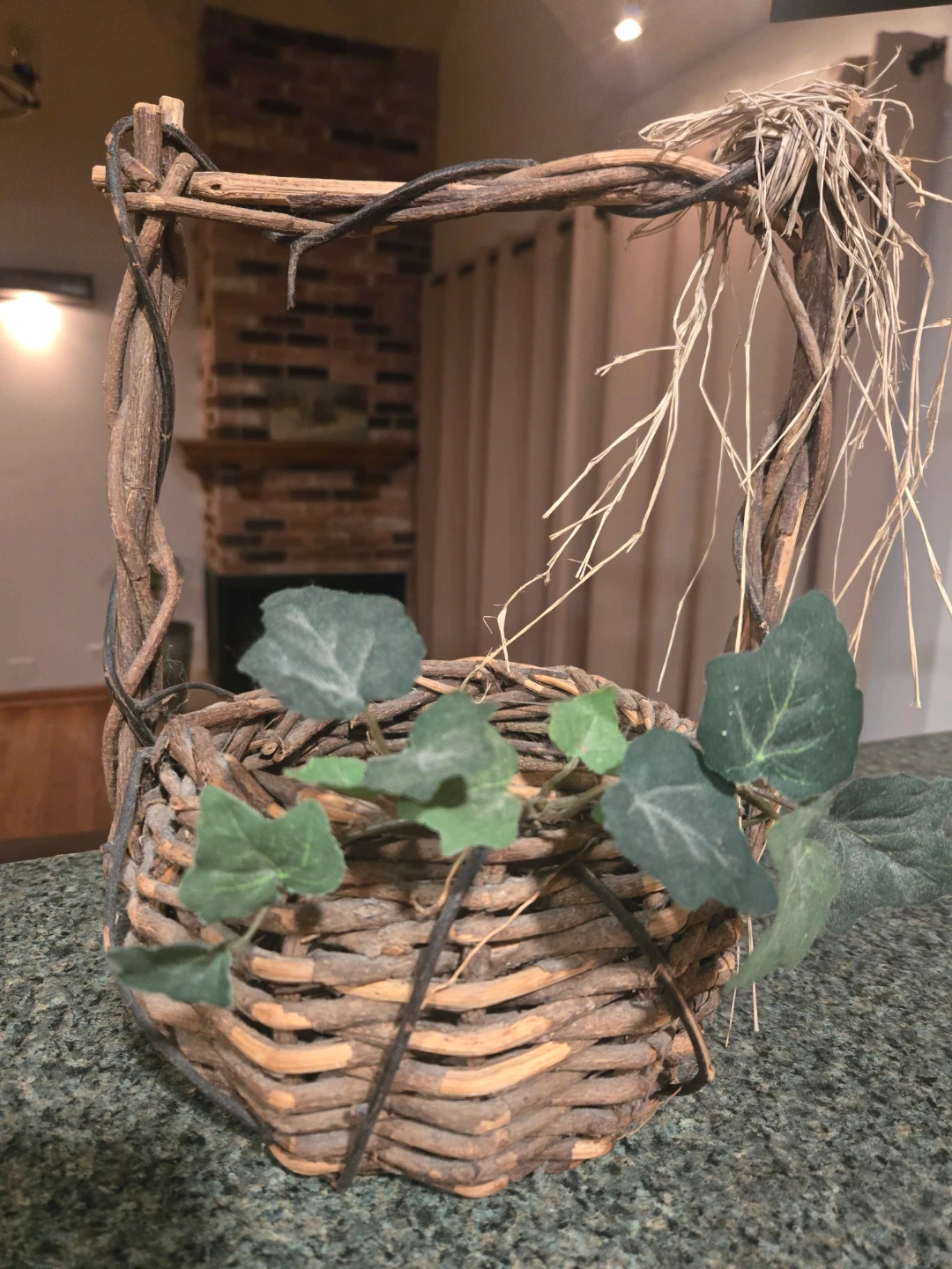 This charming woven basket features a rustic design with faux ivy accents. Its approximate opening diameter is 5 inches. It's a lovely decorative piece for your home!