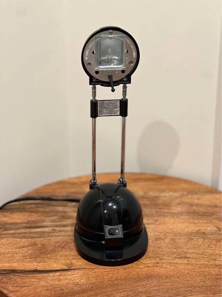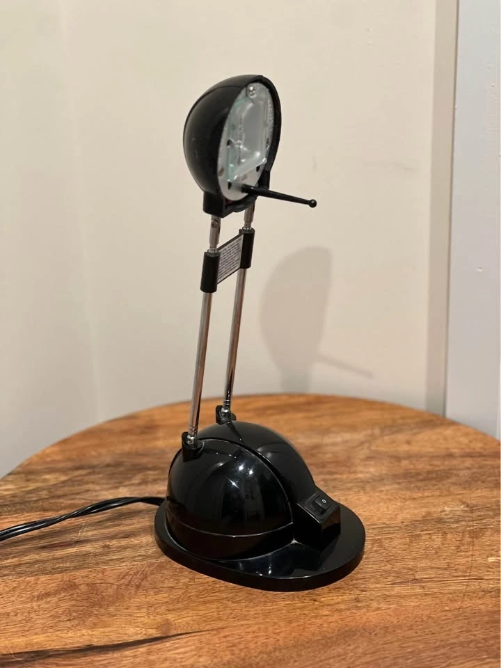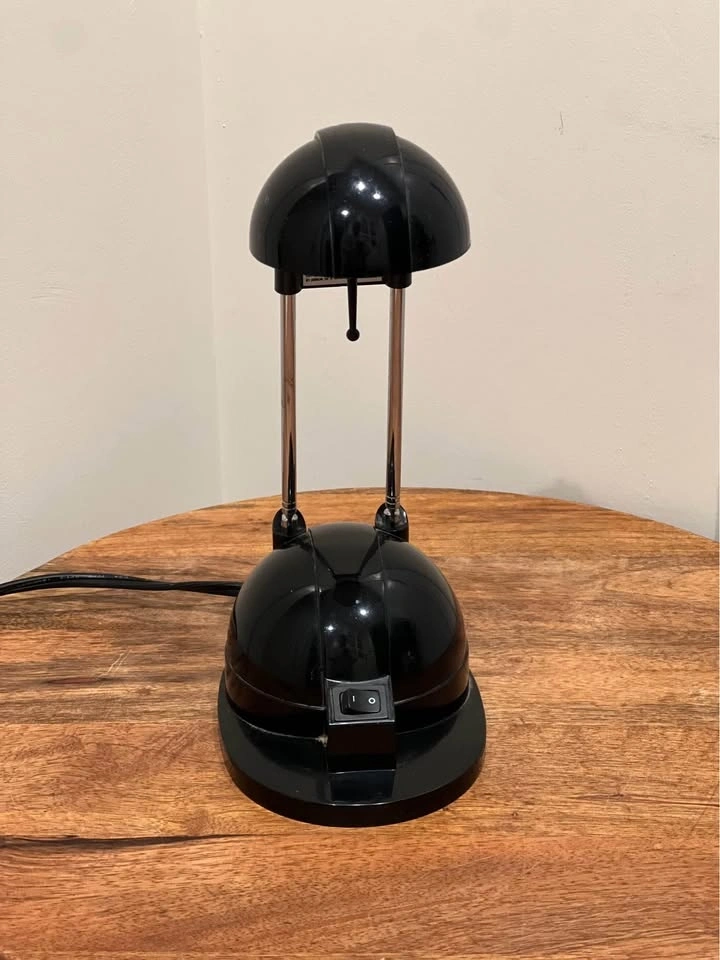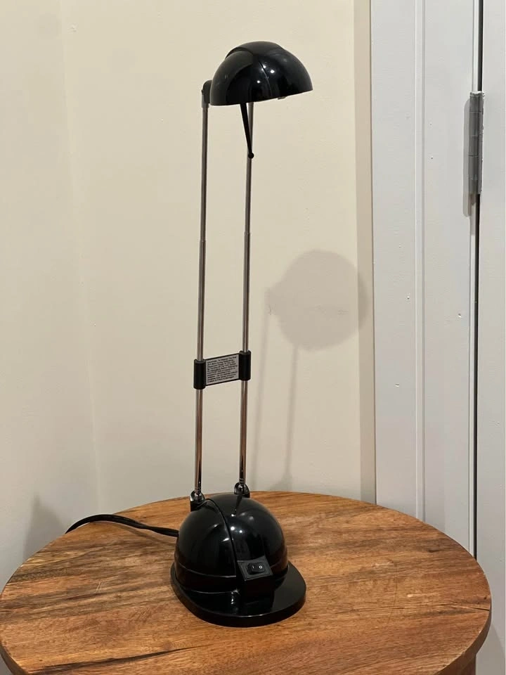 This is a vintage IKEA Espressivo black telescoping halogen desk lamp with a postmodern aesthetic. It features a glossy black finish, a dome-shaped head, and a telescoping neck for height adjustment. Produced by IKEA in the 1990s, it was designed as a functional work or reading lamp for desks or tables. This is a collectible piece of IKEA vintage lighting. Preowned. Pickup is at 58th and 7th Ave in midtown Manhattan.