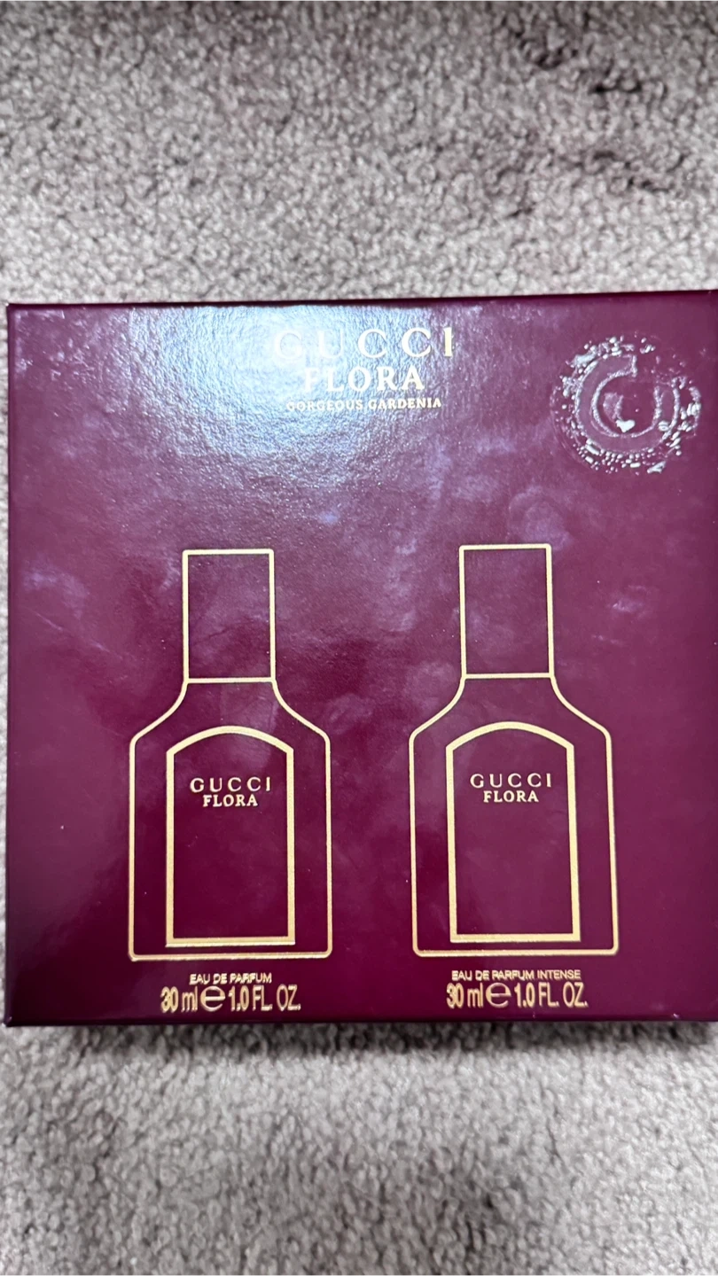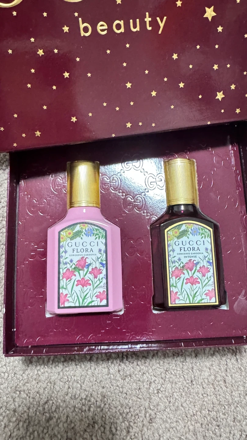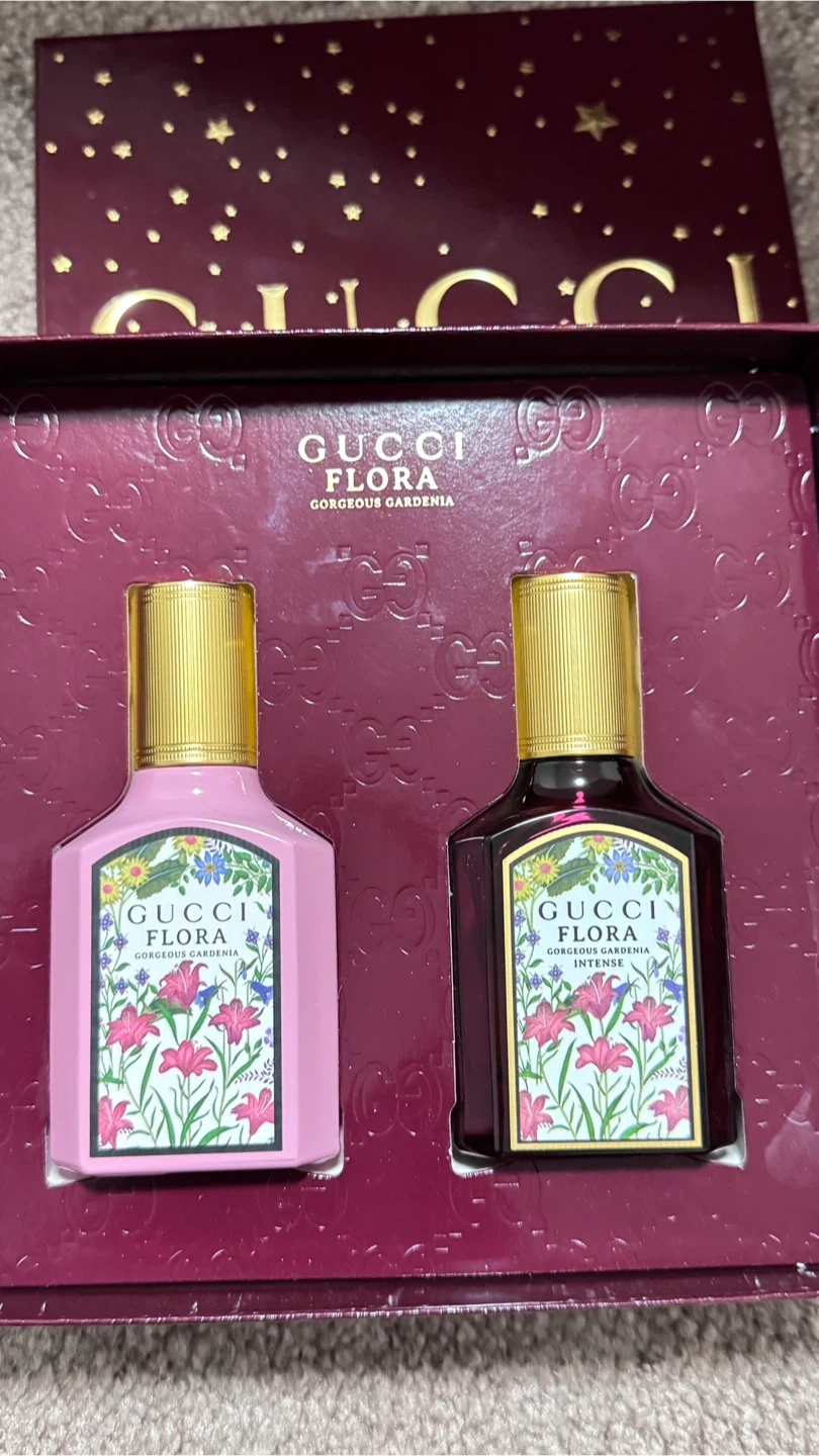 This set includes two Gucci Flora Gorgeous Gardenia fragrances. One is Eau de Parfum and the other is Eau de Parfum Intense. Each bottle is 30ml (1.0 fl oz).