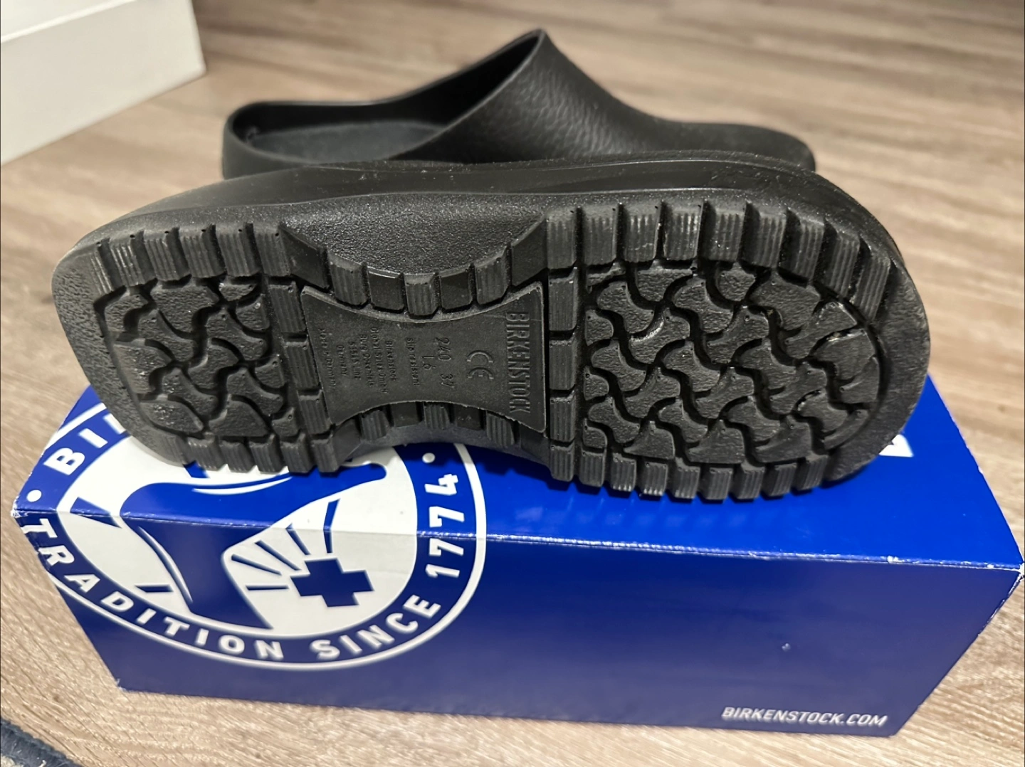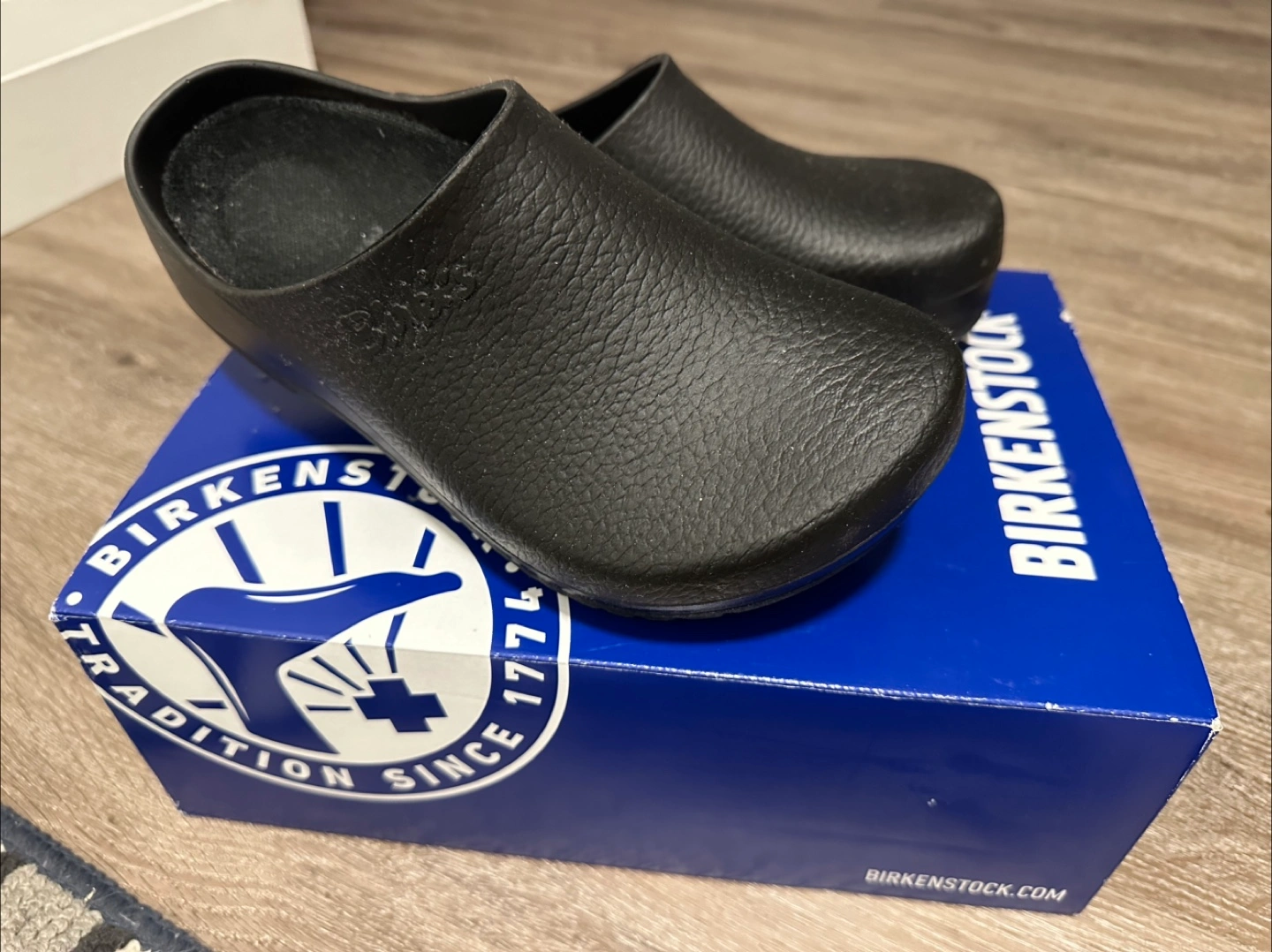 Selling a pair of Birkenstock Super-Birki clogs in black! They are a US size 6, which is equivalent to a European size 37. These clogs are made with a polyurethane sole and are super comfy. Comes with the original box!