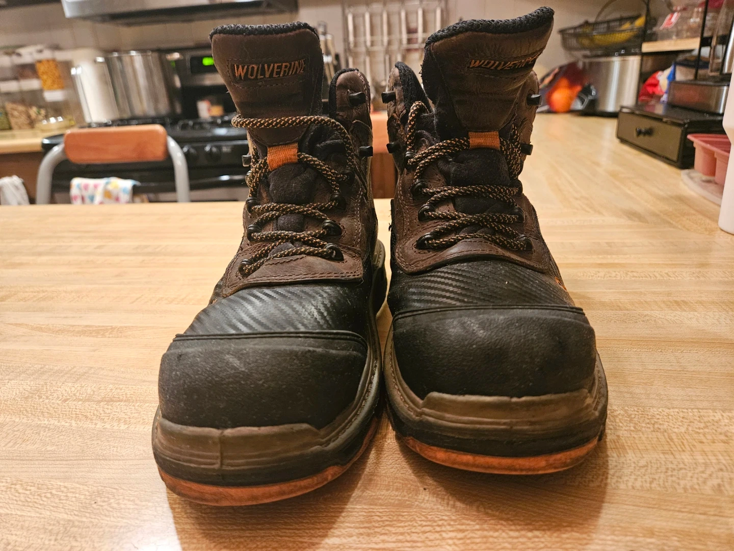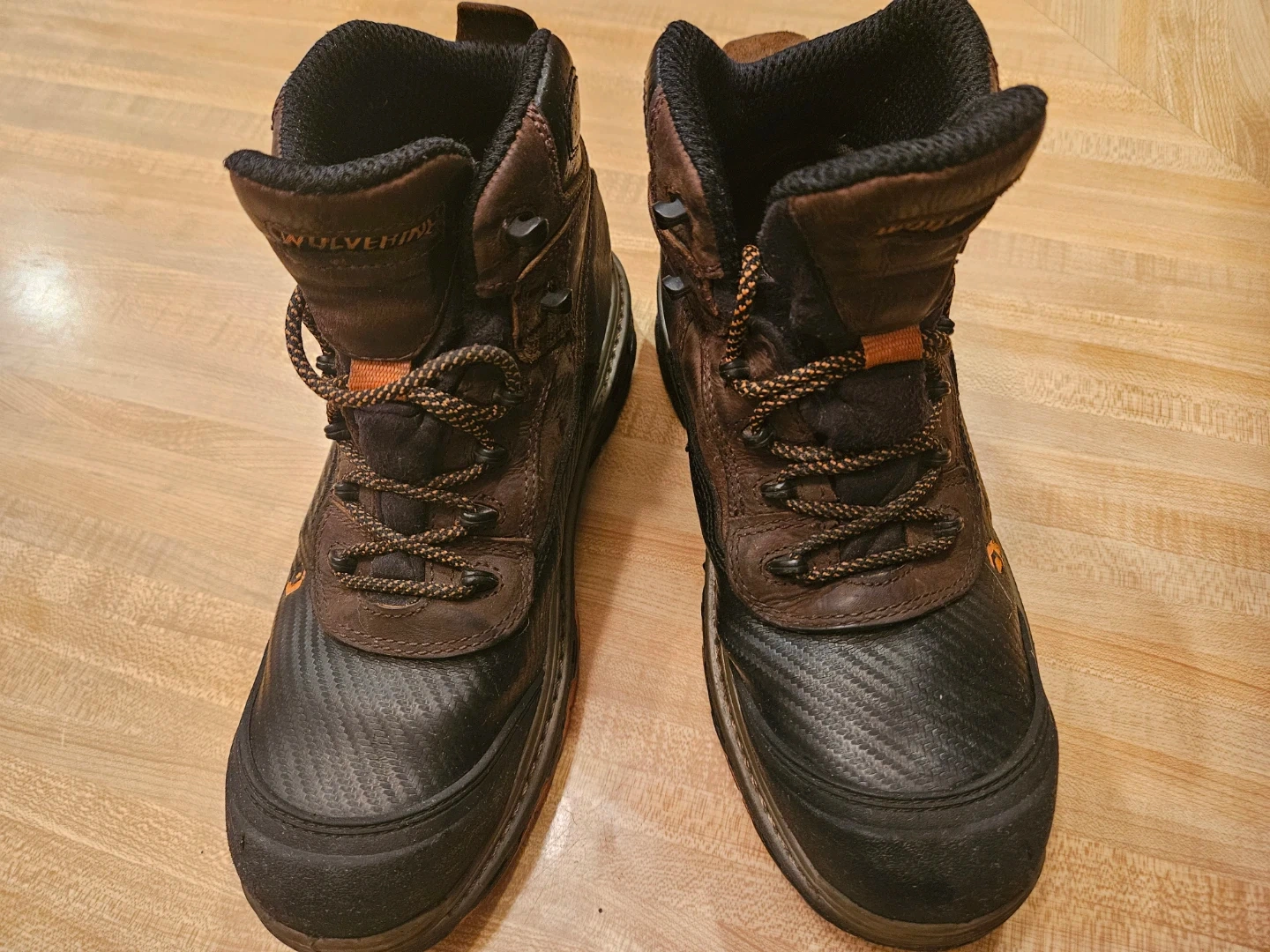 These are men's Wolverine work boots. They're brown leather with black synthetic toe caps. The soles have orange accents.
