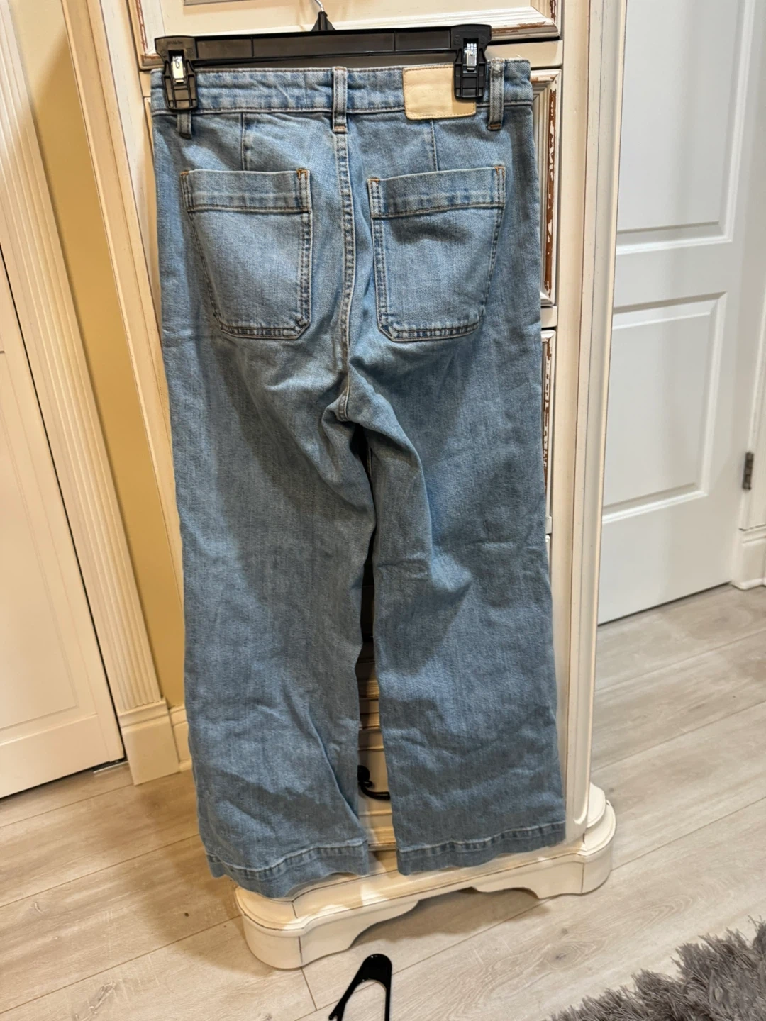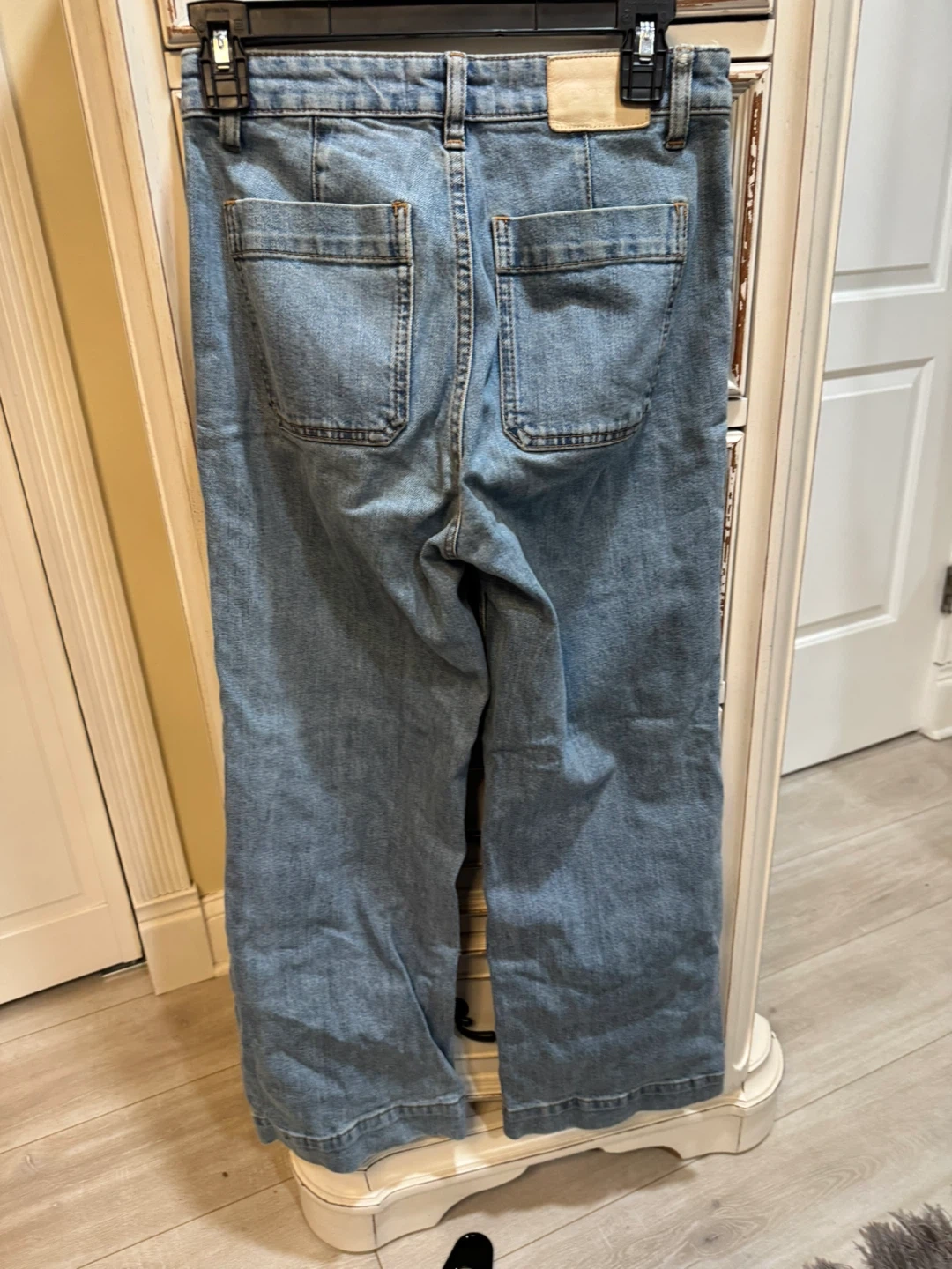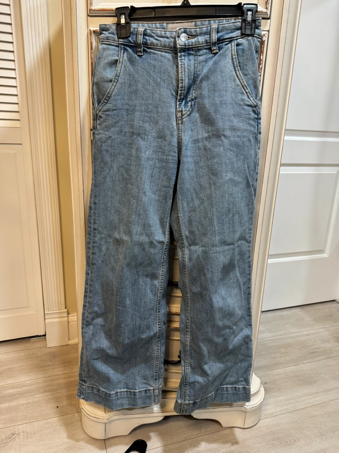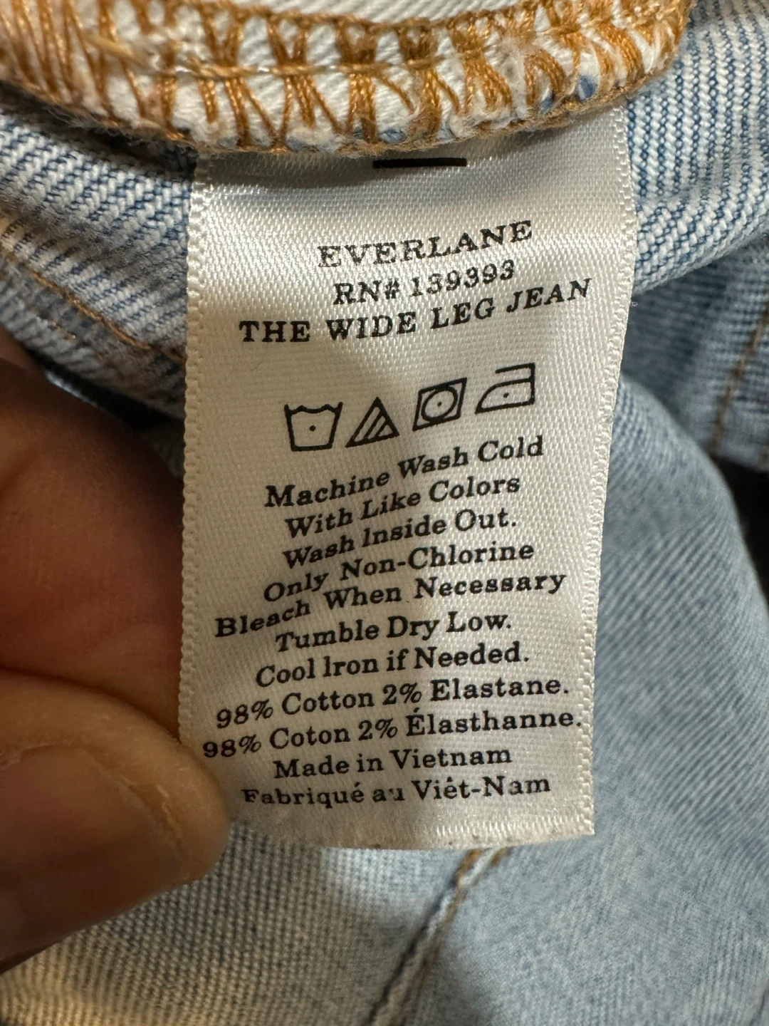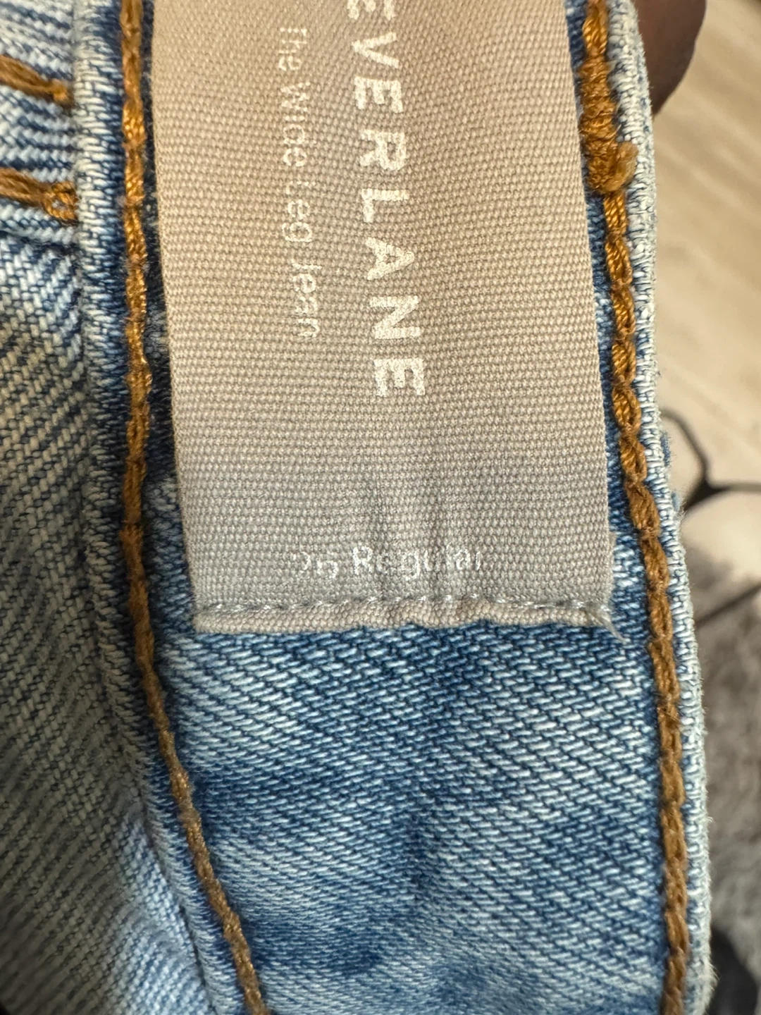 These are Everlane women's wide leg jeans in a light wash blue denim. They're made from cotton and have a classic five-pocket design. The inseam measures 26Regular