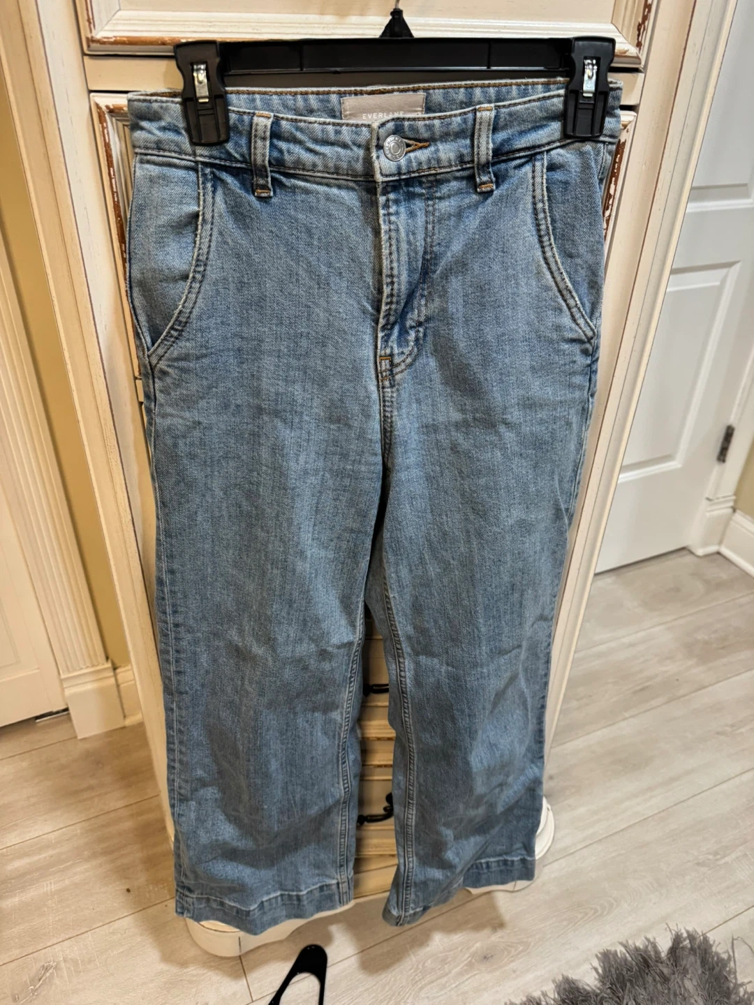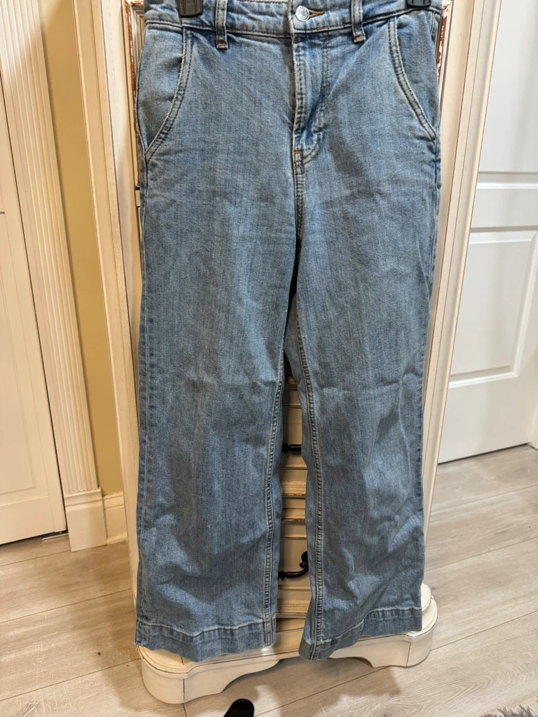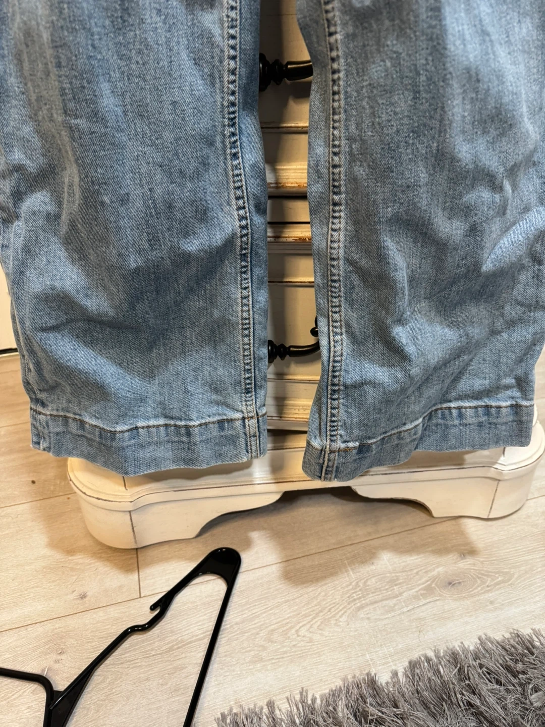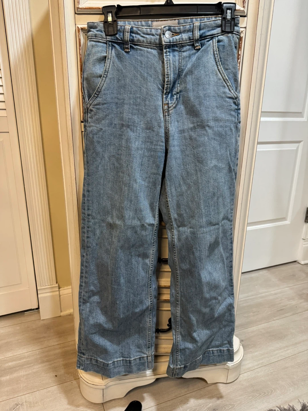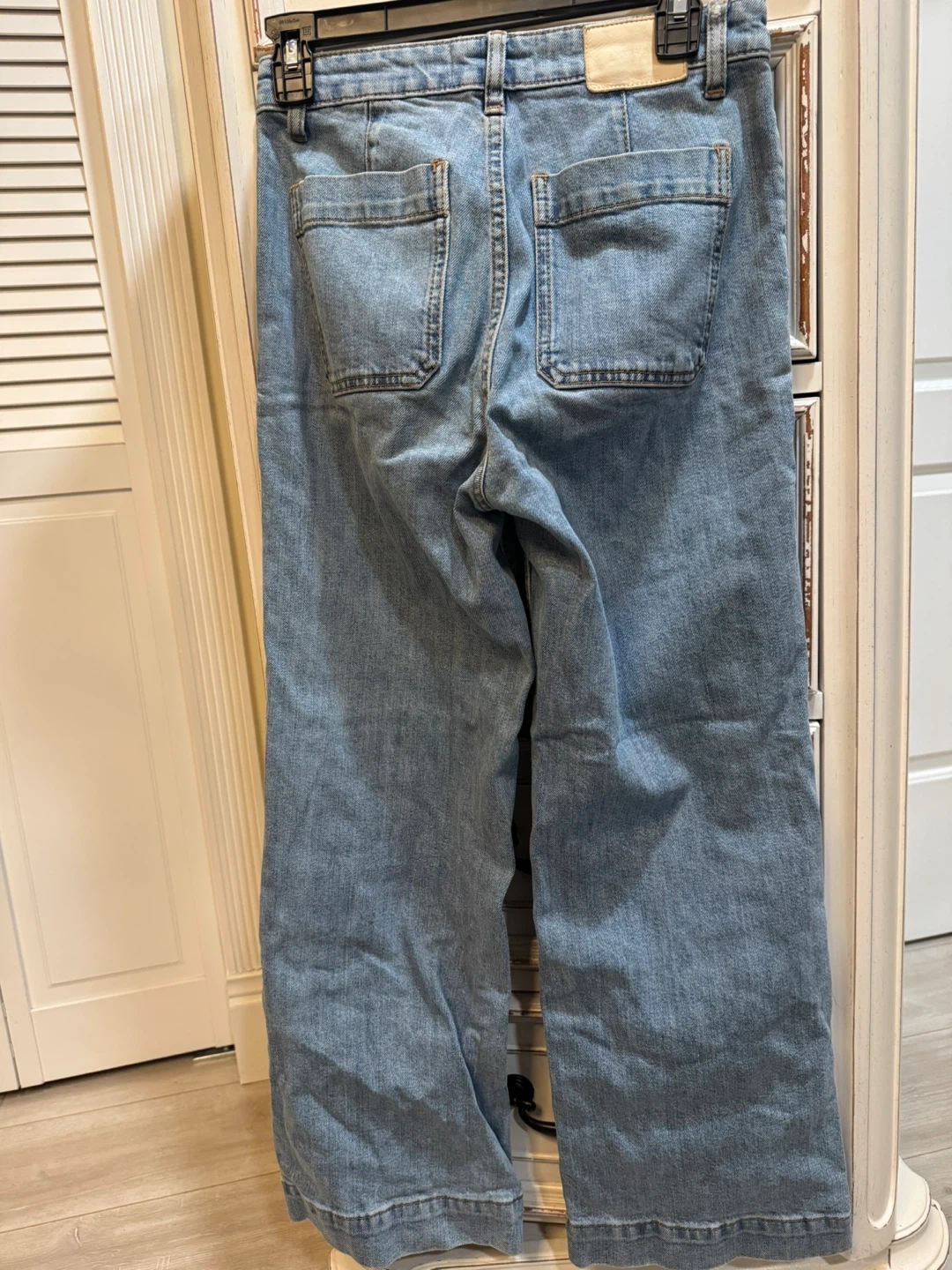These are Everlane women's wide leg jeans in a light wash blue denim. They're made from cotton and have a classic five-pocket design. The inseam measures 26Regular