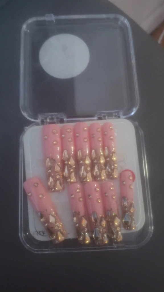 Selling a set of press on nails. They are pink with gold accents and come in a clear storage case. Perfect for a quick and easy manicure!