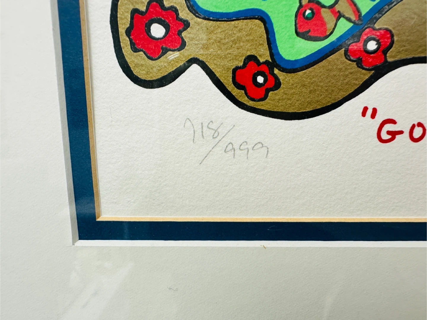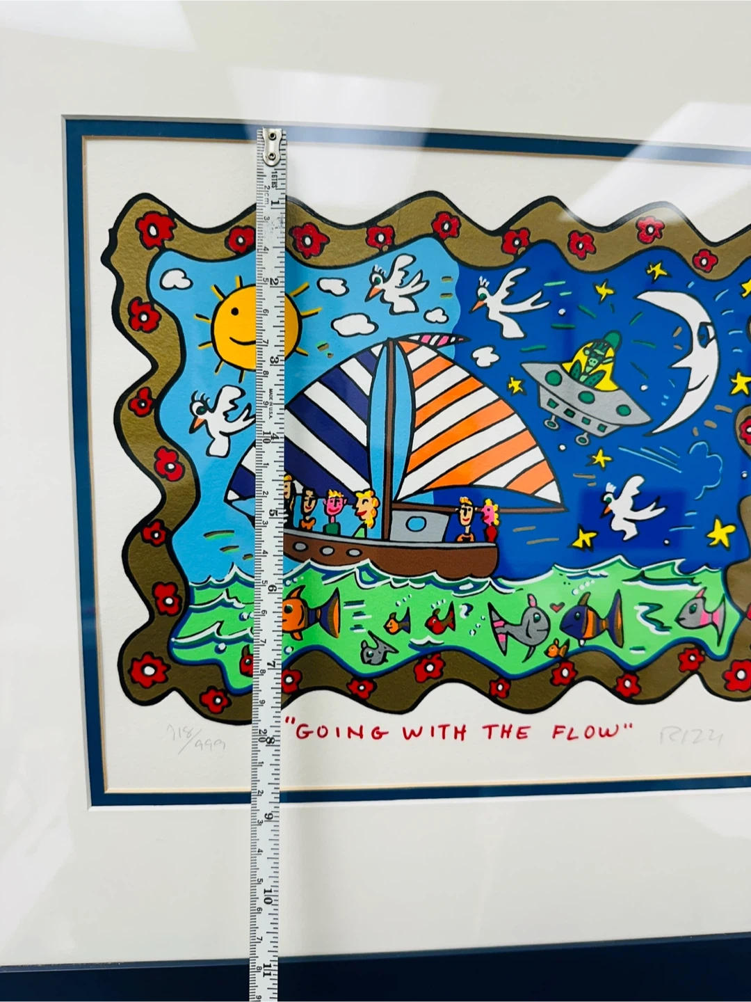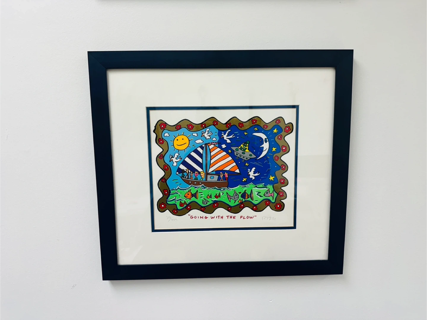 114Selling a framed art print titled "Going With The Flow" by James Rizzi. It's a colorful and whimsical piece, perfect for adding a touch of fun to any room. The print is numbered 718/999 and is in great condition. The frame measures approximately 16 inches.