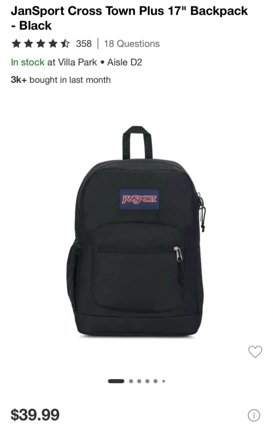 50Selling a JanSport Cross Town Plus 17" Backpack in black! This backpack is perfect for school, work, or everyday use. It features a spacious main compartment, a front utility pocket with an organizer, and a side water bottle pocket. Originally bought for $39.99