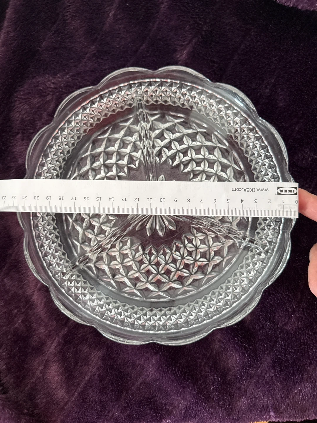 A clear glass divided serving tray with a diamond pattern. It has three sections for different snacks or appetizers. Measures approximately 9 inches in diameter.