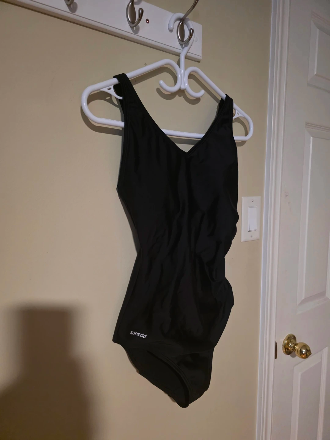 This is a black Speedo one-piece swimsuit. It's made of a durable fabric suitable for swimming. This suit is great for the pool or the beach!