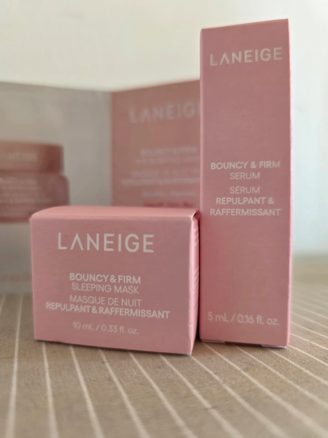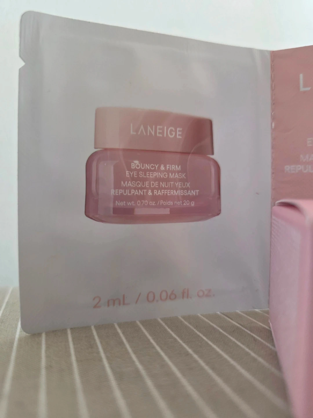 Set includes Laneige Bouncy & Firm Eye Sleeping Mask (10 mL / 0.33 fl. oz.) and Bouncy & Firm Serum (5 mL / 0.16 fl. oz.). Comes with a sample sachet of the eye sleeping mask (2 mL / 0.06 fl. oz.).