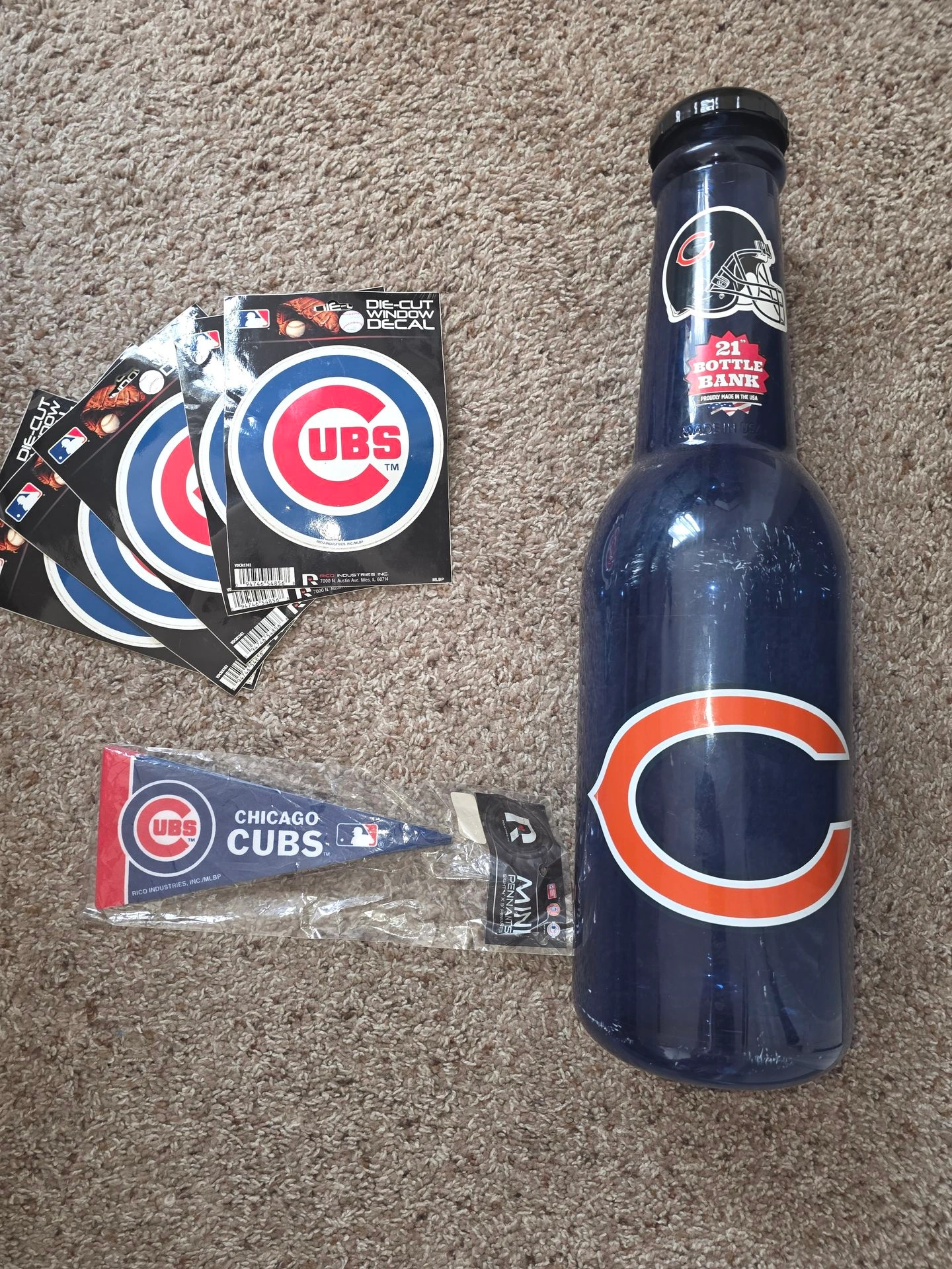 Window decal stickers $3 each or all for $10. Chicago Bears 21" beer bottle bank $10. Chicago Cubs (8 pack) mini pennants $5. Let me know if you're interested!