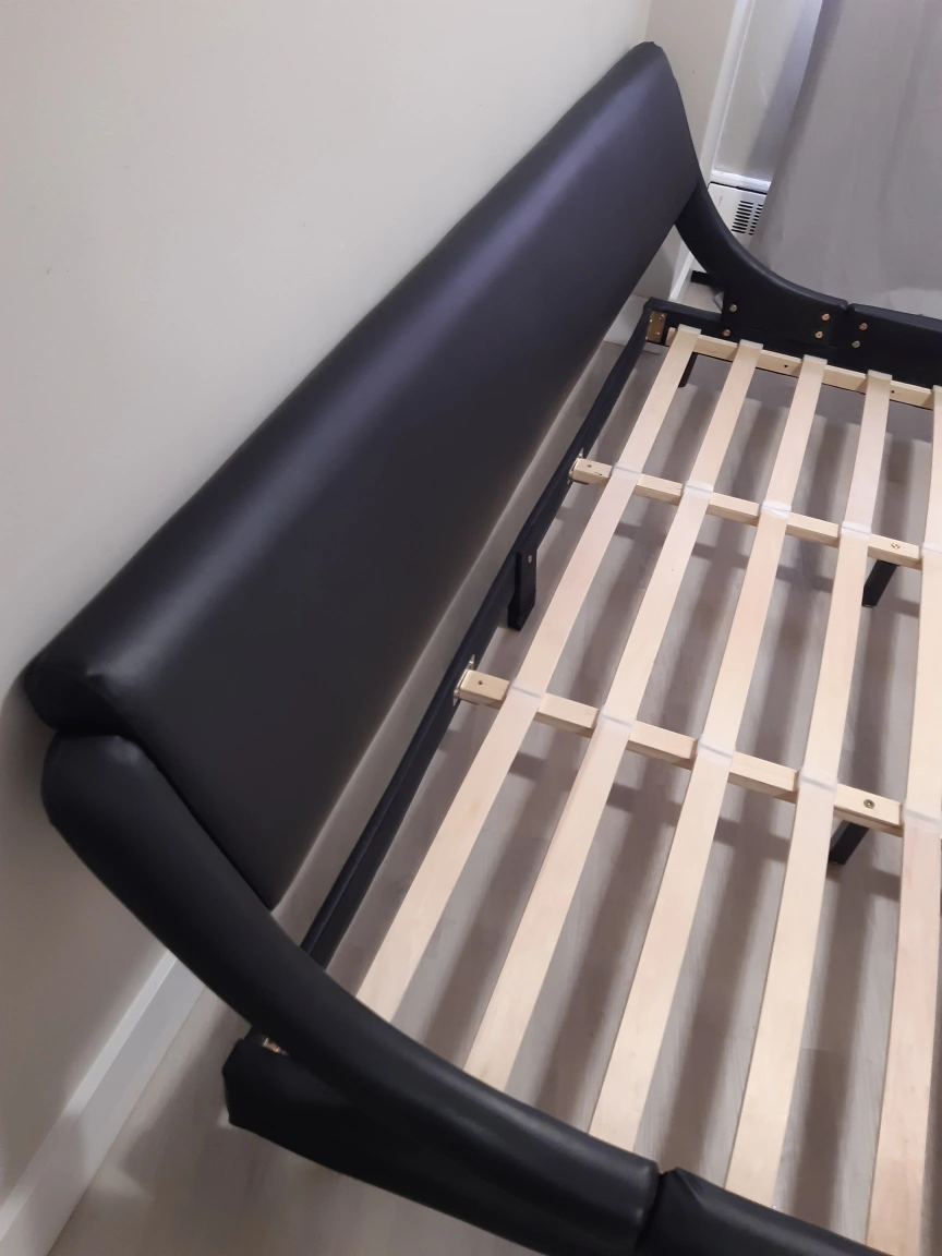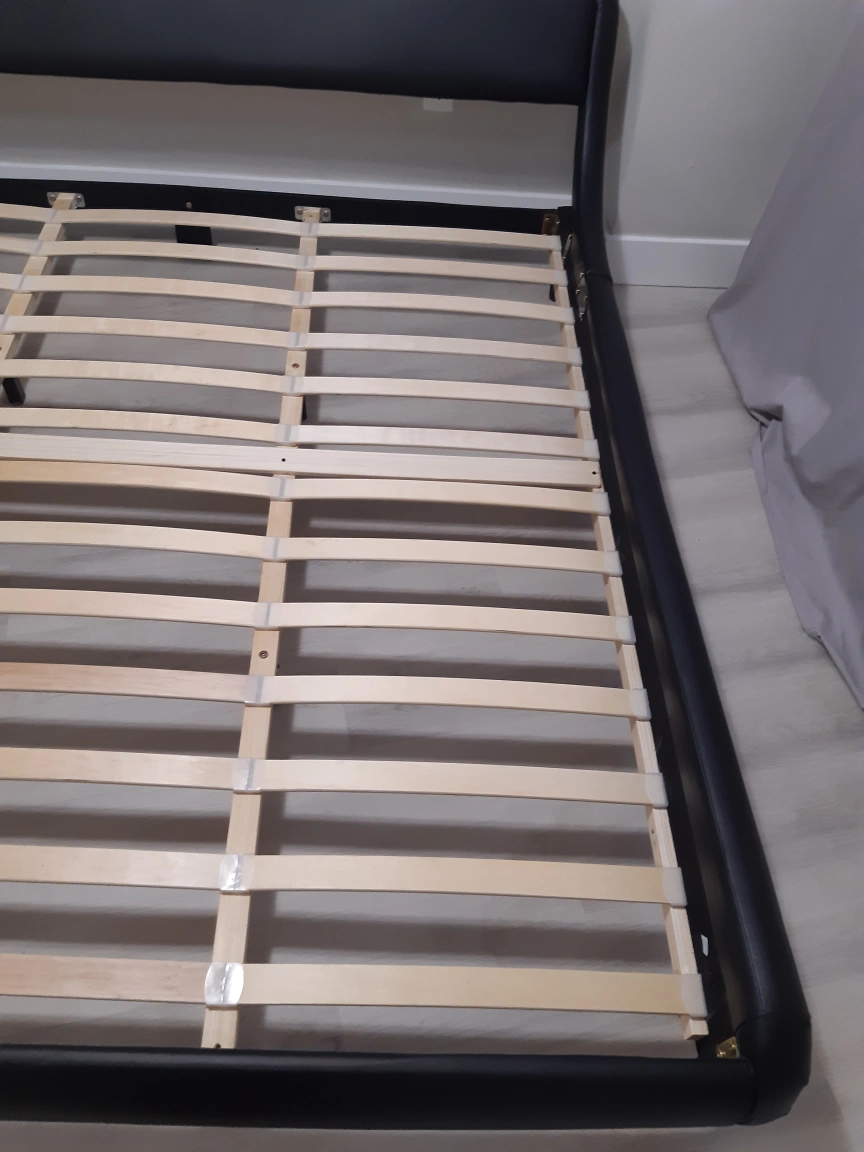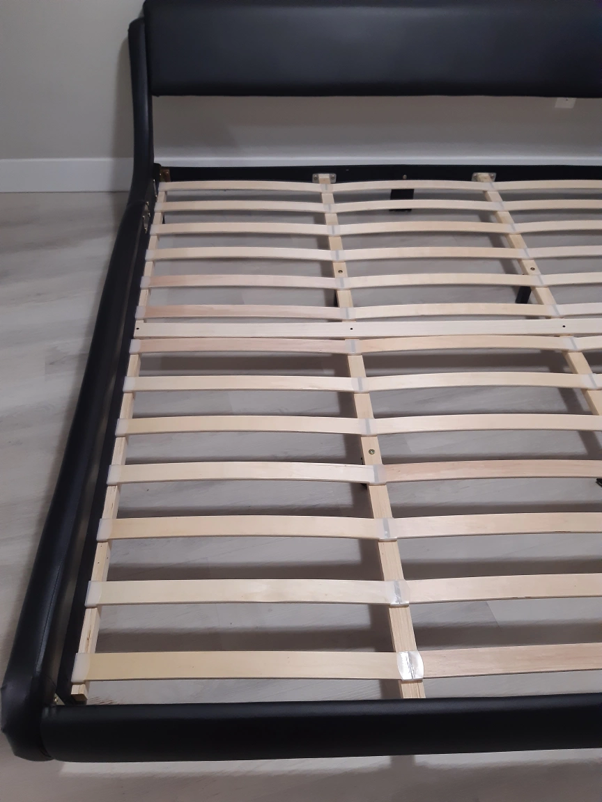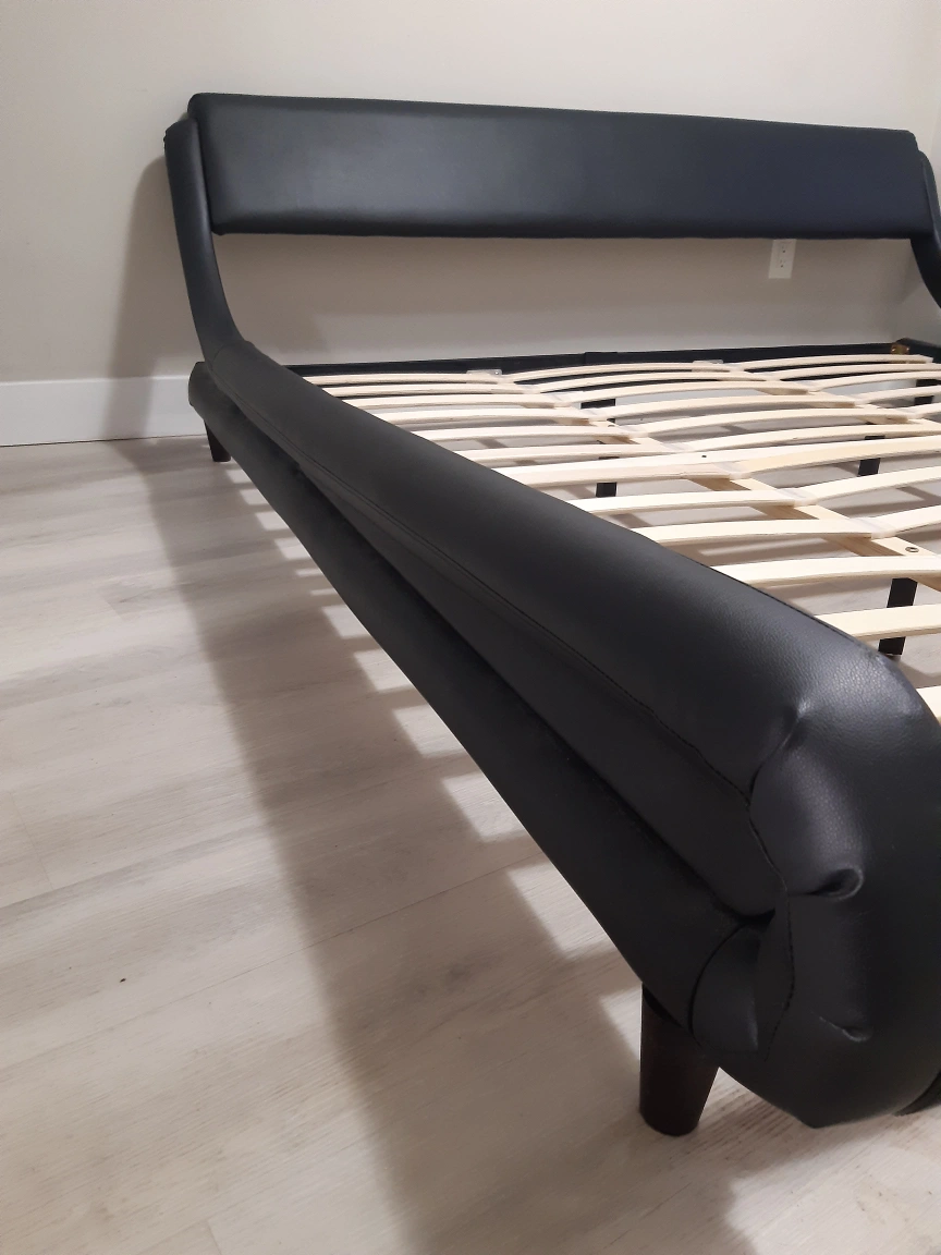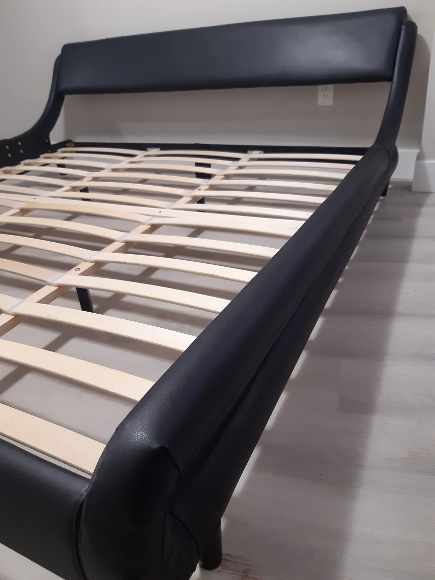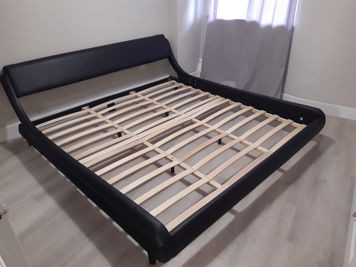 103This King sized upholstered bed frame with headboard support and black faux leather upholstery provides a modern, glamorous spot to lie down or sleep, exuding a soothing look and a luxurious appeal to enhance any bedroom centerpiece. It was ordered here in November 2023: https://www.amazon.ca/gp/aw/d/B08ML7PVQR/ref=ya_aw_od_pi?ie=UTF8&psc=1