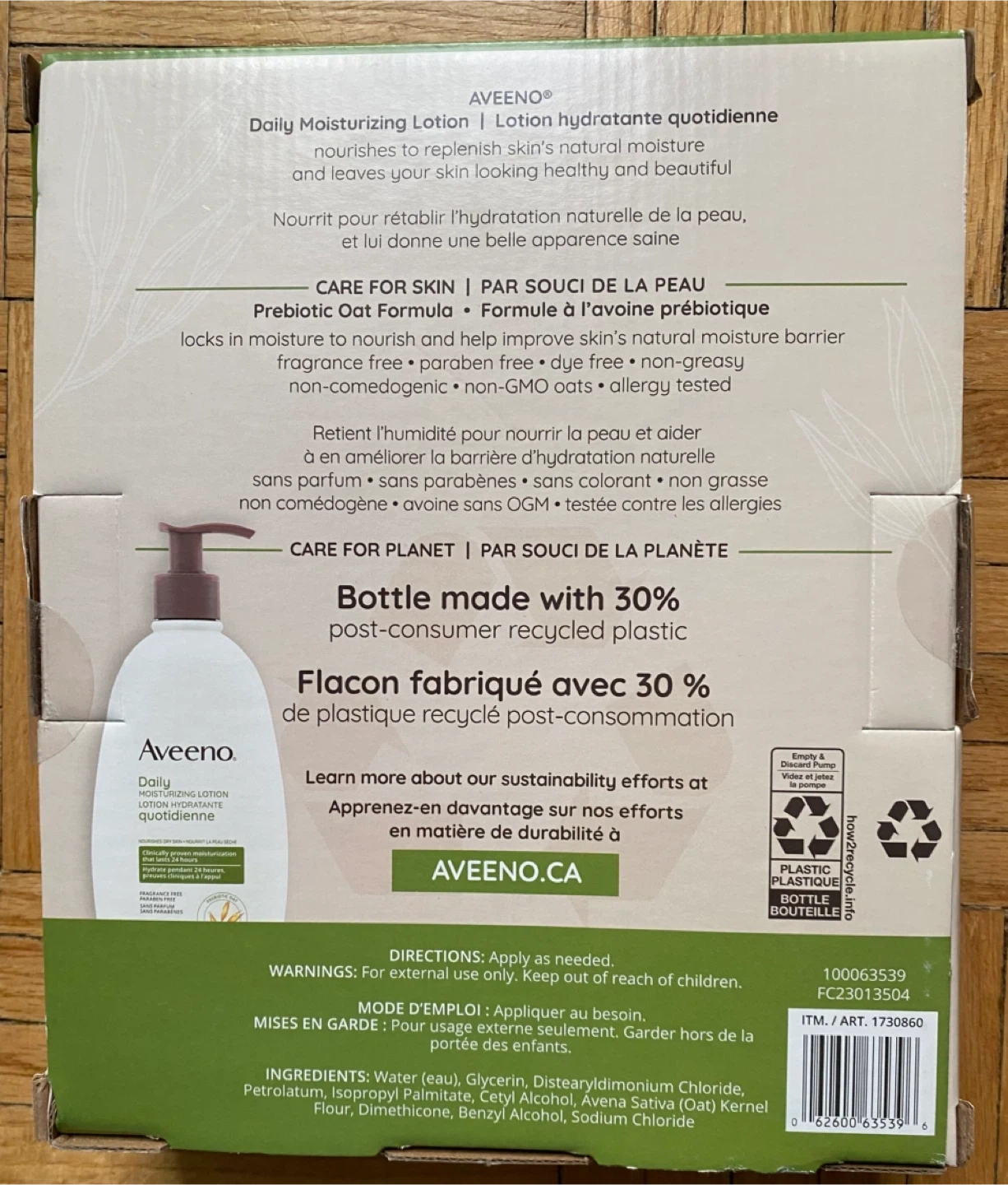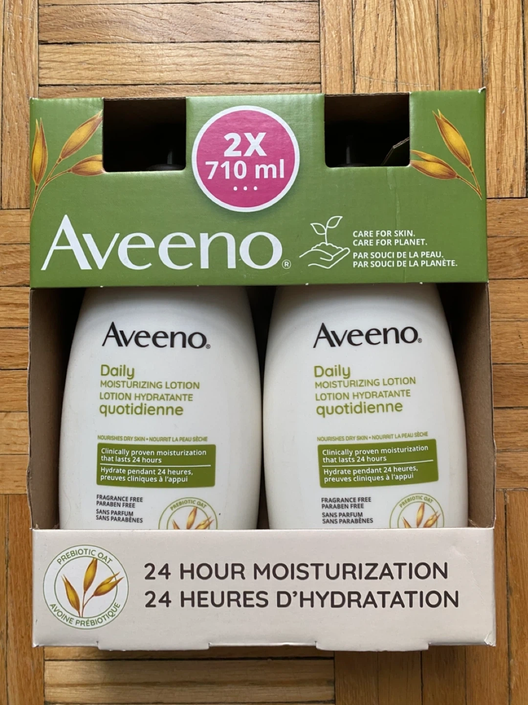 Two bottles of Aveeno Daily Moisturizing Lotion. Nourihes dry skin and replenishes natural moisture. Clinically proven to last 24 hours. Fragrance-free, paraben-free, and non-comedogenic.