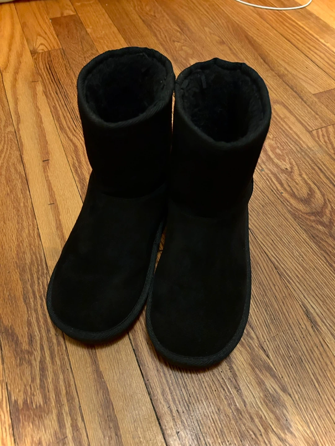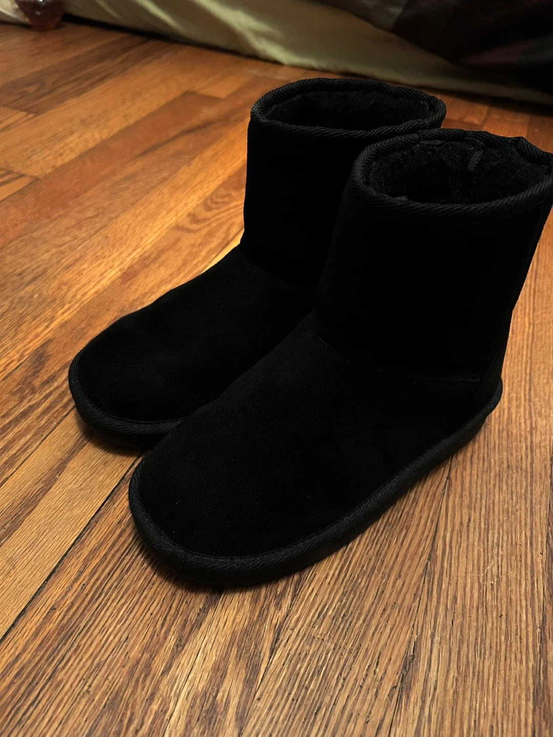 Cozy black Children Place boots with a warm Faux Fur lining. These UGG-style boots are perfect for keeping your feet toasty. They feature a classic ankle height design. Great for casual wear in colder weather! It’s a size 3 in Kids.
