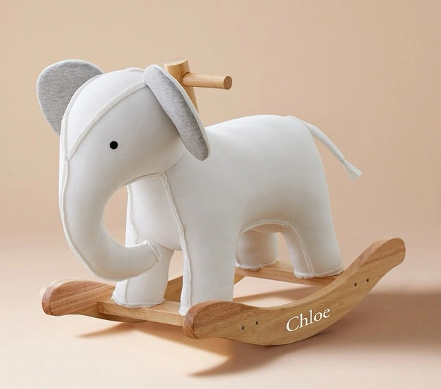 Little ones will love to go on make-believe animal adventures with this soft and huggable elephant rocker. It’s designed with solid wood handles and precision-shaped runners for a smooth, secure, and gentle ride. New Without Tags. Plush is made with 60% fleece and 40% cotton over an iron frame. Runners are crafted of solid rubber wood. Wood handles provide steady grips. Filled with 100% polyester fibers. Recommended for ages 12 months up to 5 years or up to 110 lbs. Spot clean with a soft, damp cloth. Blot to remove excess water. Air dry. Dust base with a soft, dry cloth. Overall (including runners): 13.75" wide x 22.5" long x 26" high. Rocker rails: 25.5" long x 2.5" high. Seat: 8" wide x 10" long x 10.5" high. Handle: 1" diameter, 3.5" long.