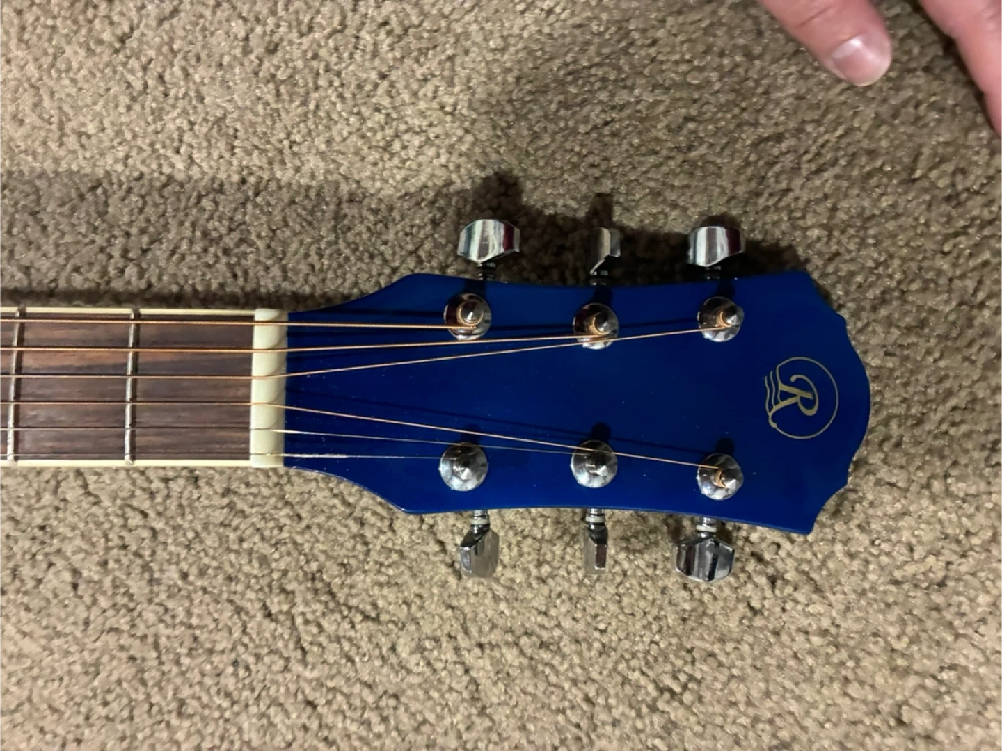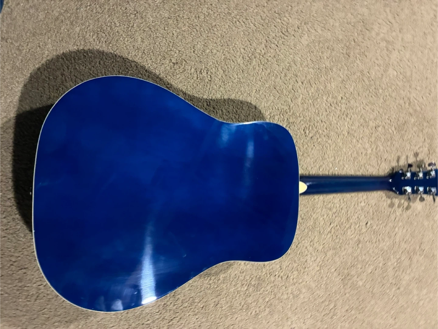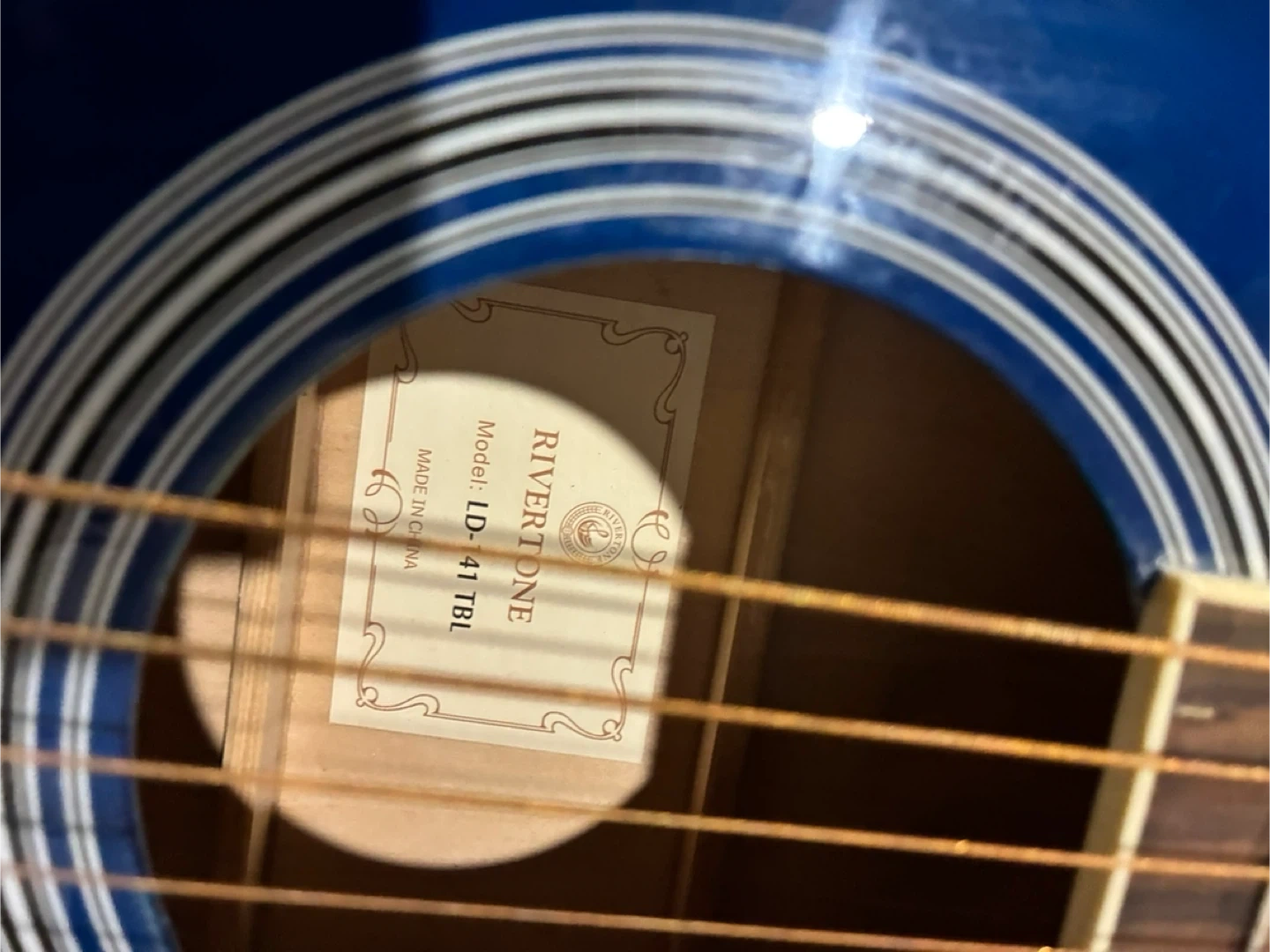 This is a blue Rivertone acoustic guitar, model LD-41TBL. It's an acoustic guitar with steel strings. It's great for learning to play!