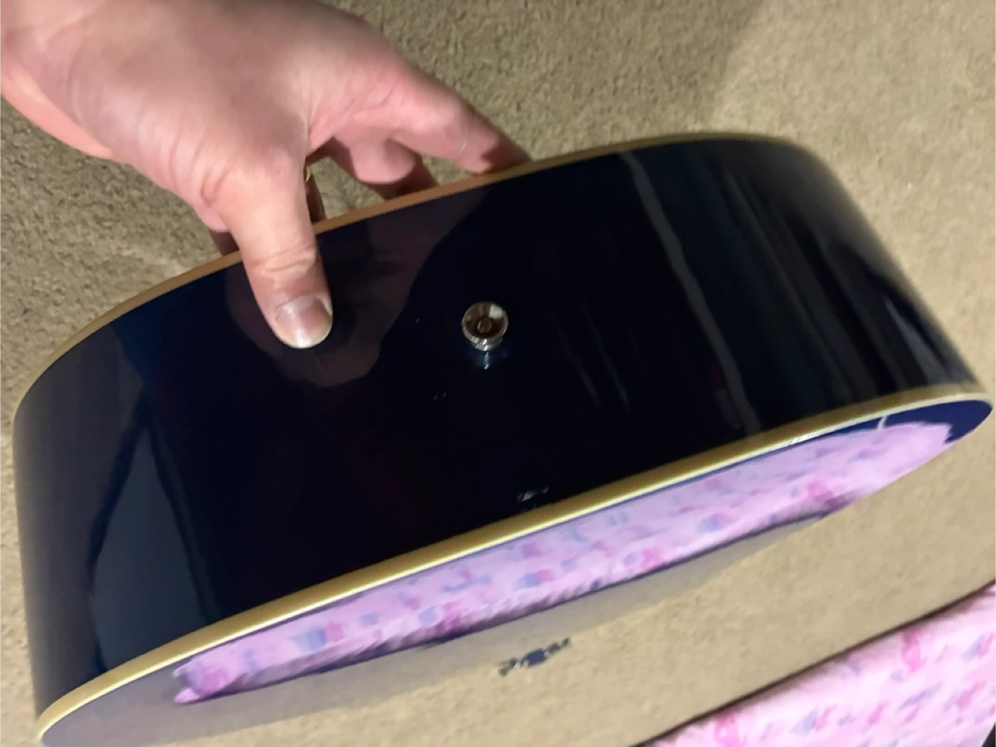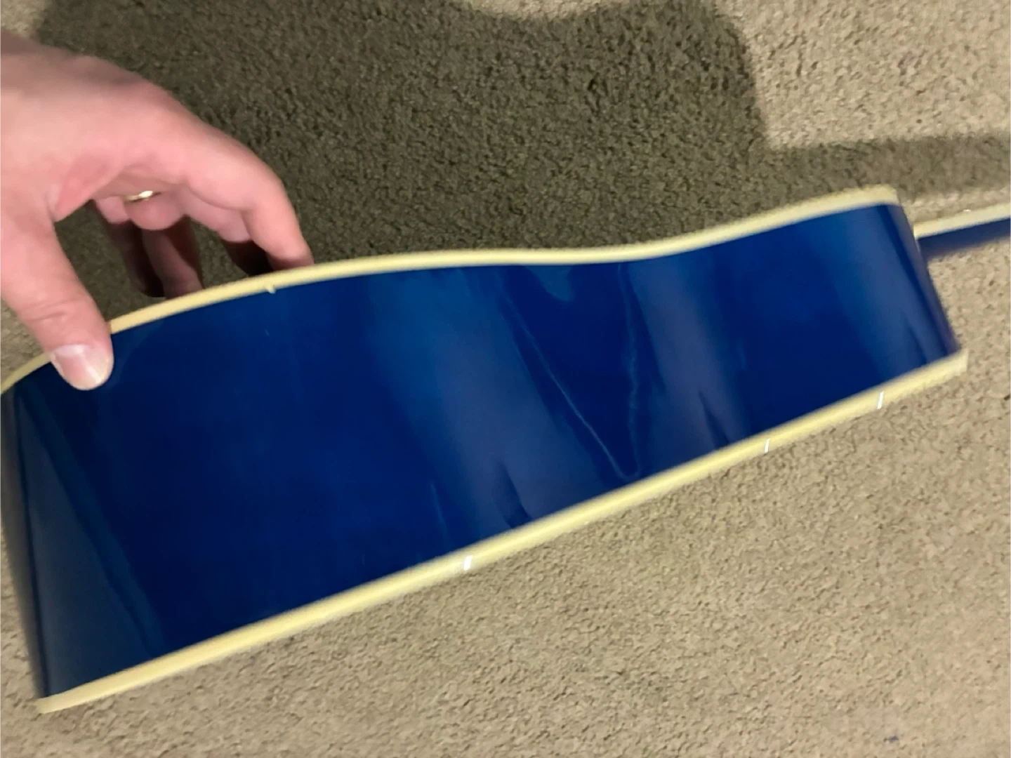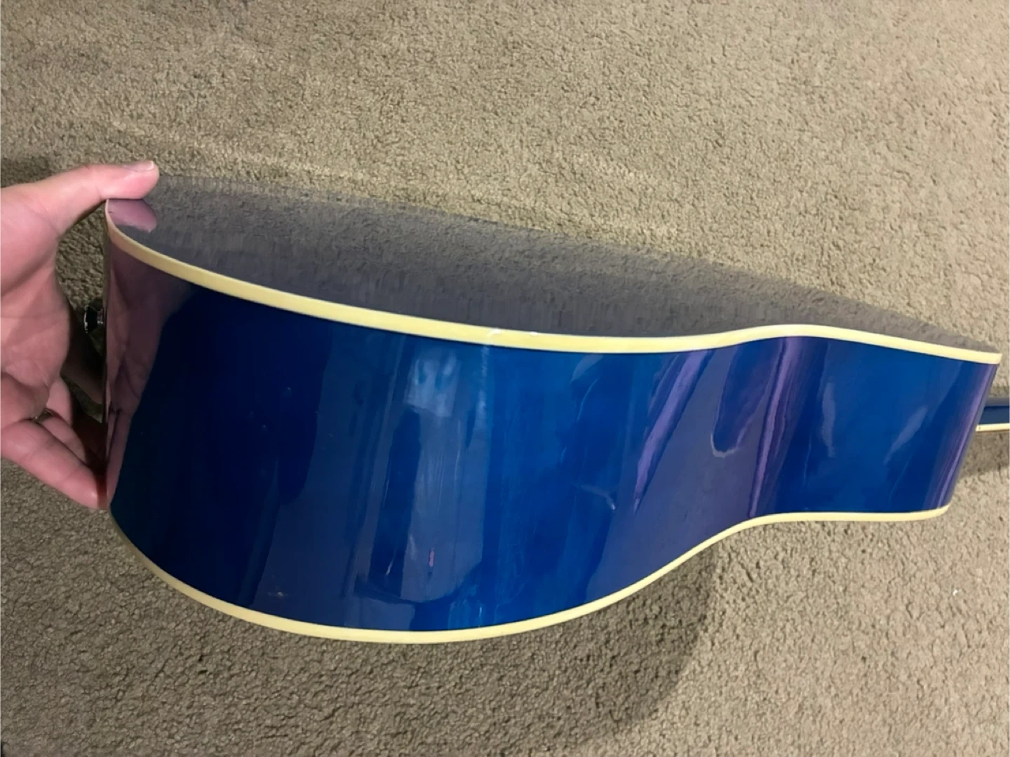 This is a blue Rivertone acoustic guitar, model LD-41TBL. It's an acoustic guitar with steel strings. It's great for learning to play!