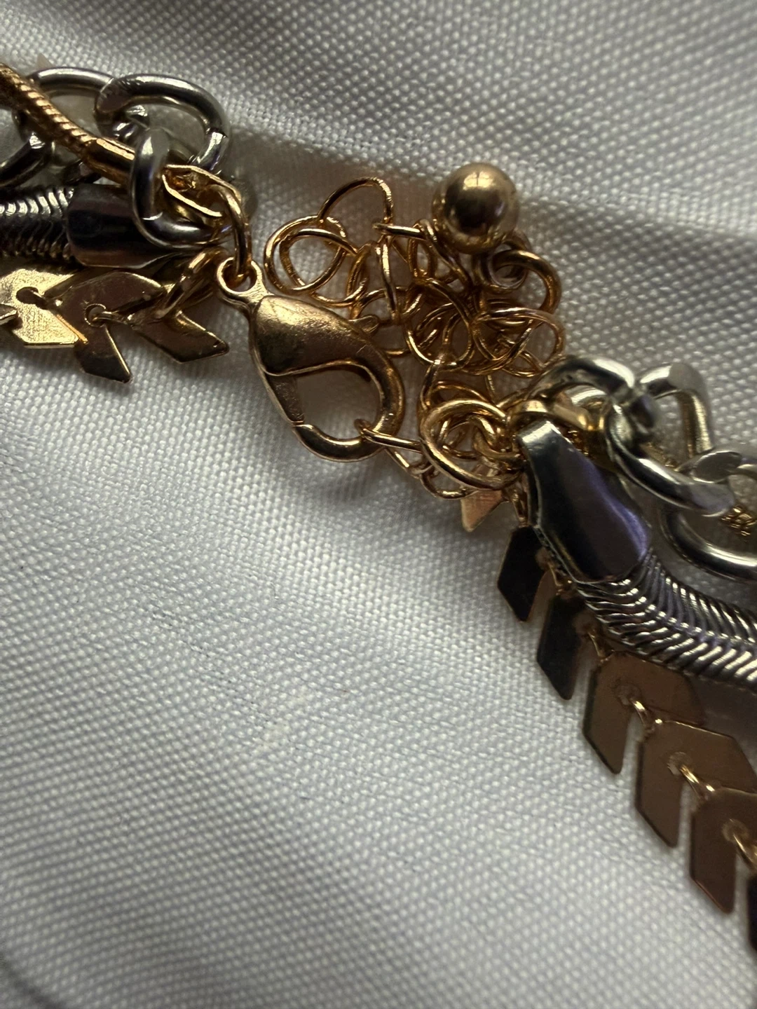 This vintage layered necklace features multiple chains in gold and silver tones. It includes various chain styles like snake chain and curb chain. The necklace has a lobster clasp closure.(good fantasy jewerly)(A gift I get in 2012 year)