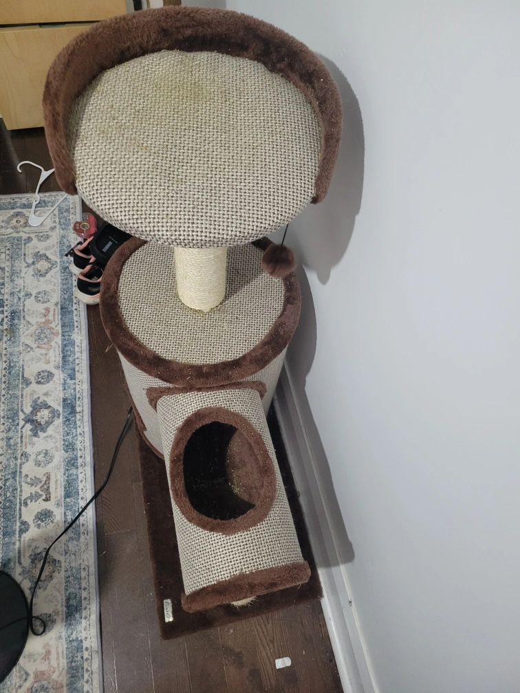This cat tree is perfect for your feline friend! It features a scratching post, a condo for hiding, and multiple levels for climbing and playing. The neutral colours will blend in with any home decor. Your cat will love it!