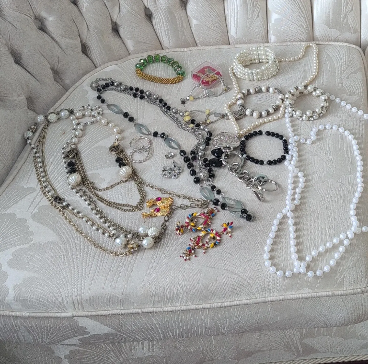 A charming assortment of costume jewellery, including necklaces, bracelets, and earrings. Features pearls, beads, and decorative charms. Perfect for adding a touch of flair to any outfit!