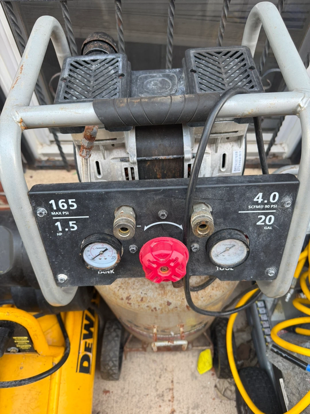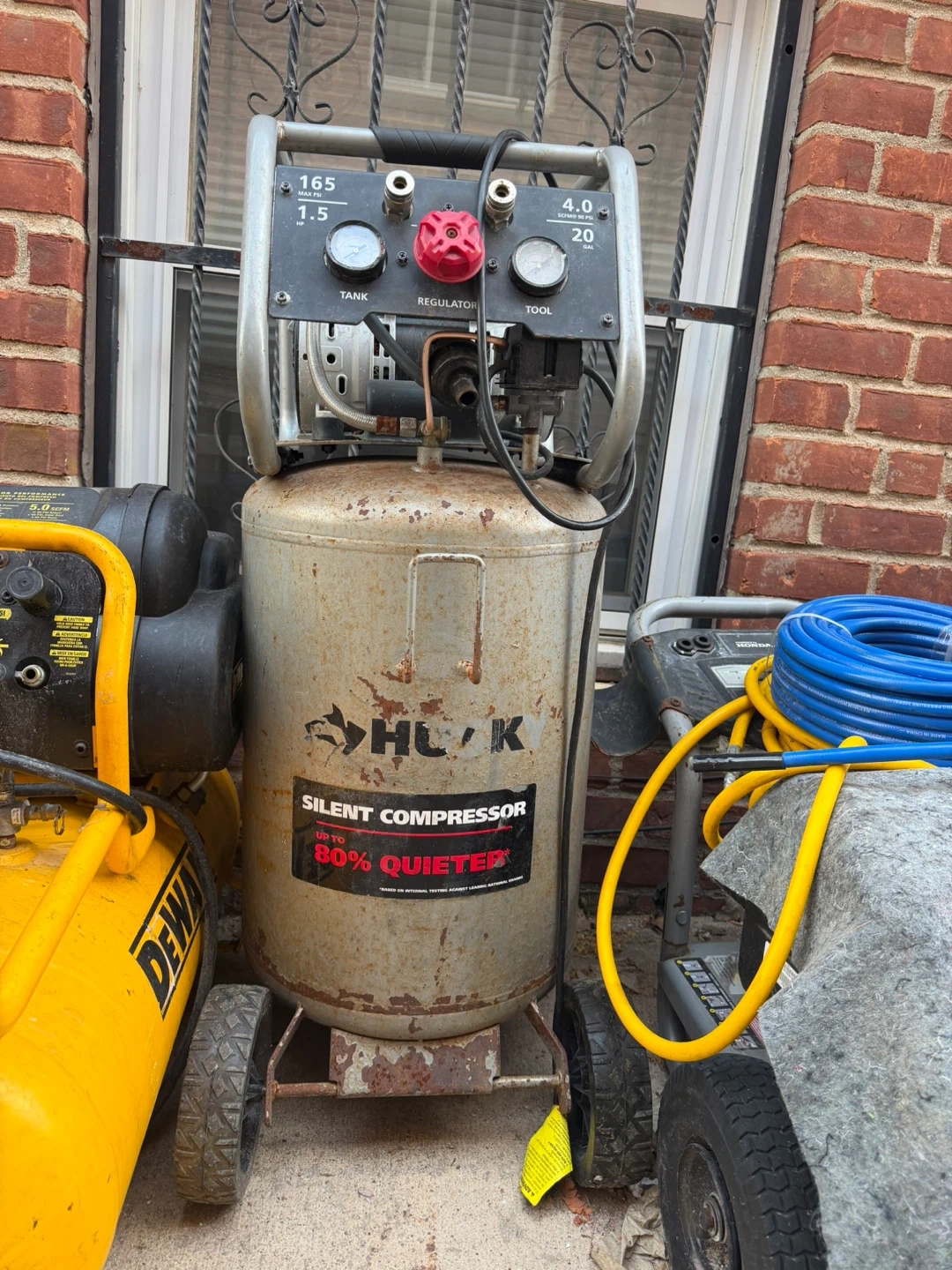 Husky silent air compressor. 1.5 HP motor. 20 gallon tank. Max PSI 165. SCFM @ 90 PSI is 4.0. It's 80% quieter than standard compressors. Come with a free hose