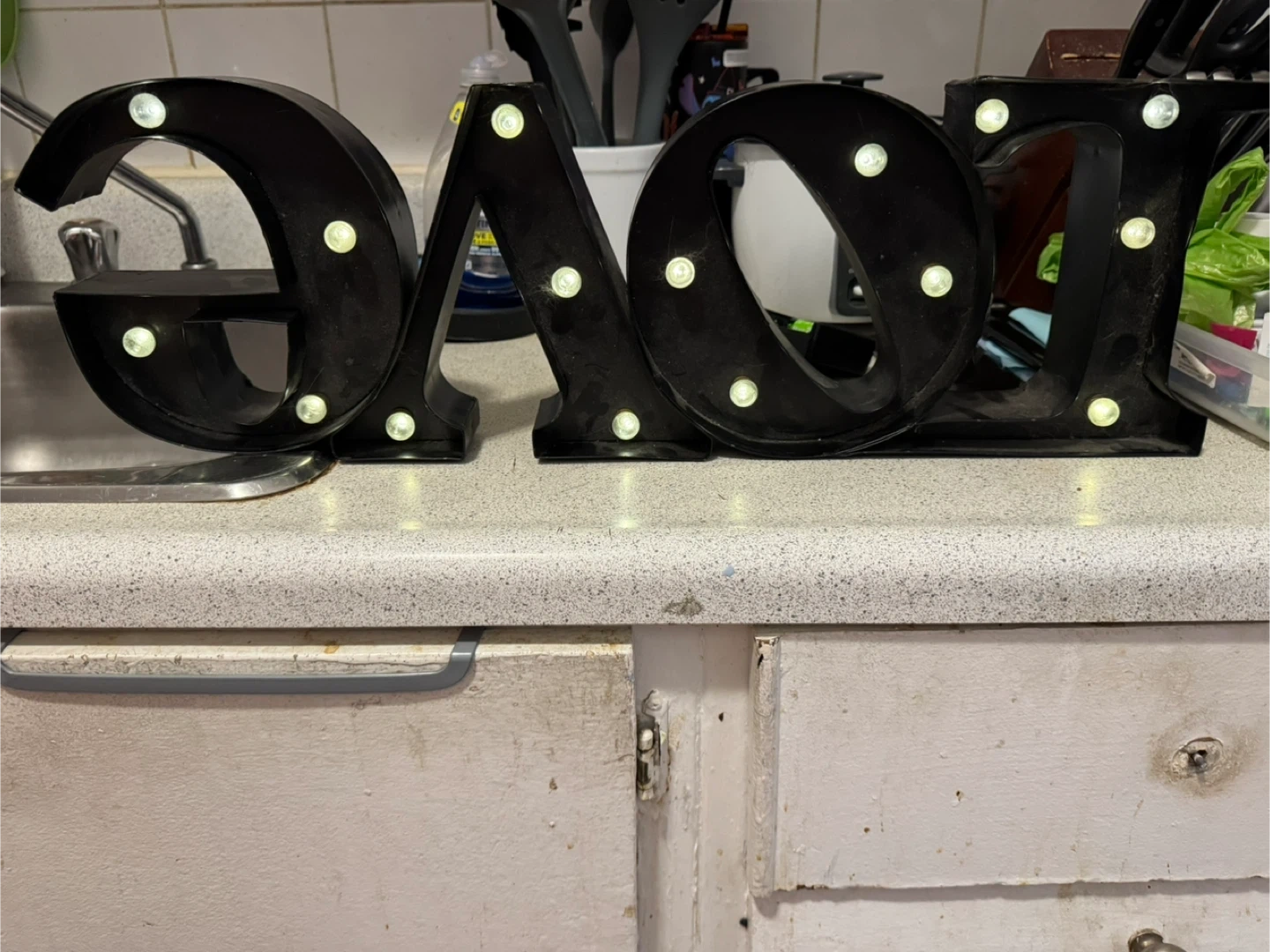 This black marquee sign spells out "LOVE" with embedded lights. It's a great way to add some ambiance to a room or for a special occasion! The individual letters create a decorative statement piece.