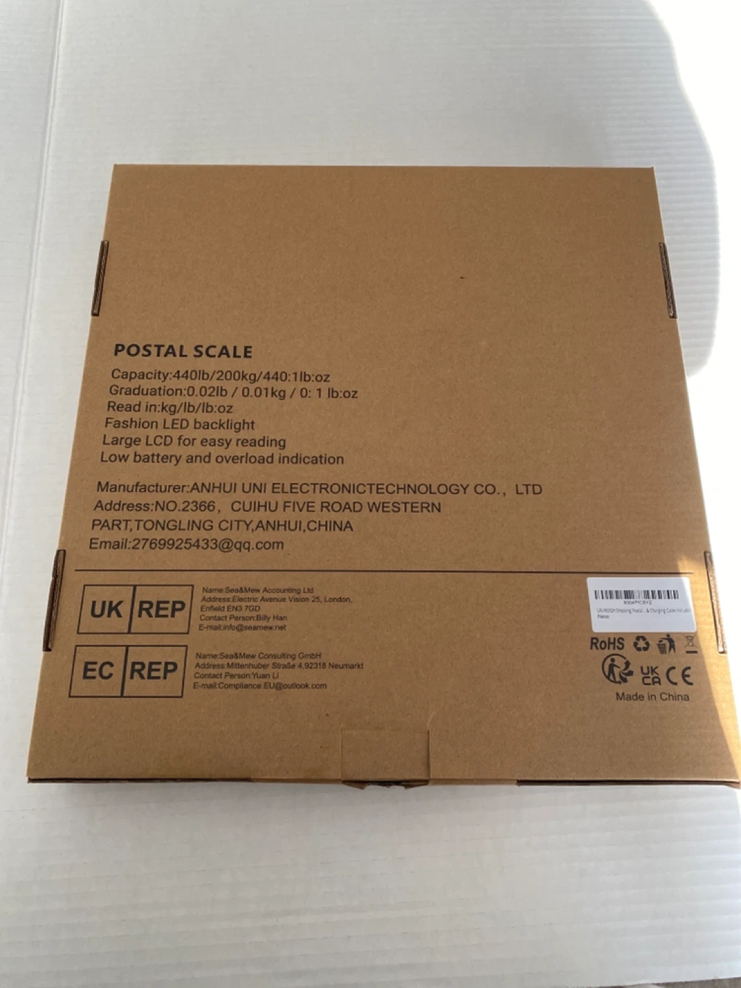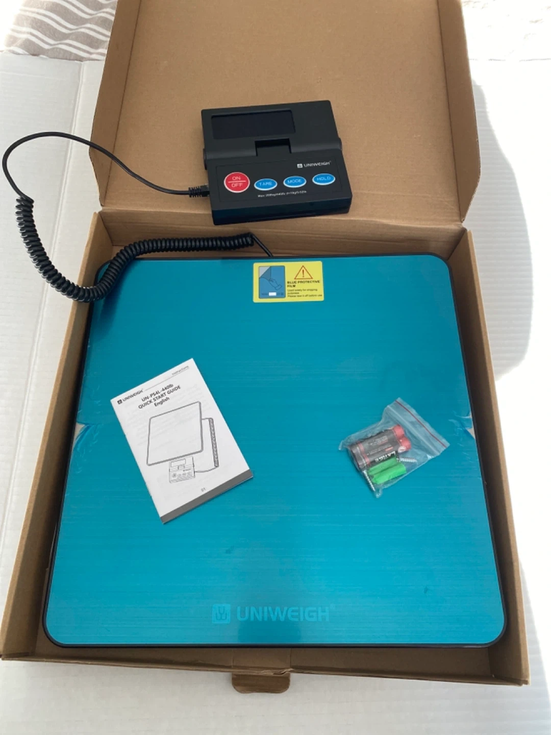 This is a UNIWEIGH postal scale with a capacity of 440lb. It features a fashion LED backlight and a large LCD for easy reading. Batteries are included.