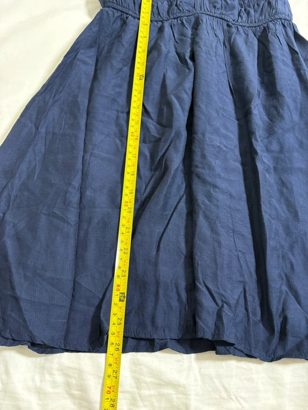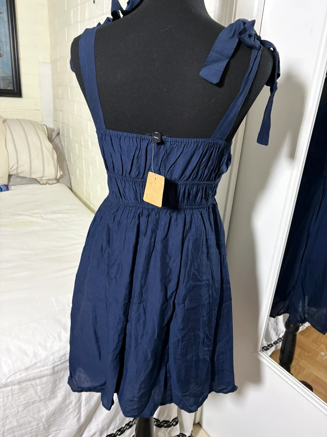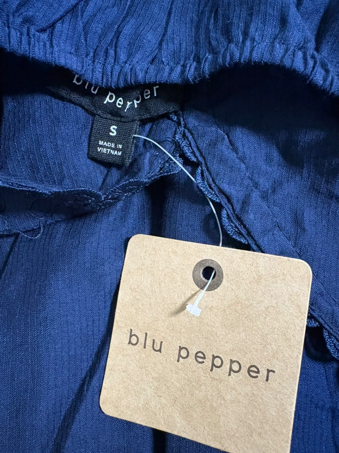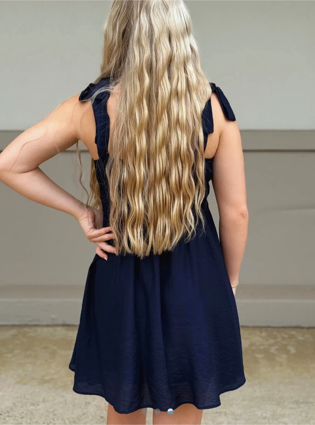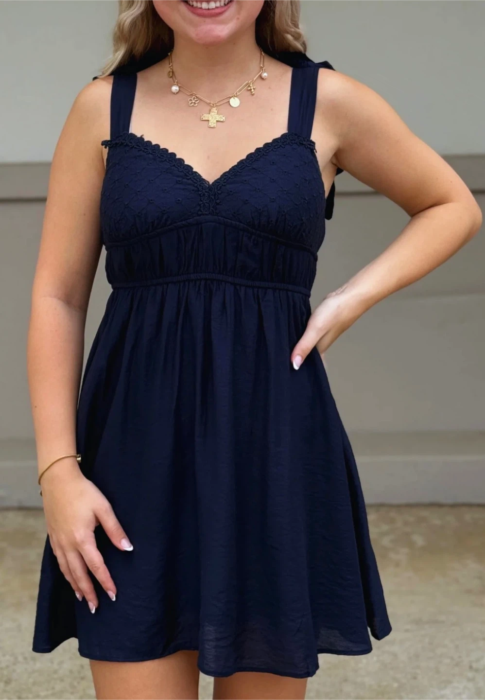 This navy blue dress from Blu Pepper features a flattering empire waist and sweet eyelet detailing on the bodice. It has adjustable tie straps for a perfect fit. It's a comfortable and stylish option for warmer weather!