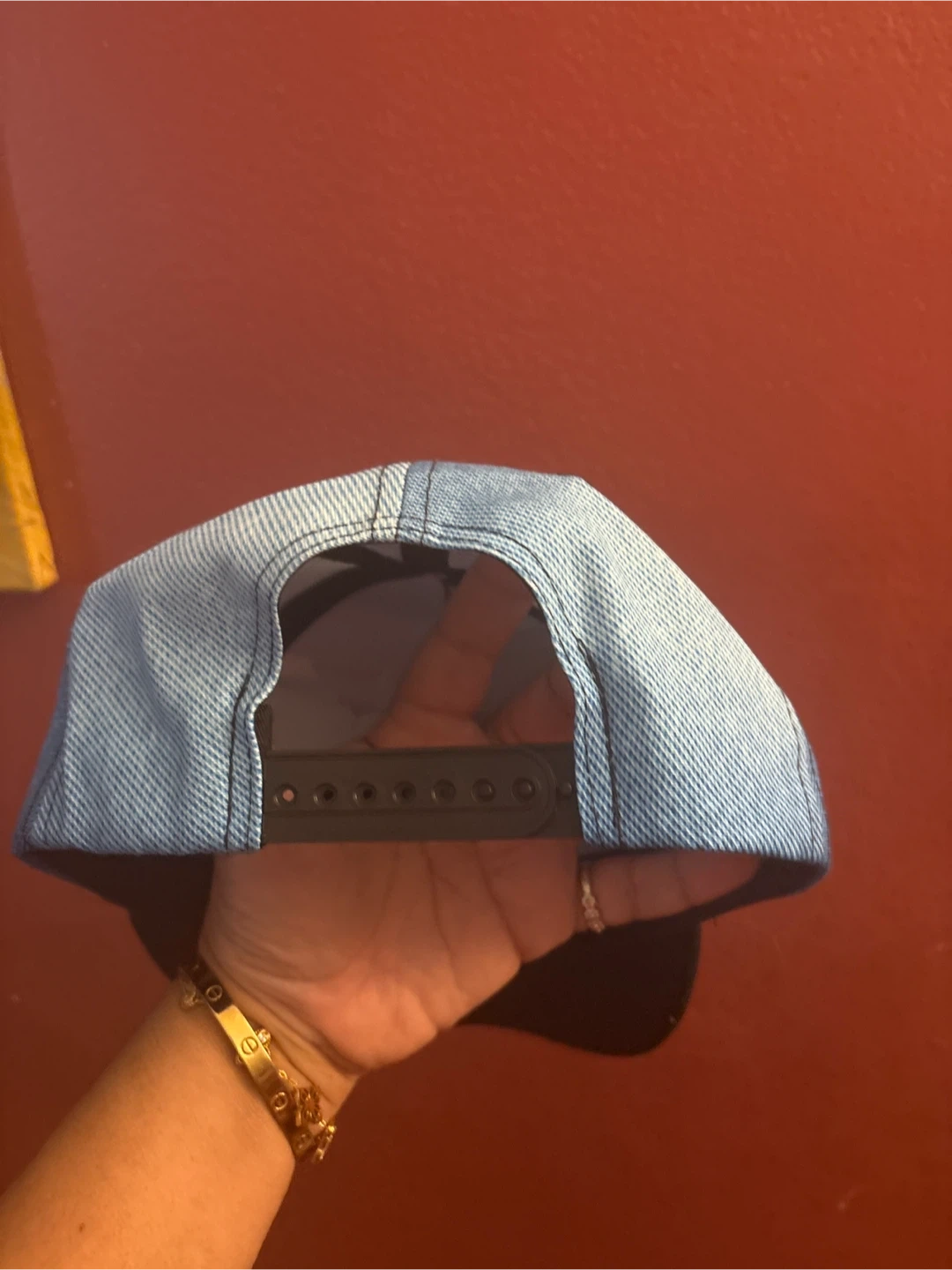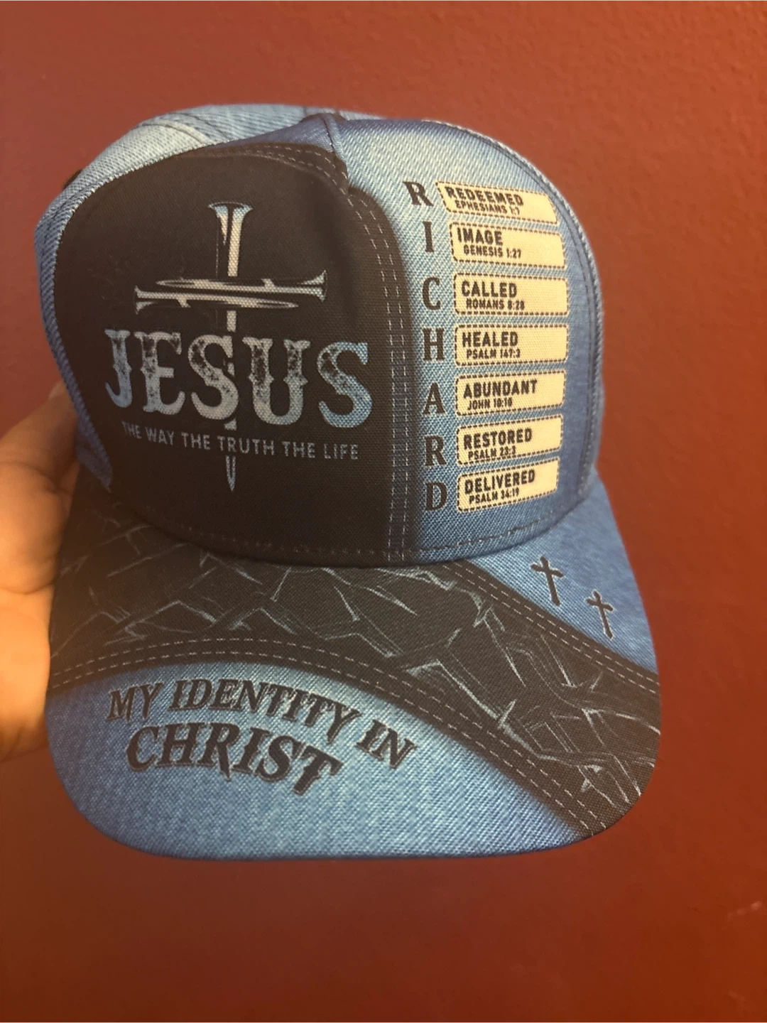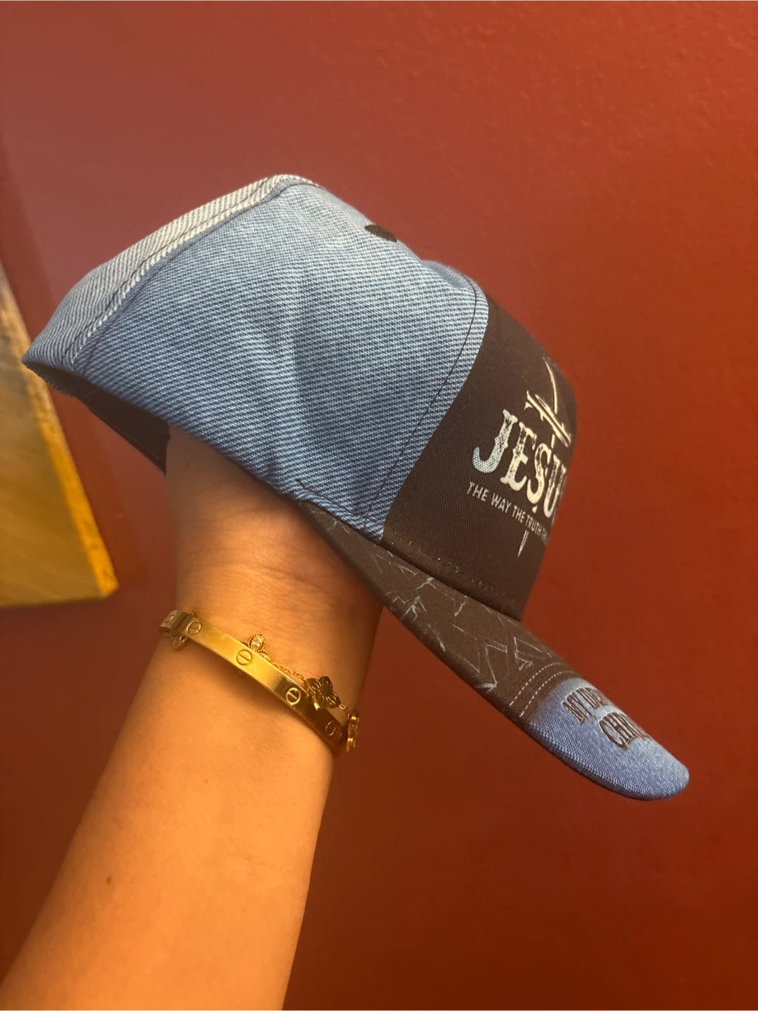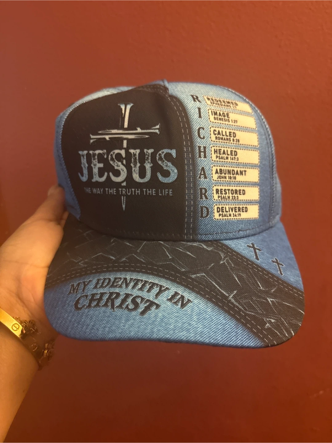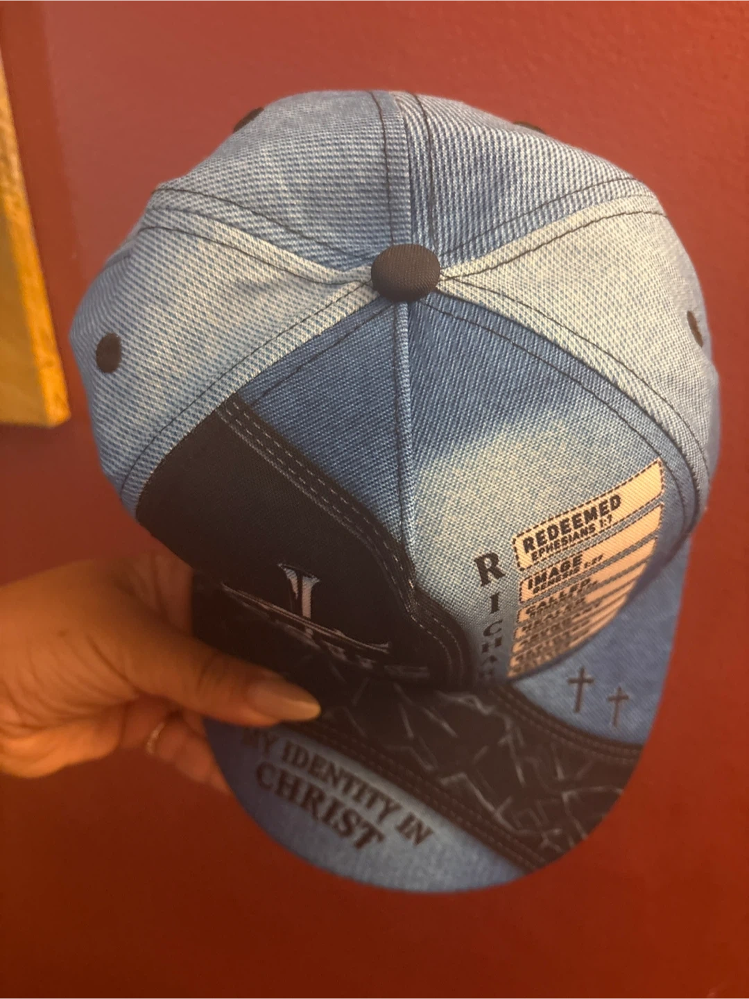 1000+Stylish baseball cap with "Jesus the way the truth the life" embroidered on the front Features "My Identity in Christ" along the brim and crosses all over Unique design with a light blue denim look and black accents Adjustable strap for a comfortable fit