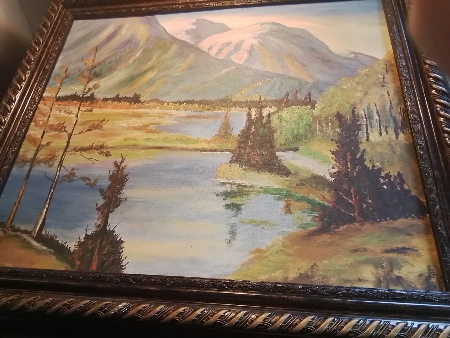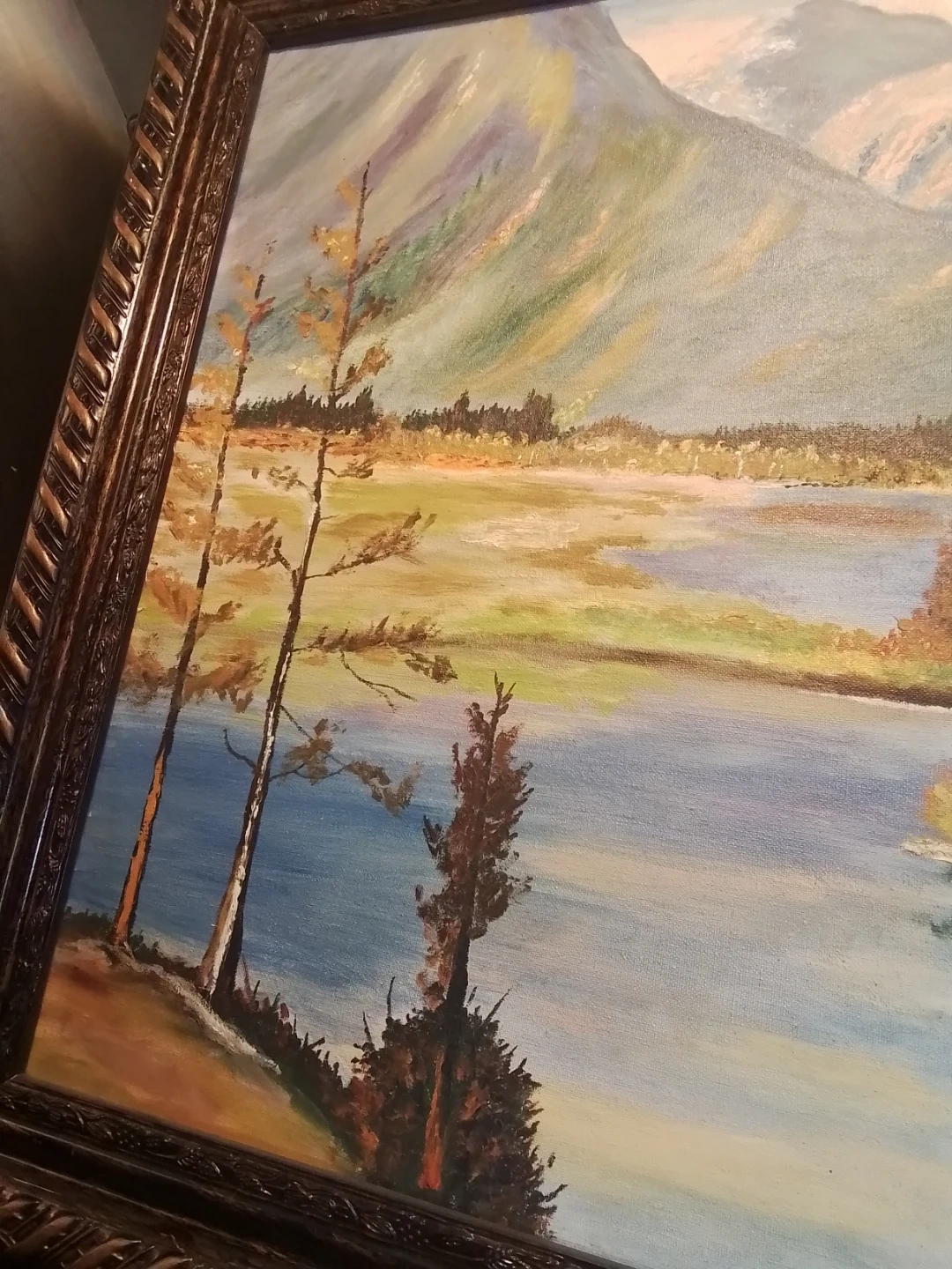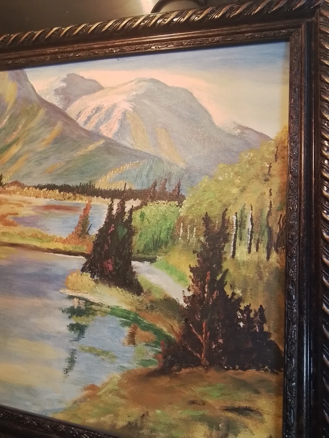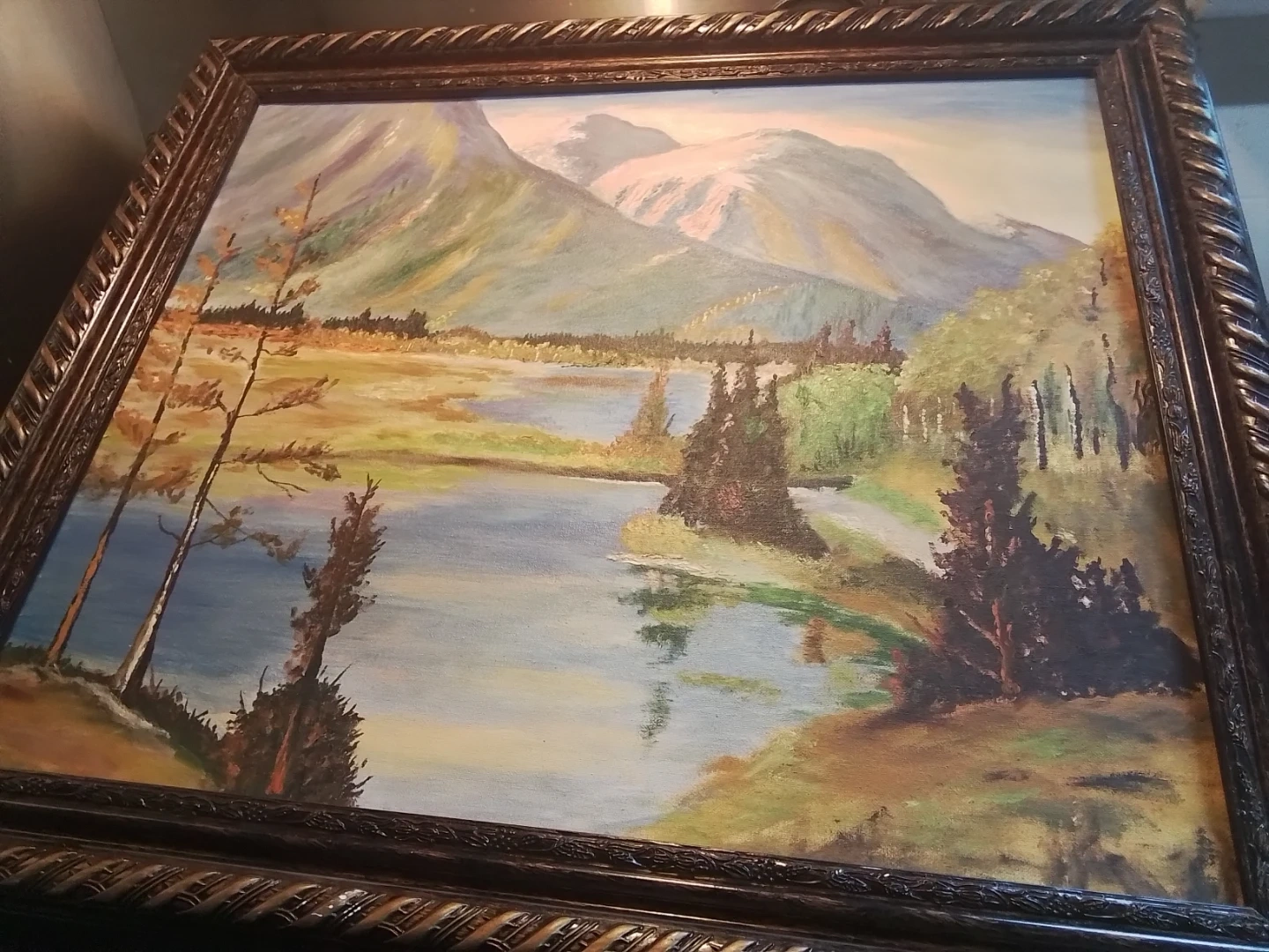 This is a pre-owned landscape oil painting with a detailed mountain and lake scene, framed in a decorative 28x24 inch frame. The painting captures a serene natural landscape, perfect for adding a touch of elegance to any room.