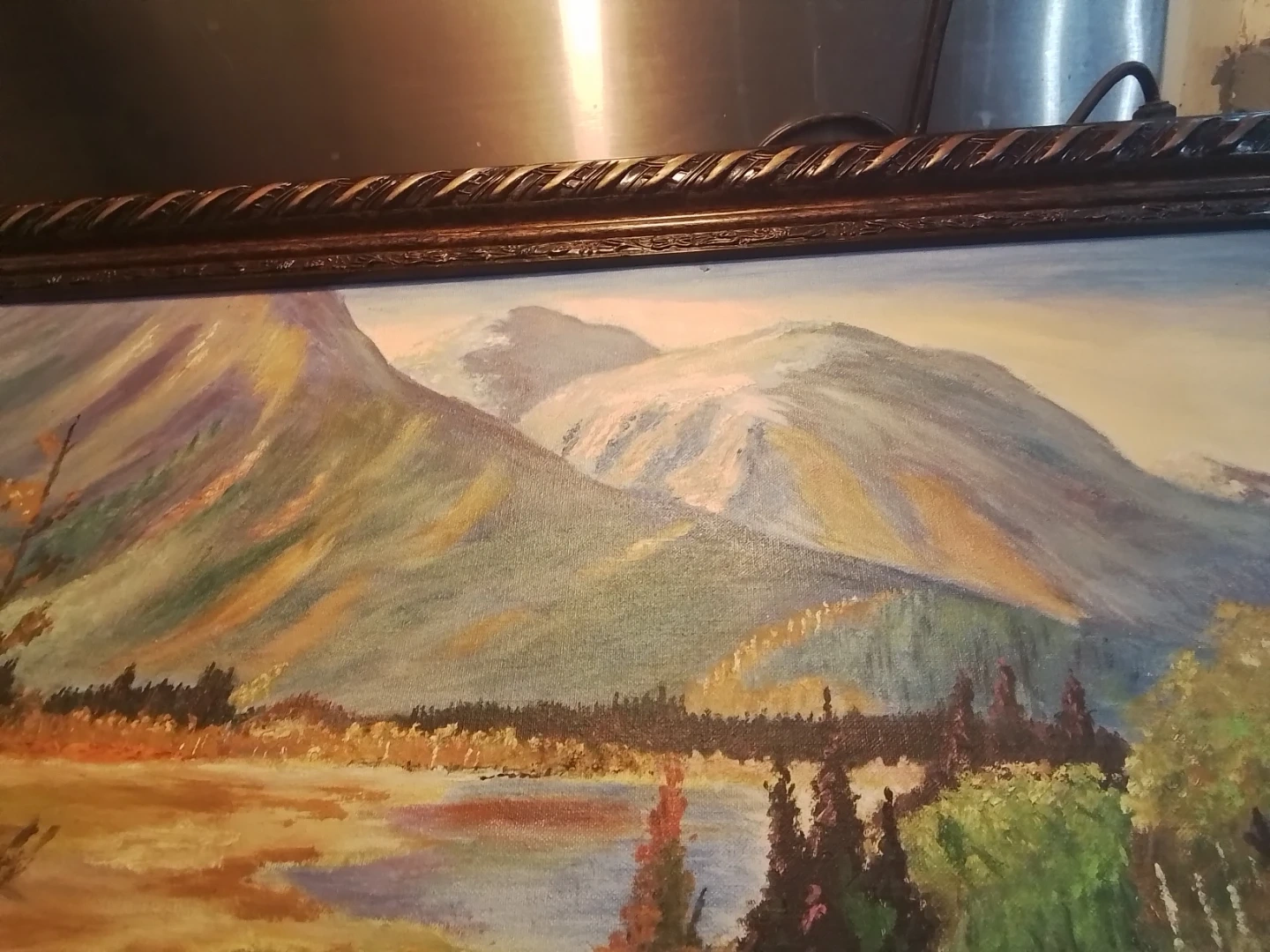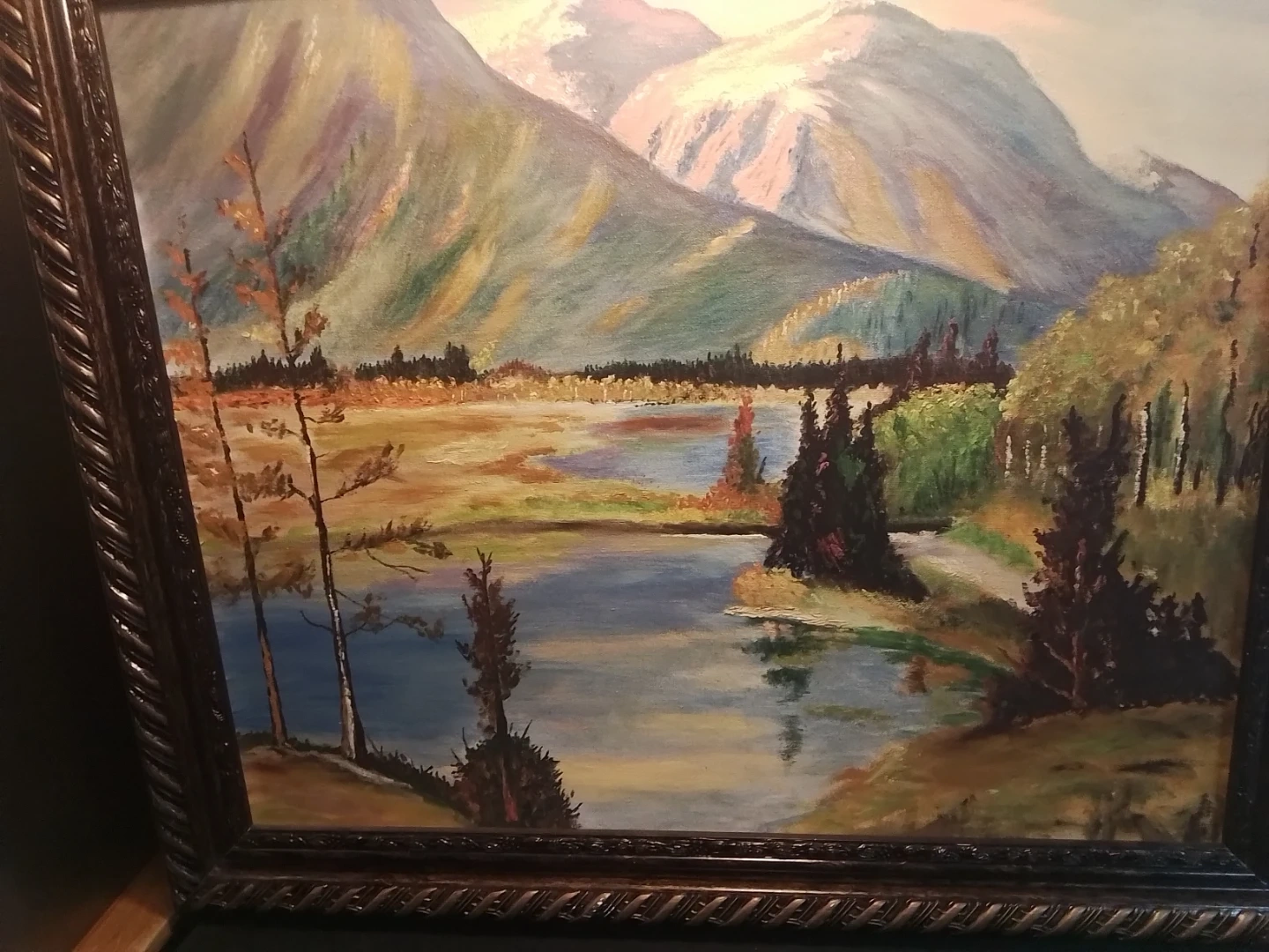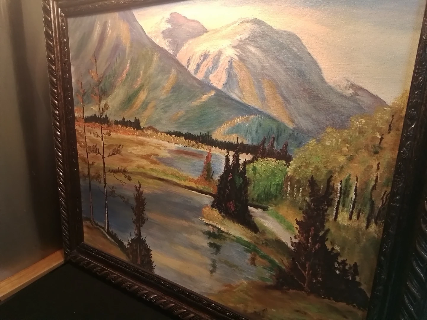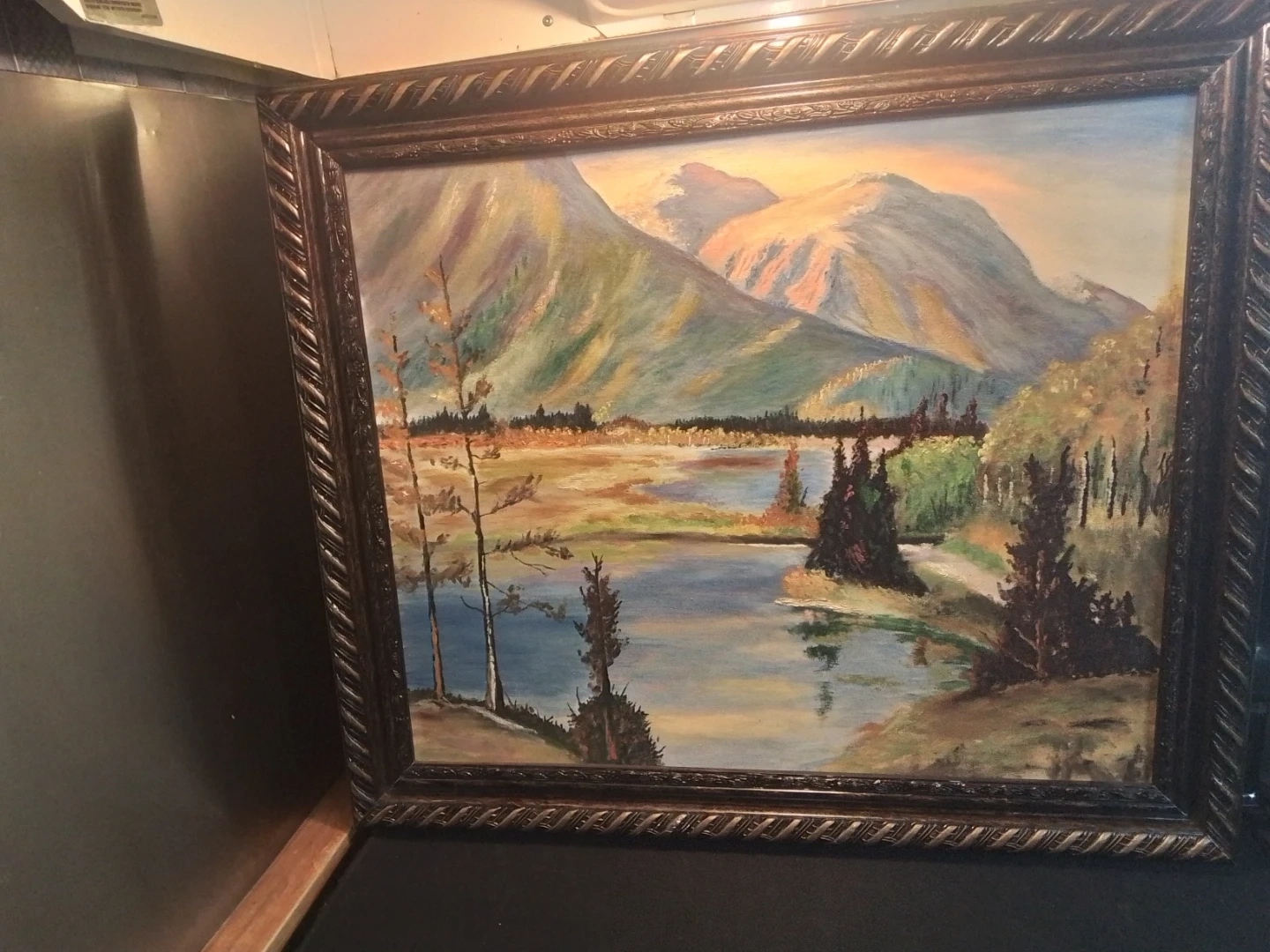 This is a pre-owned landscape oil painting with a detailed mountain and lake scene, framed in a decorative 28x24 inch frame. The painting captures a serene natural landscape, perfect for adding a touch of elegance to any room.