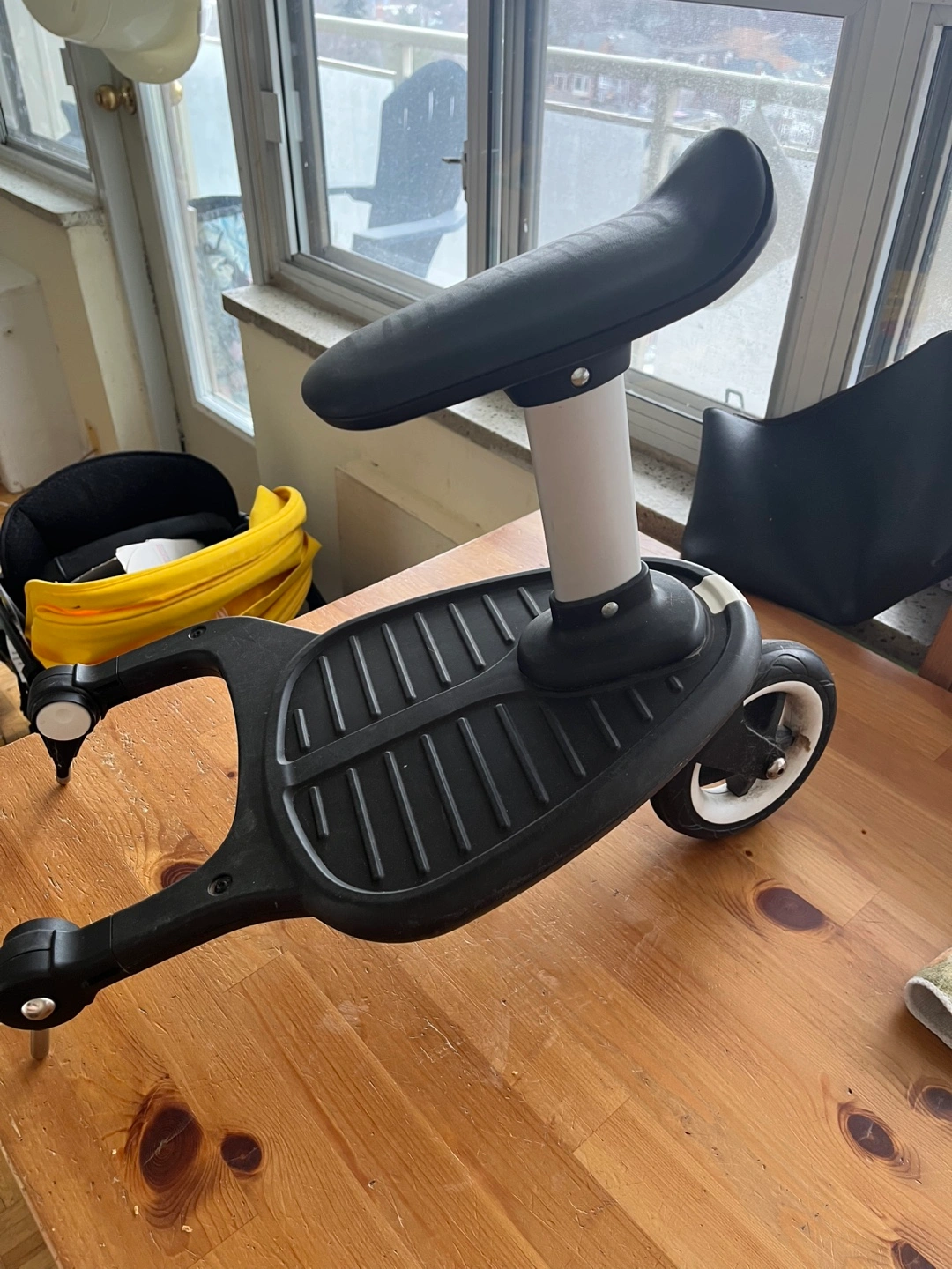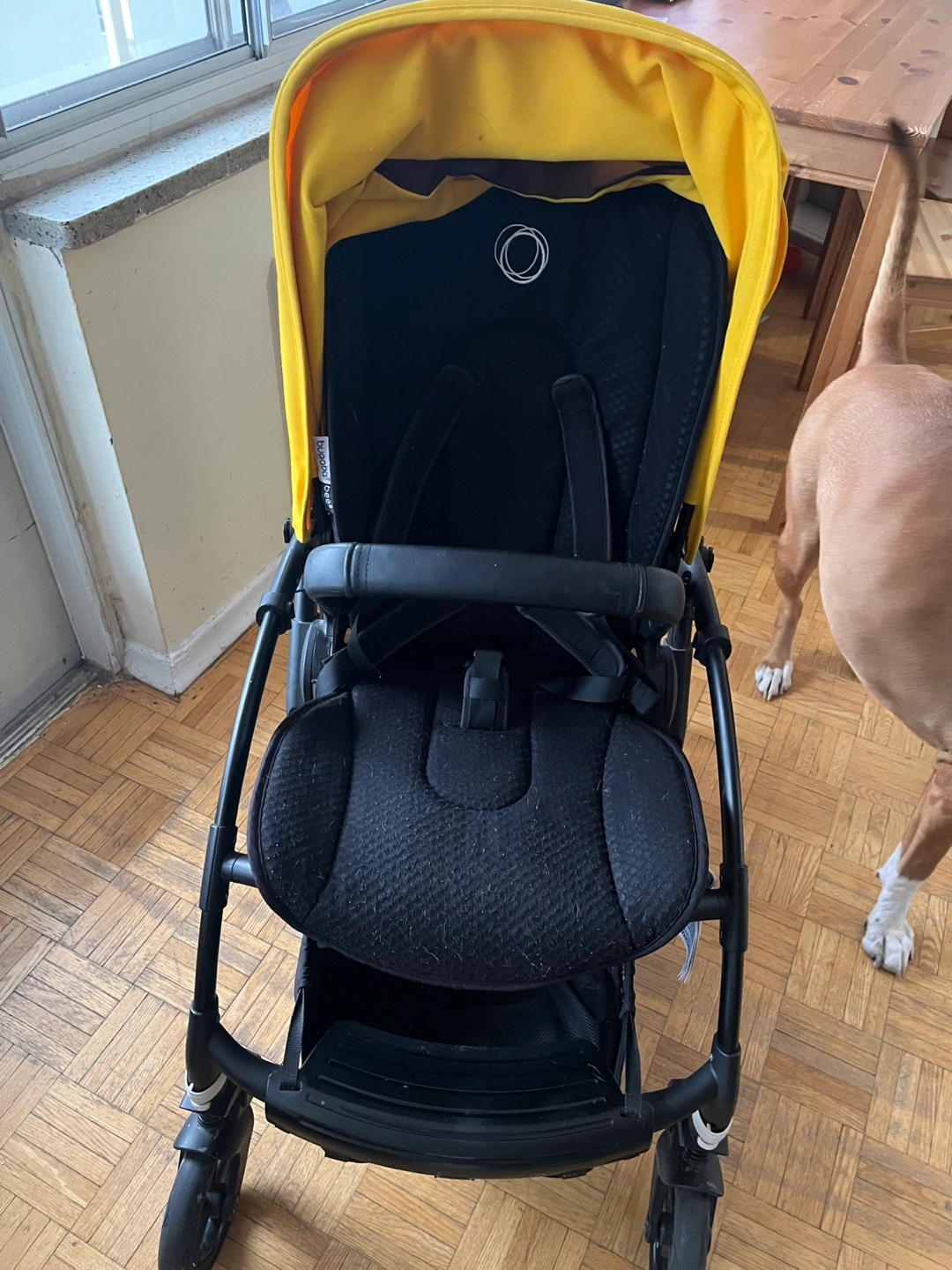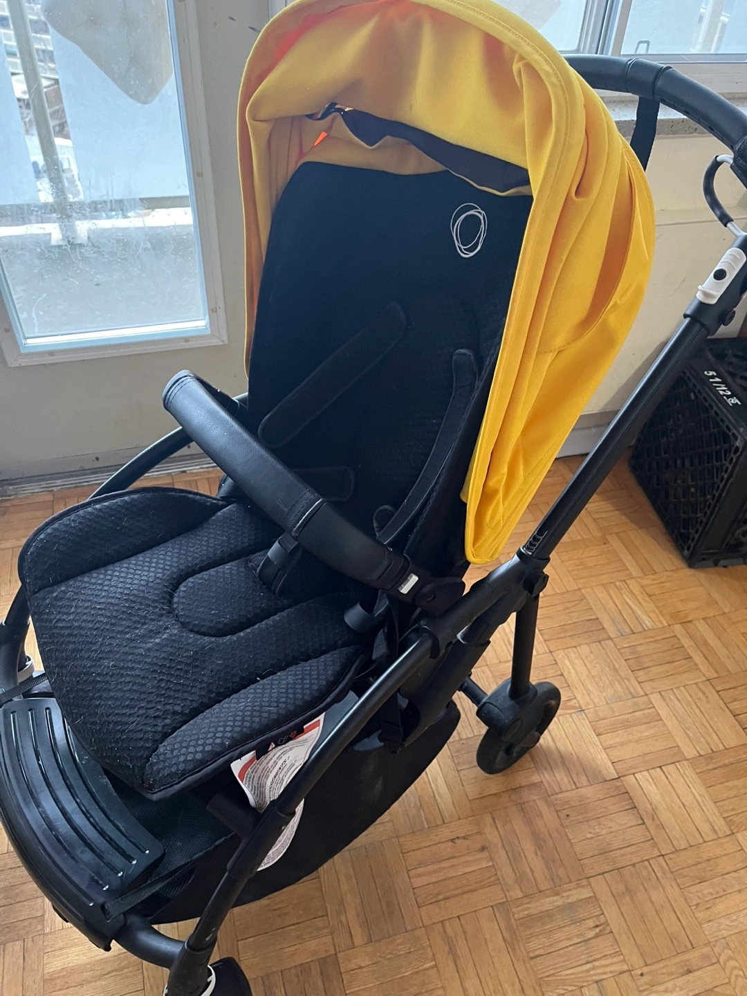 Yellow Bugaboo Bee 6 stroller. Includes Maxi-Cosi car seat adapters, comfort rider board, drink holder and extra seat liner in black. Lightweight and easy to manoeuvre.